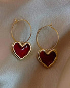 Add a touch of romance to your style with our Deep Red Heart Drop Hoop Earrings. Featuring glossy red heart pendants on sleek gold hoops, these earrings exude elegance and charm. Crafted from anti-tarnish stainless steel with PVD gold plating, they offer durability and long-lasting shine. Perfect for date nights, special occasions, or everyday glam.