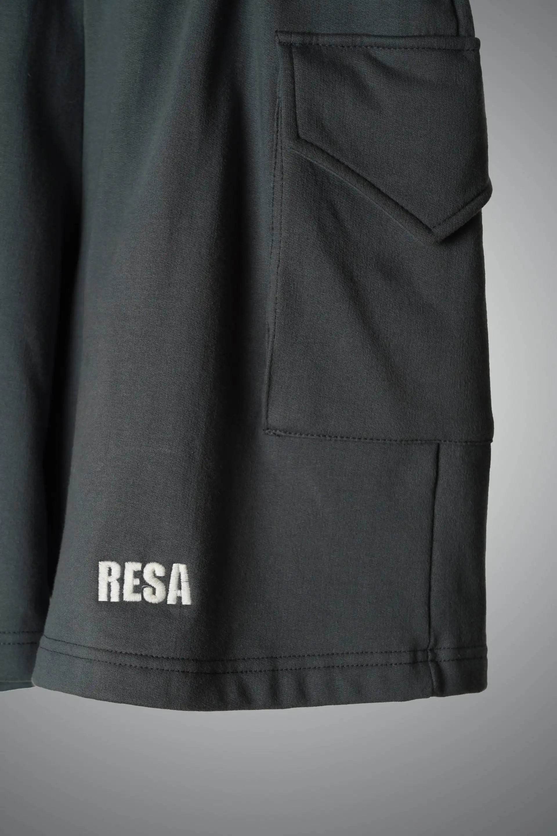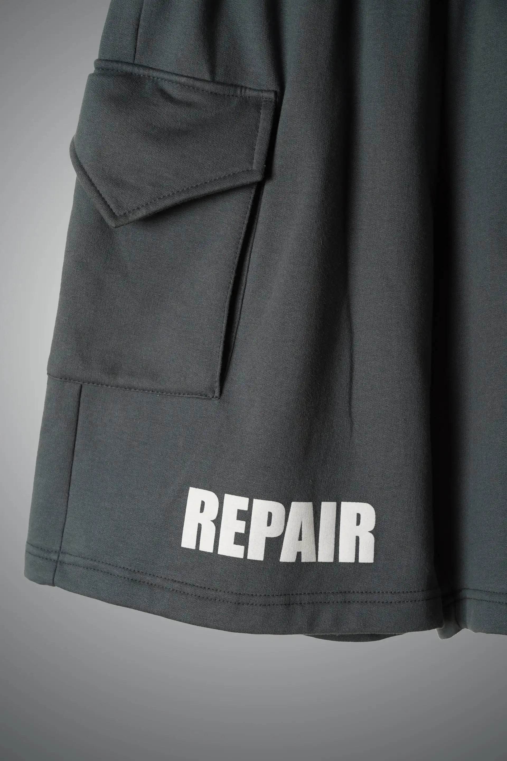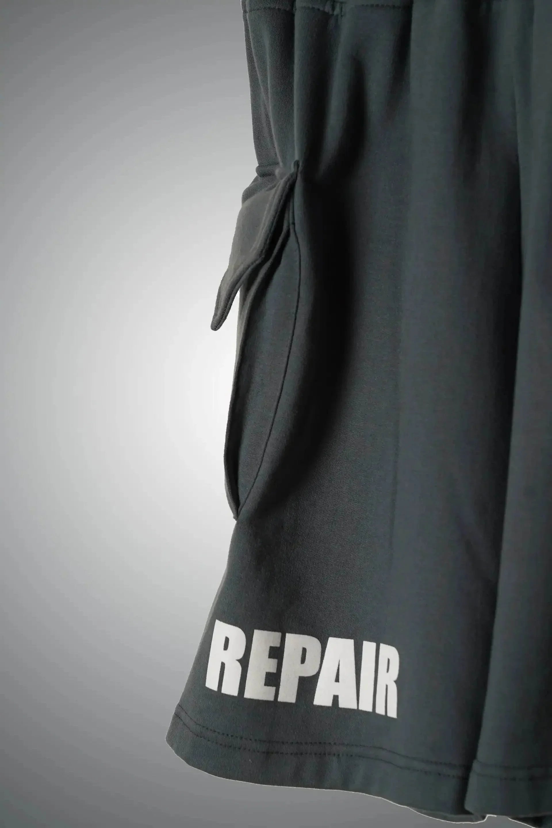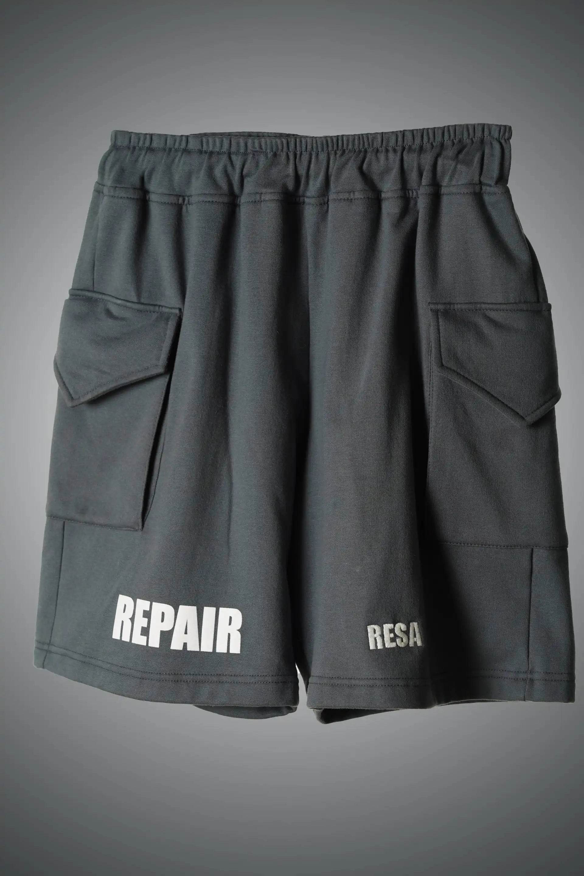 The shorts have a REPAIR print on the left and an embroidered RESA on the right in white.