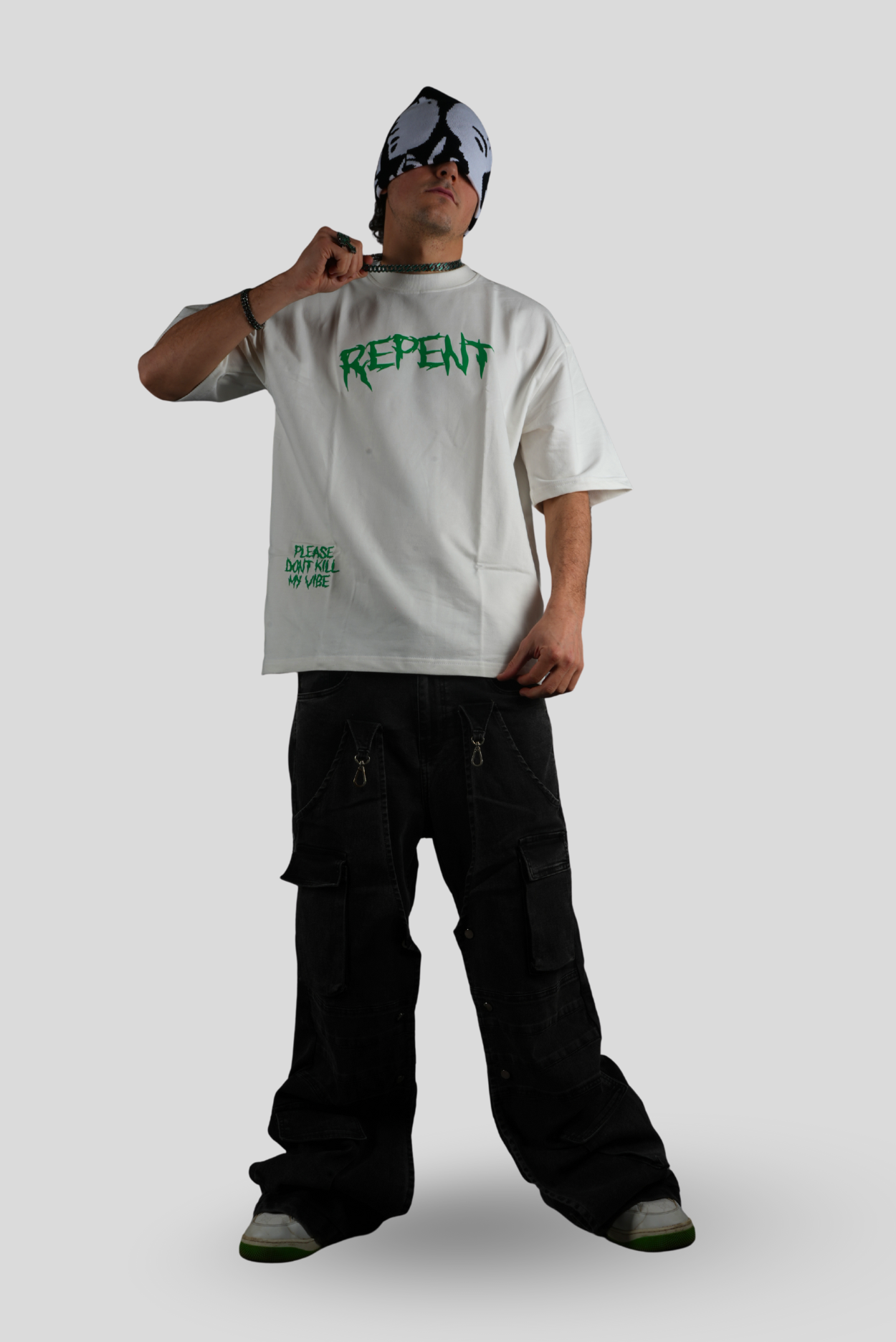 Unapologetically loud. Unfiltered attitude. The Repent Tee by MANACA throws shade at conformity with an anarchic mash of graffiti-inspired typography and bold graphic chaos. With “REPENT” blazing across the front in neon green and a rebellious collage of icons, stars, and raw urban imagery on the back, this tee doesn’t just speak — it screams. Finished with a lower hem “PLEASE DON’T KILL MY VIBE” statement hit, it captures the essence of culture clash, self-expression, and defiance.