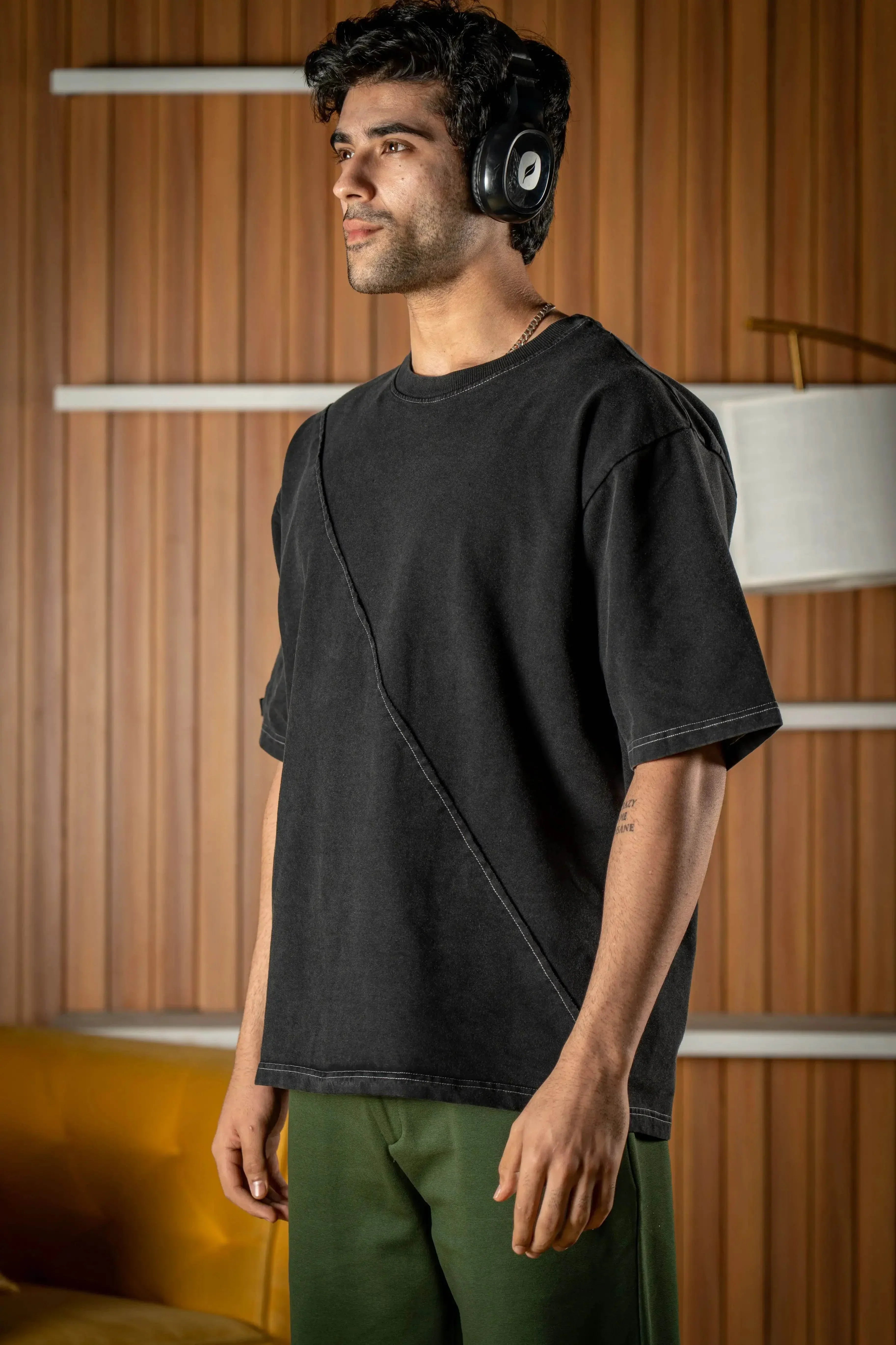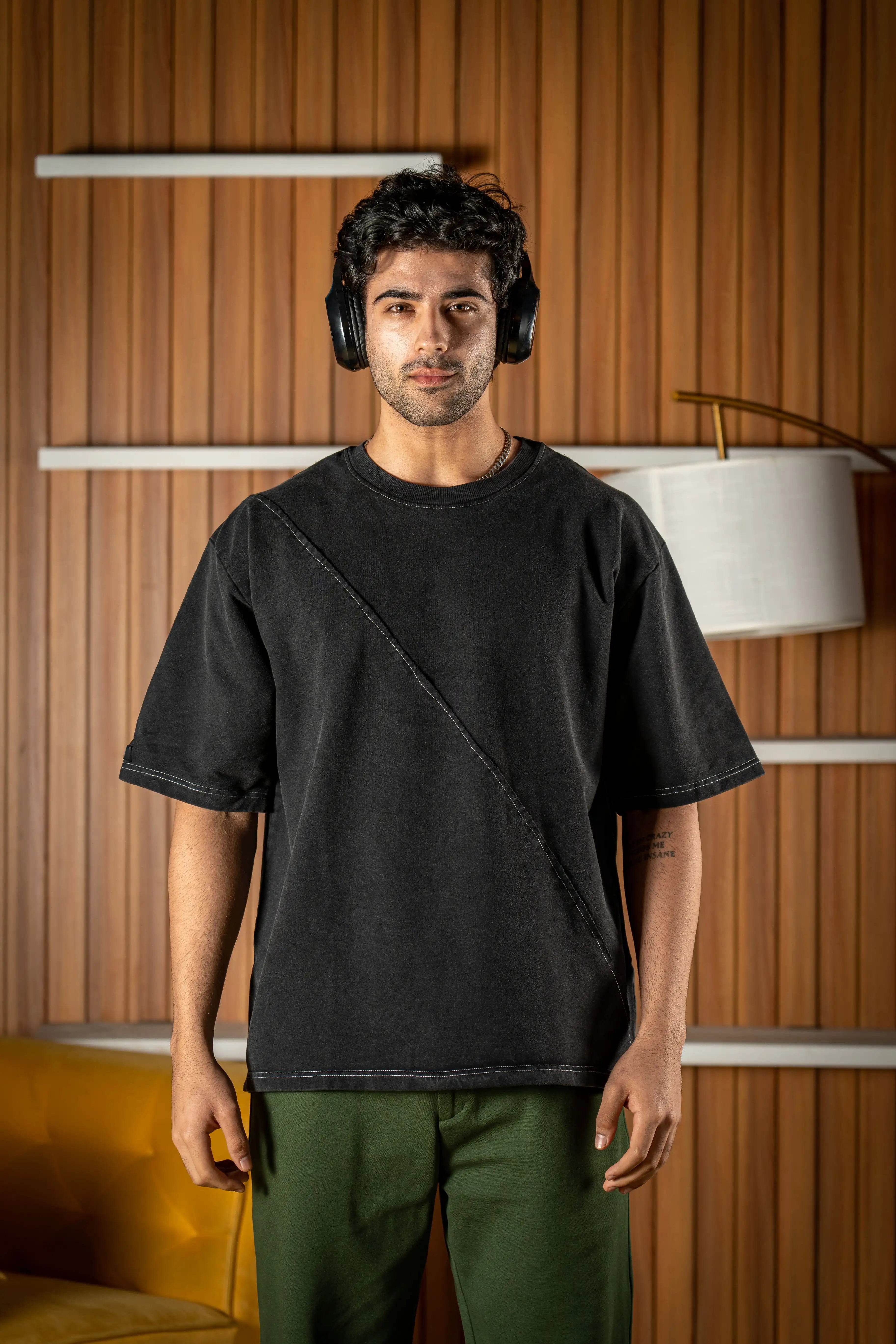 This Cut and Sew T-shirt celebrates the unconventional allure of patchwork, showcasing a unique asymmetrical diagonal cross stitching cut on the front. In a stonewashed ash gray shade, the garment features distinctive RESA branding on either the right or left sleeve, adding a touch of individuality to the design.