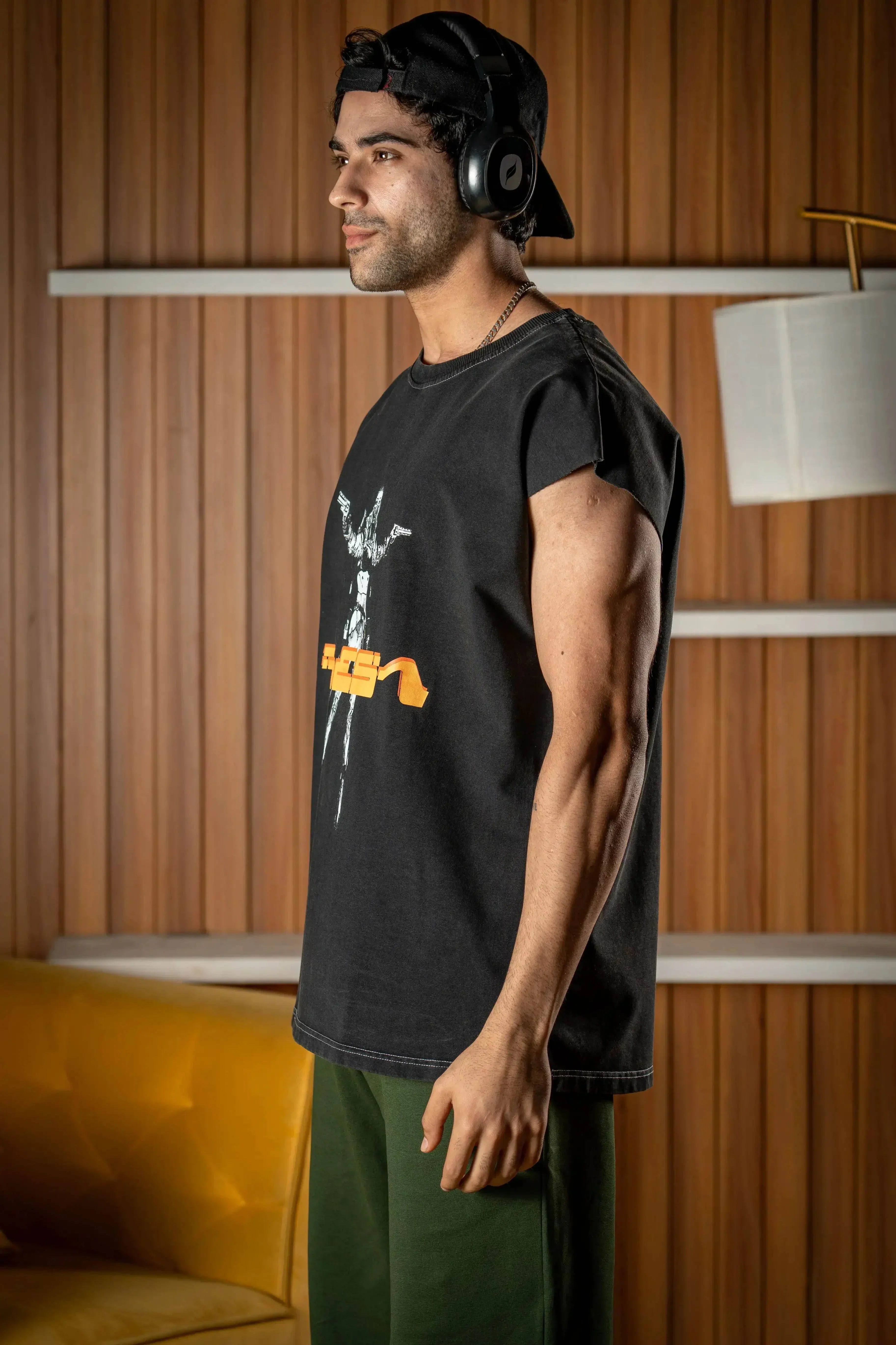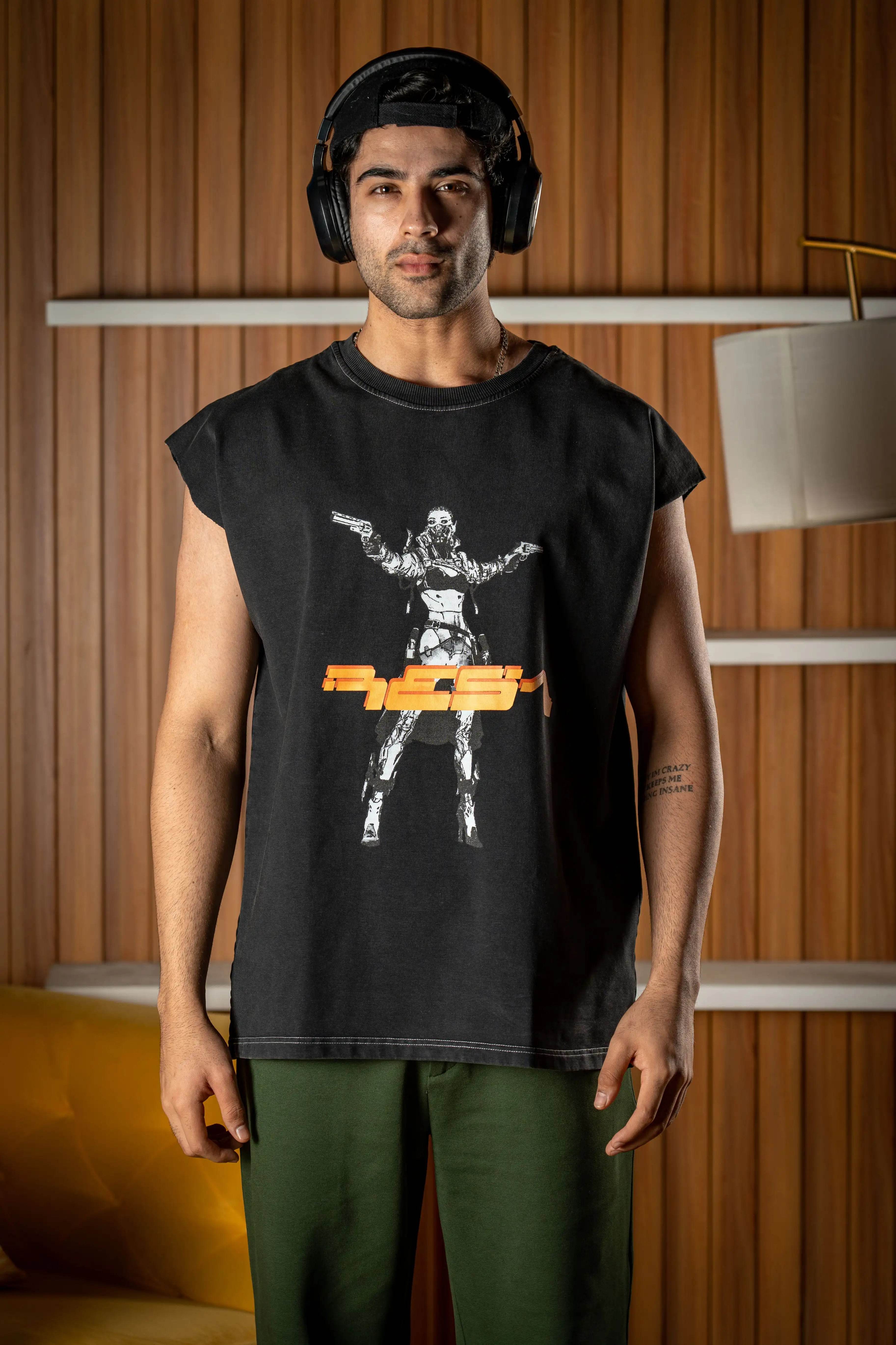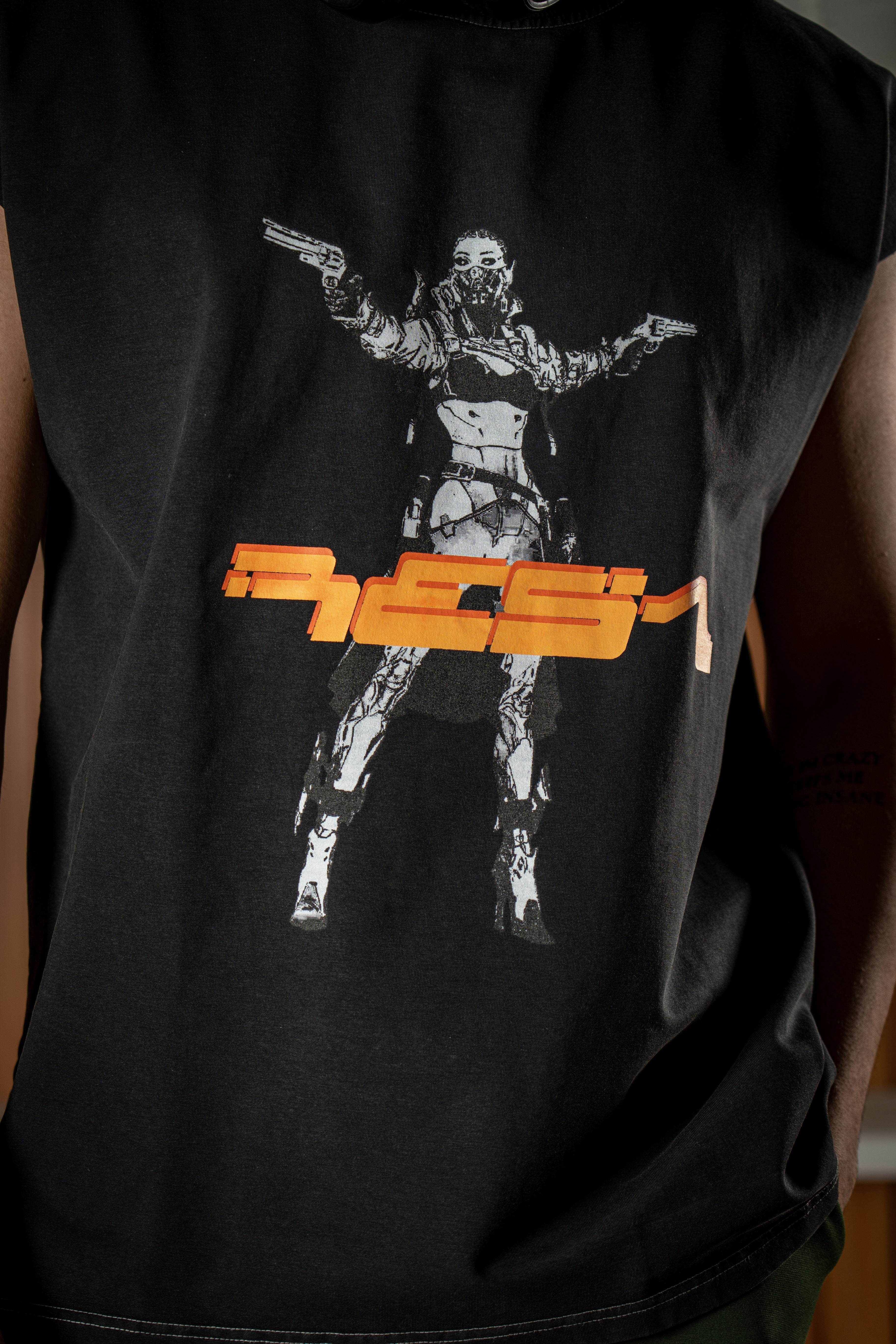 Designed to add an edgy touch to your outfits or make a bold statement at the gym without compromising on the comfort and quality. The front showcases a high quality print featuring a Mad Max-esque character in striking white, complemented by RESA branding in a futuristic font in vibrant orange. It's the perfect fusion of style and attitude for those who want to stand out with a cutting-edge aesthetic.