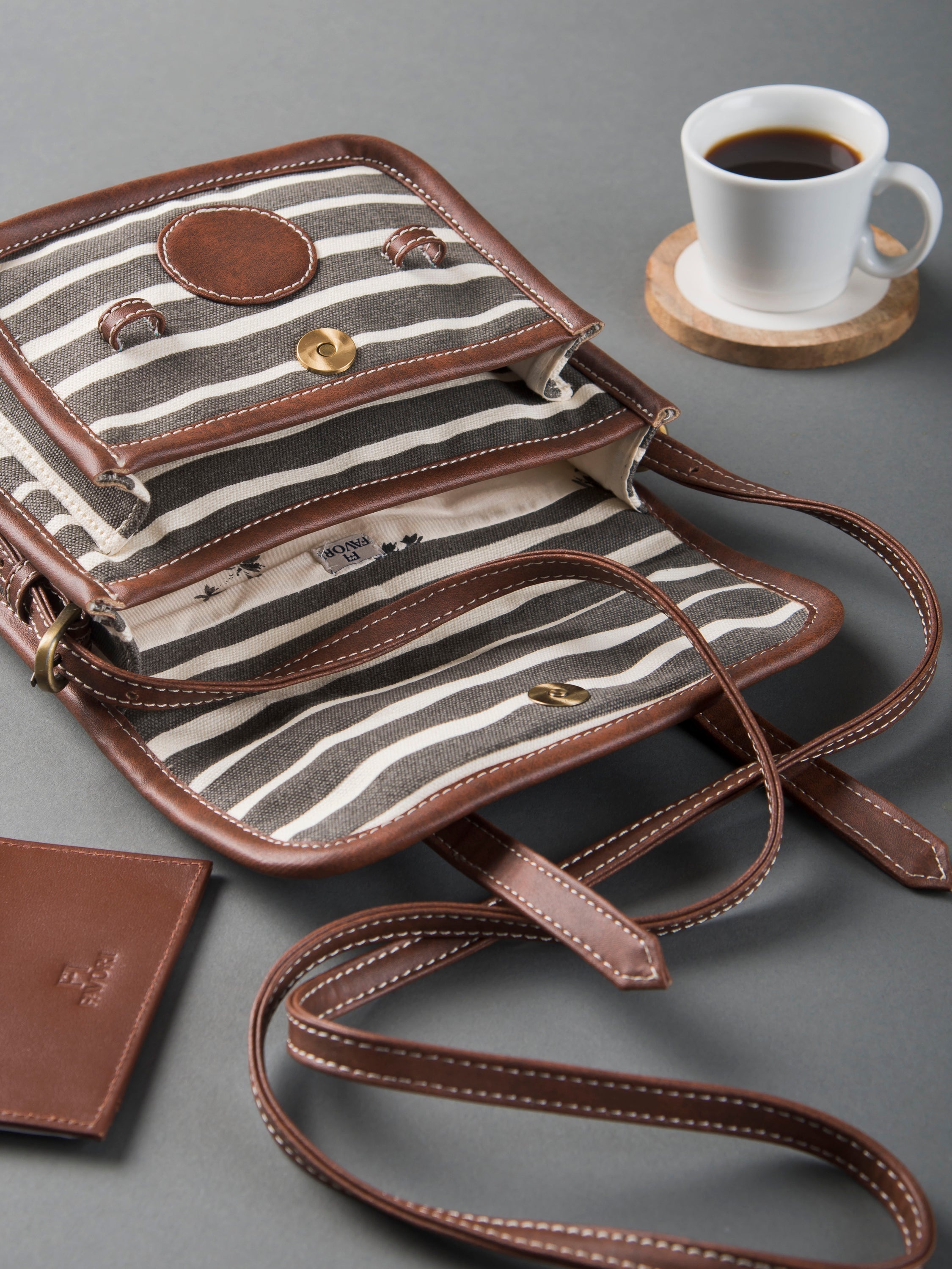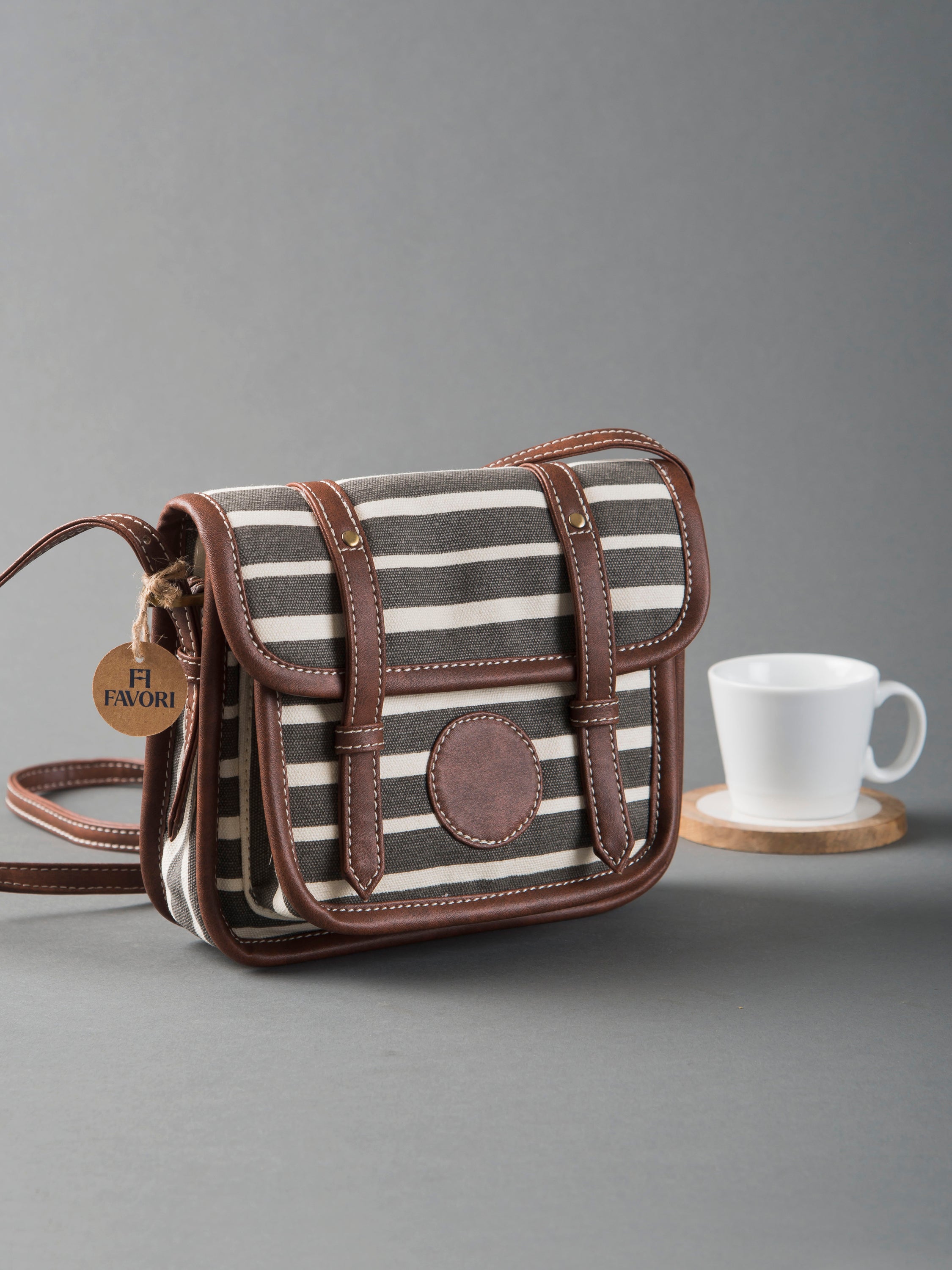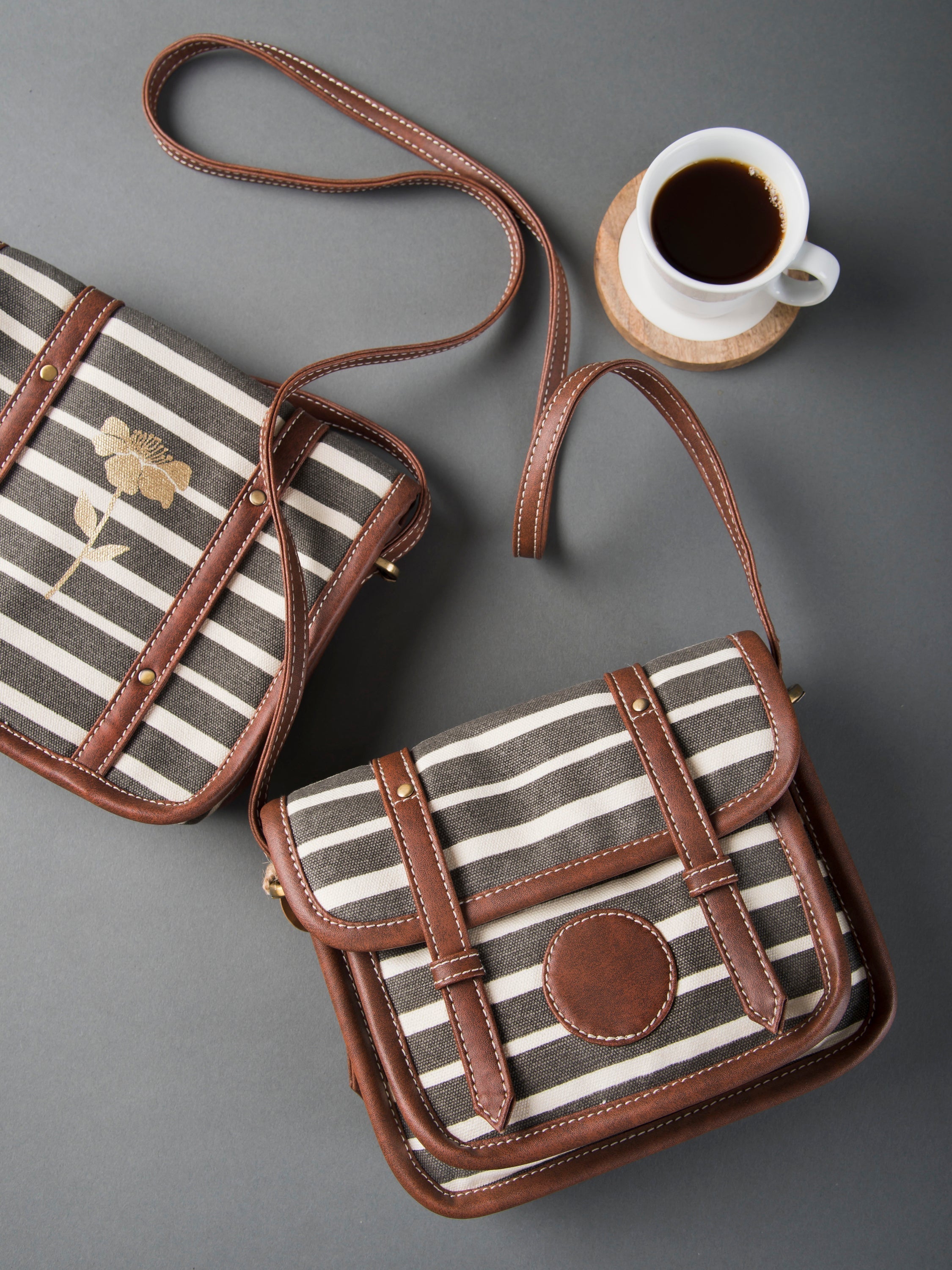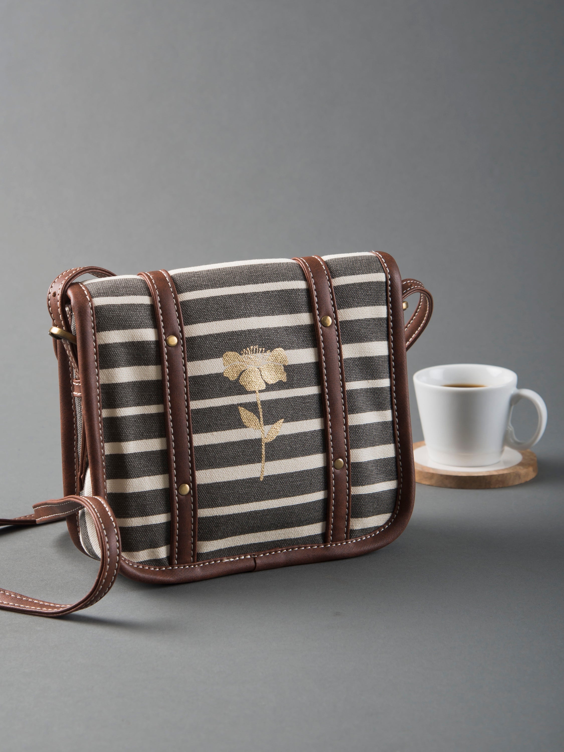 The sturdy structure of this sling holds all your essentials secured by a snap button closure. Additionally, there is a closing flap mechanism for extra security. The interior is lined with floral printed cotton fabric and equipped with two compartments to organize your small essentials. Available in stripe design with gold floral print at the back and faux leather trims as well as adjustable strap to your preferred drop, complements any outfit or occasion.