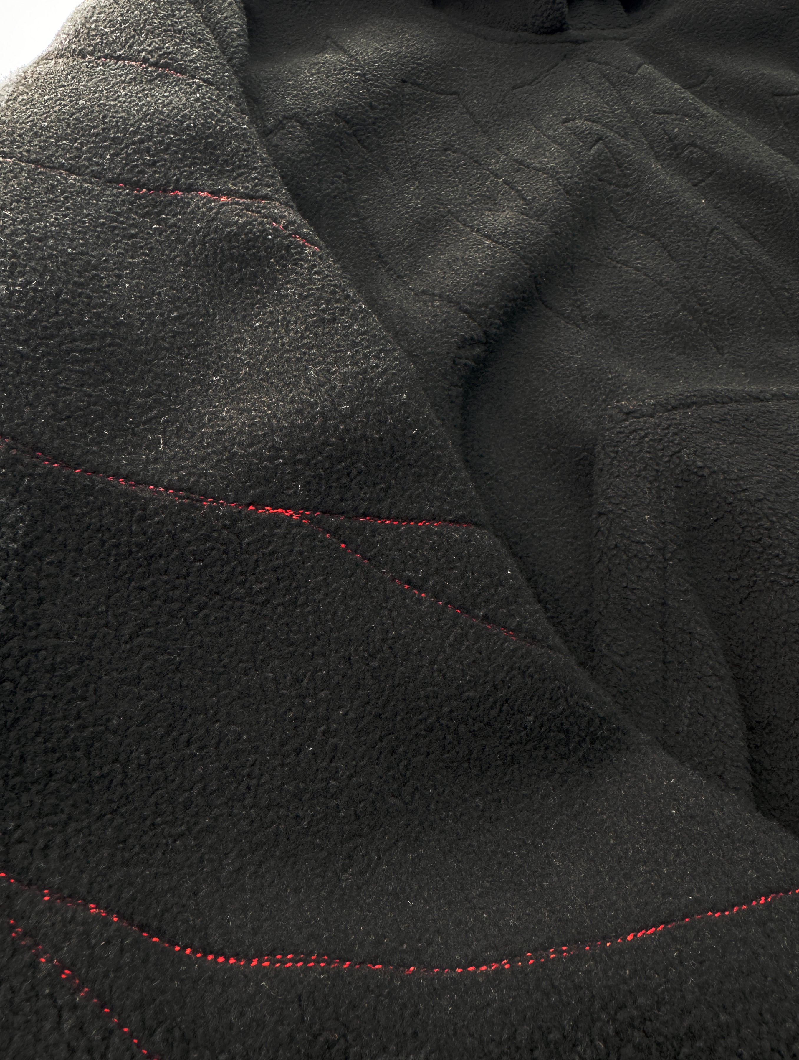 The reversible fleece hoodie is a heavy weight and ultra warm. Can be your single companion for winters and a style statement with the almost camouflage detailing done on both sides. And like most of our pieces the images never do justice to the detailing done, the hoodie looks much better irl as you explore the black on black stitching detail across the piece.