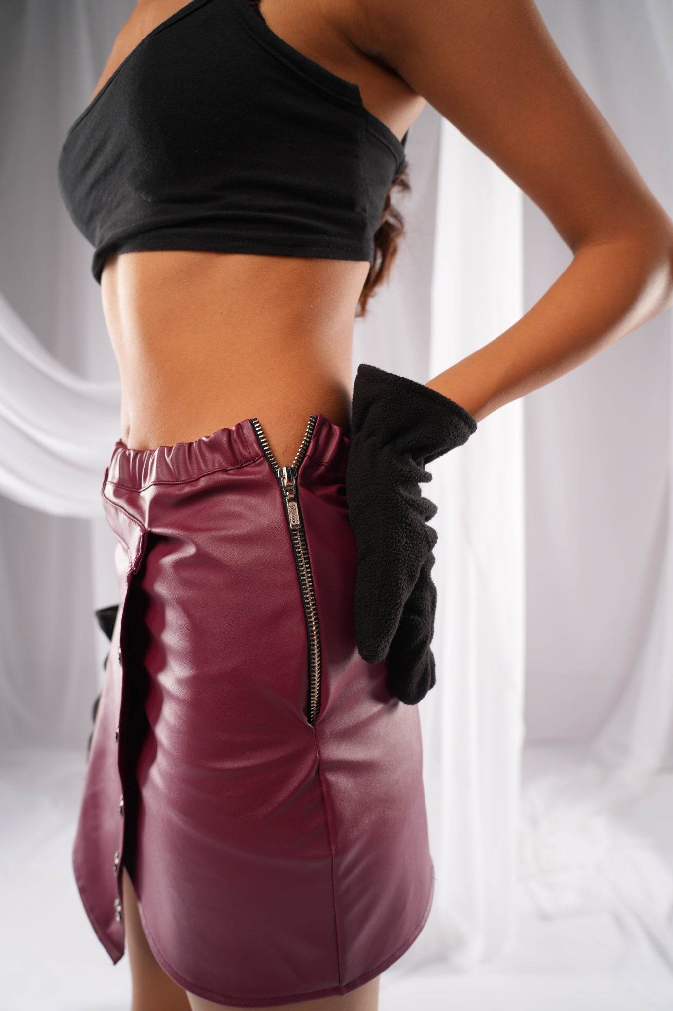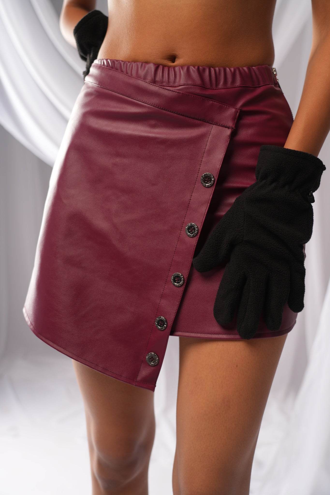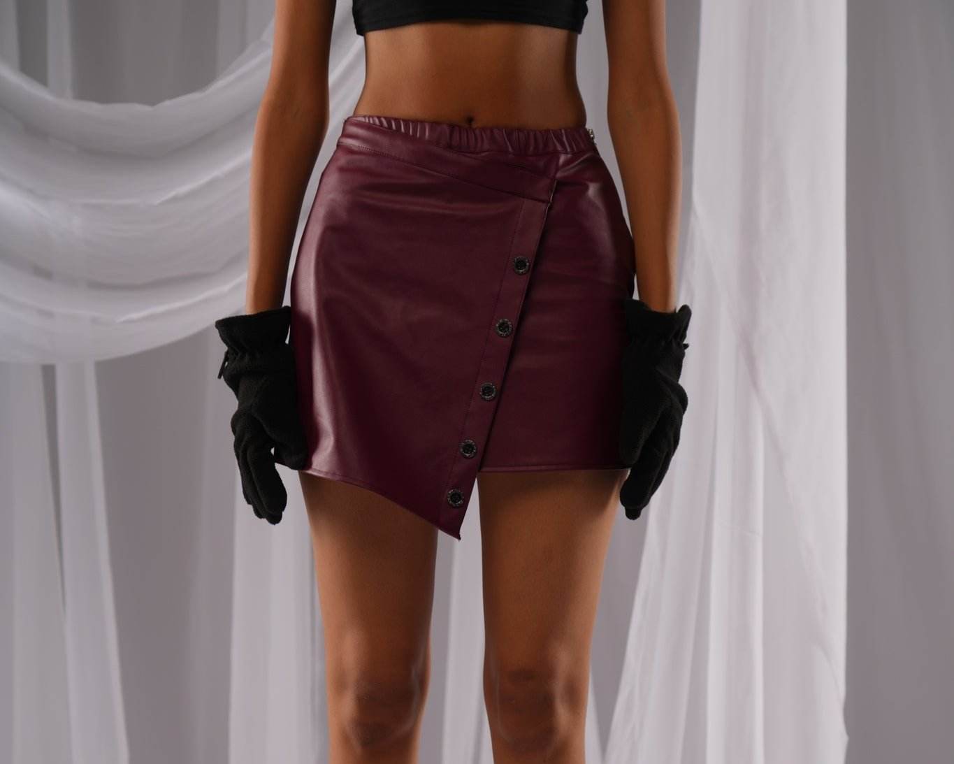 This faux leather skirt is crafted in asymmetric design language topped off by dummy RESA buttons on the front panel. It's the perfect skirt to wear to a party or to an event.