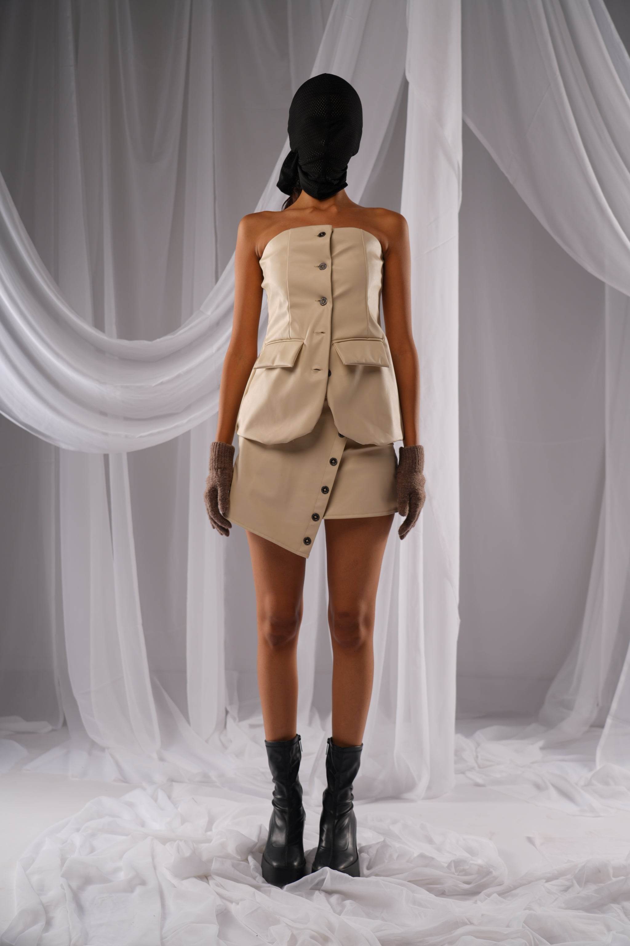 This faux leather tubetop is crafted to compliment any bottom in your wardrobe, it’s the perfect fit for a party or an event or even when you're travelling. The buttons are customized with RESA written on them.