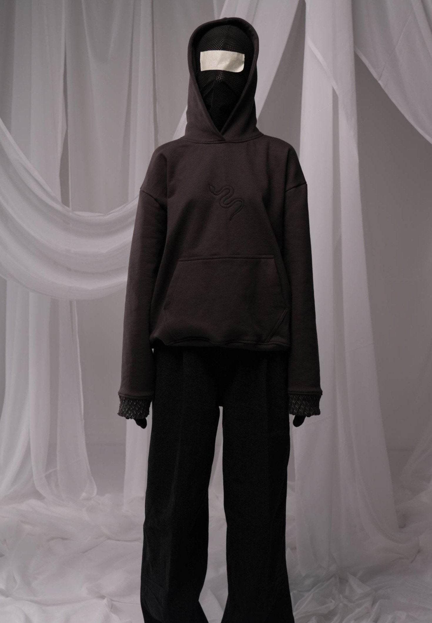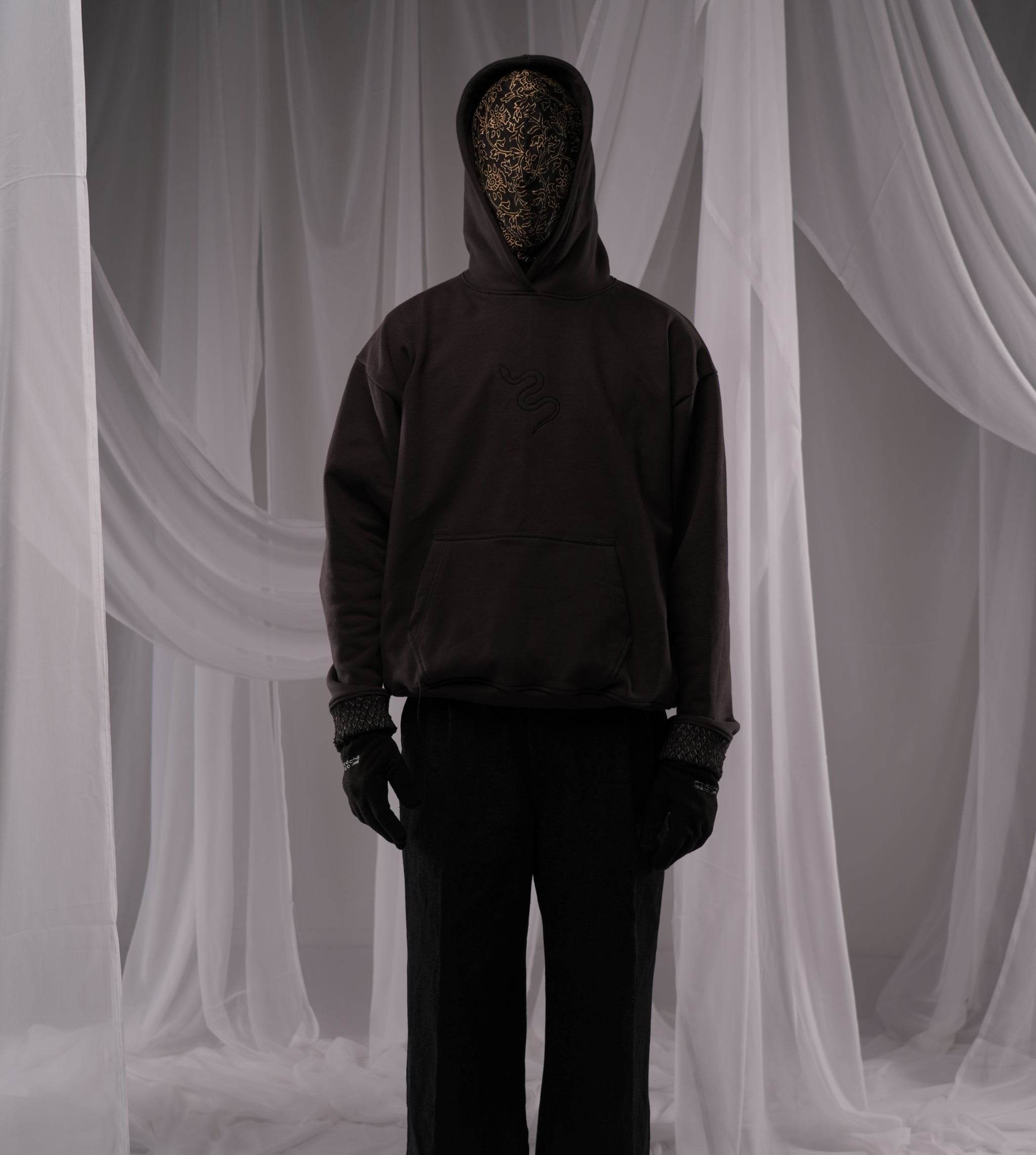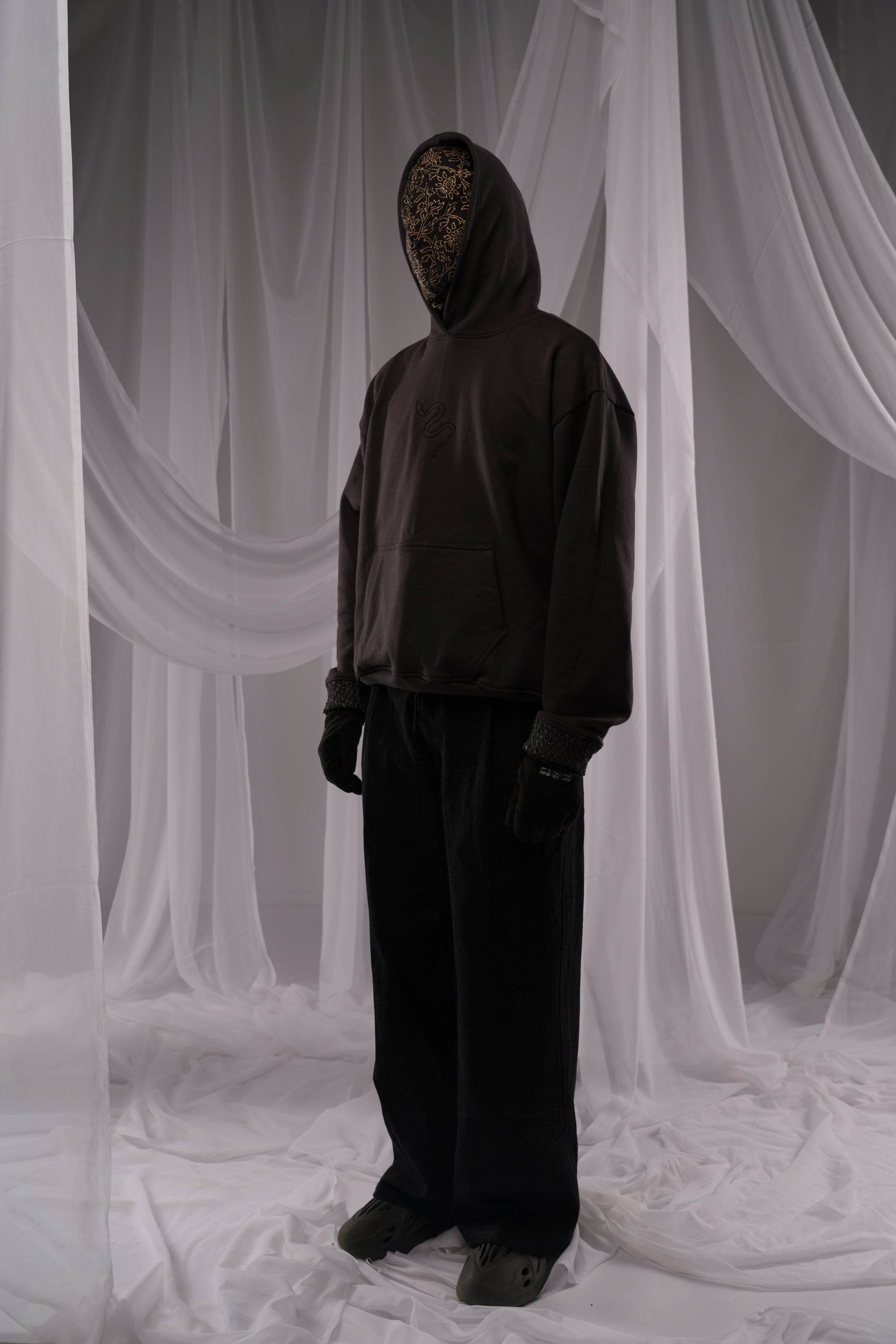 This hoodie is one of our best work ever, the back features a huge 3D embroidery of the Revival Logo. The front chest has another embroidery of the snake and the cuffs have small patches of fabric stitched to it, the cuffs are basically snake scales and it takes 1 kaarigar 1 day to make 1 of this hoodie.