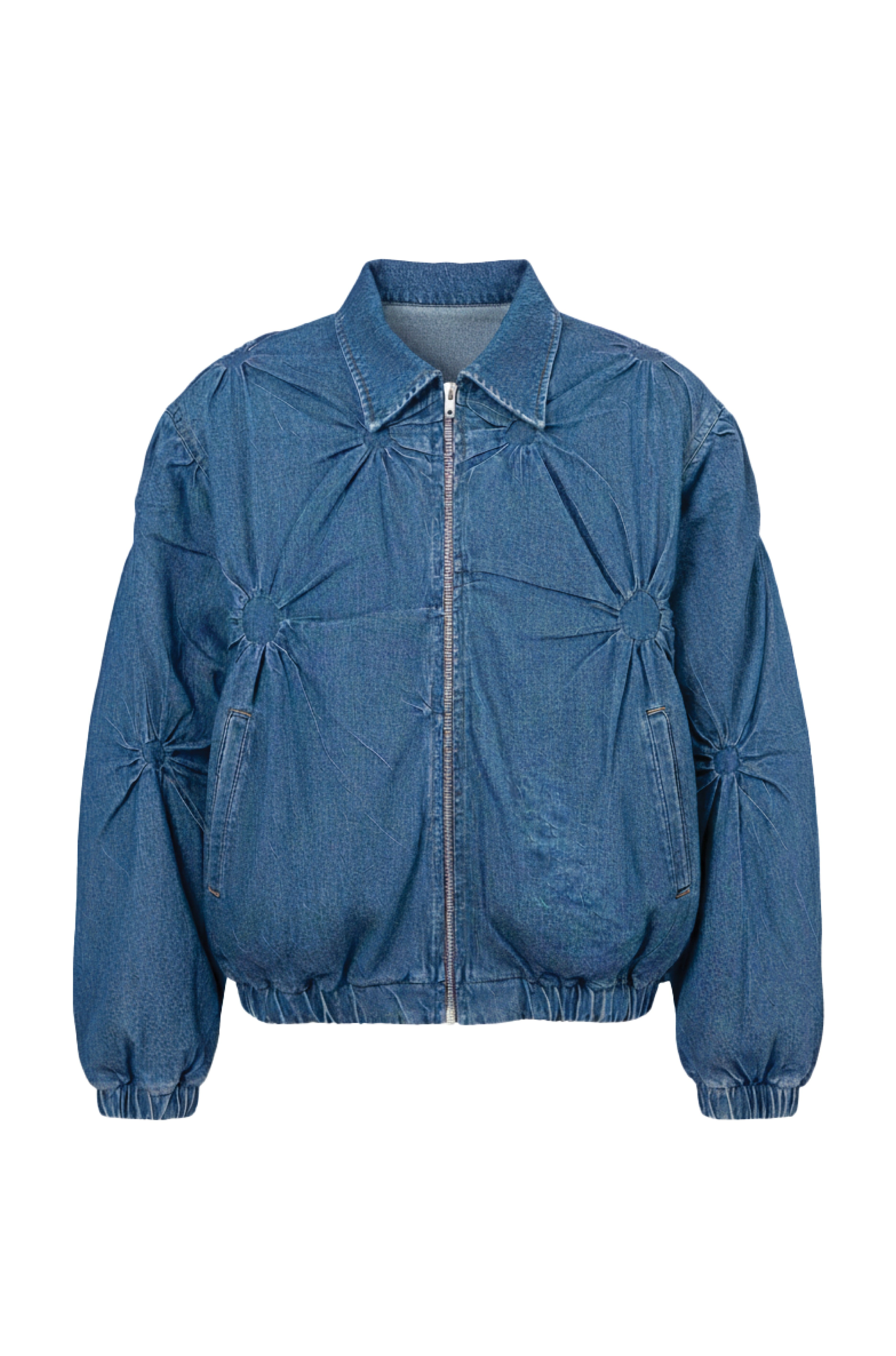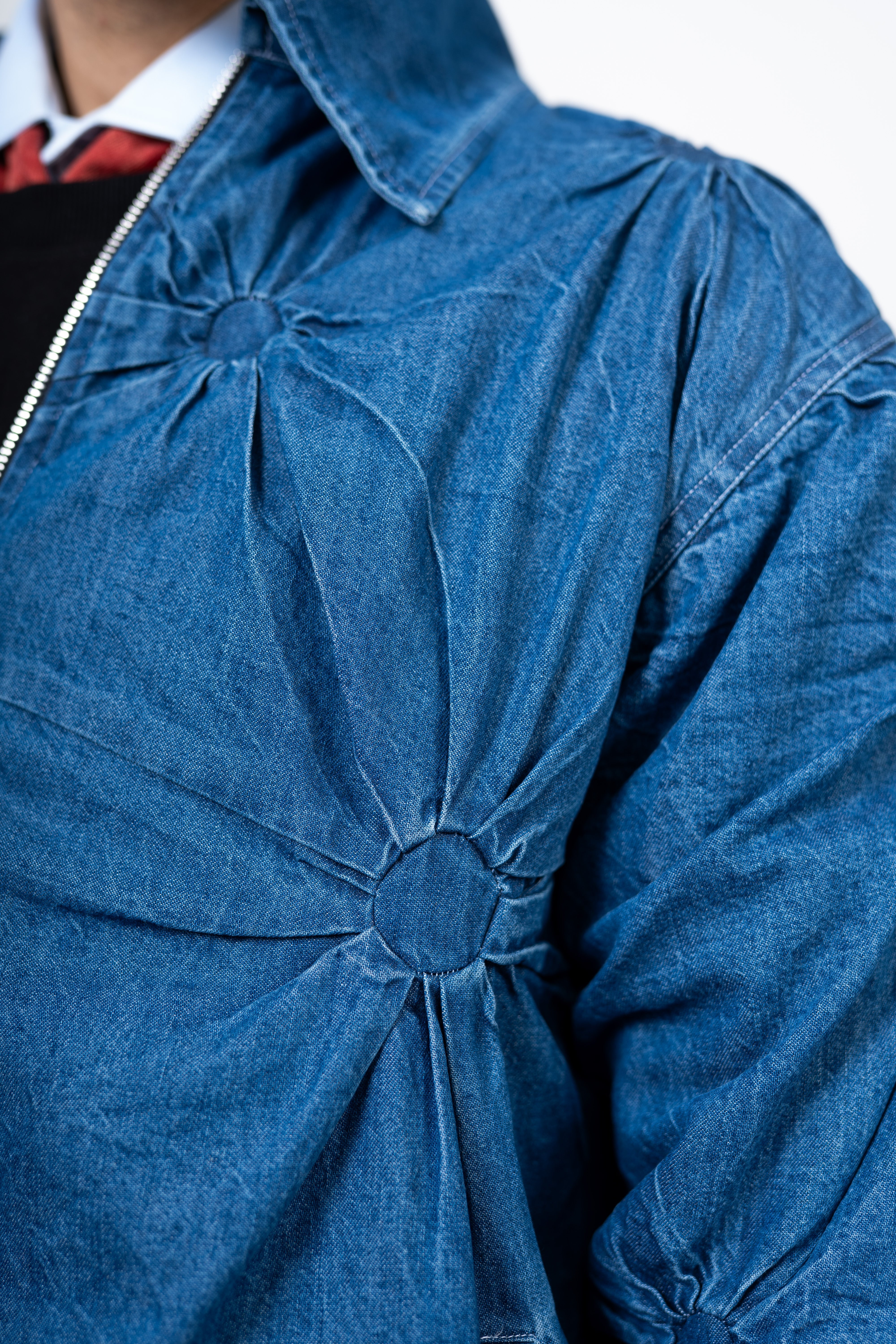 This denim jacket brings our signature circle manipulation technique into a more structured form, using precisely gathered rings to create dimensional circular textures across a sturdy denim base. The fabric is enzyme washed to soften the hand feel and highlight every sculpted fold, giving the surface a worn-in depth that enhances the technique.