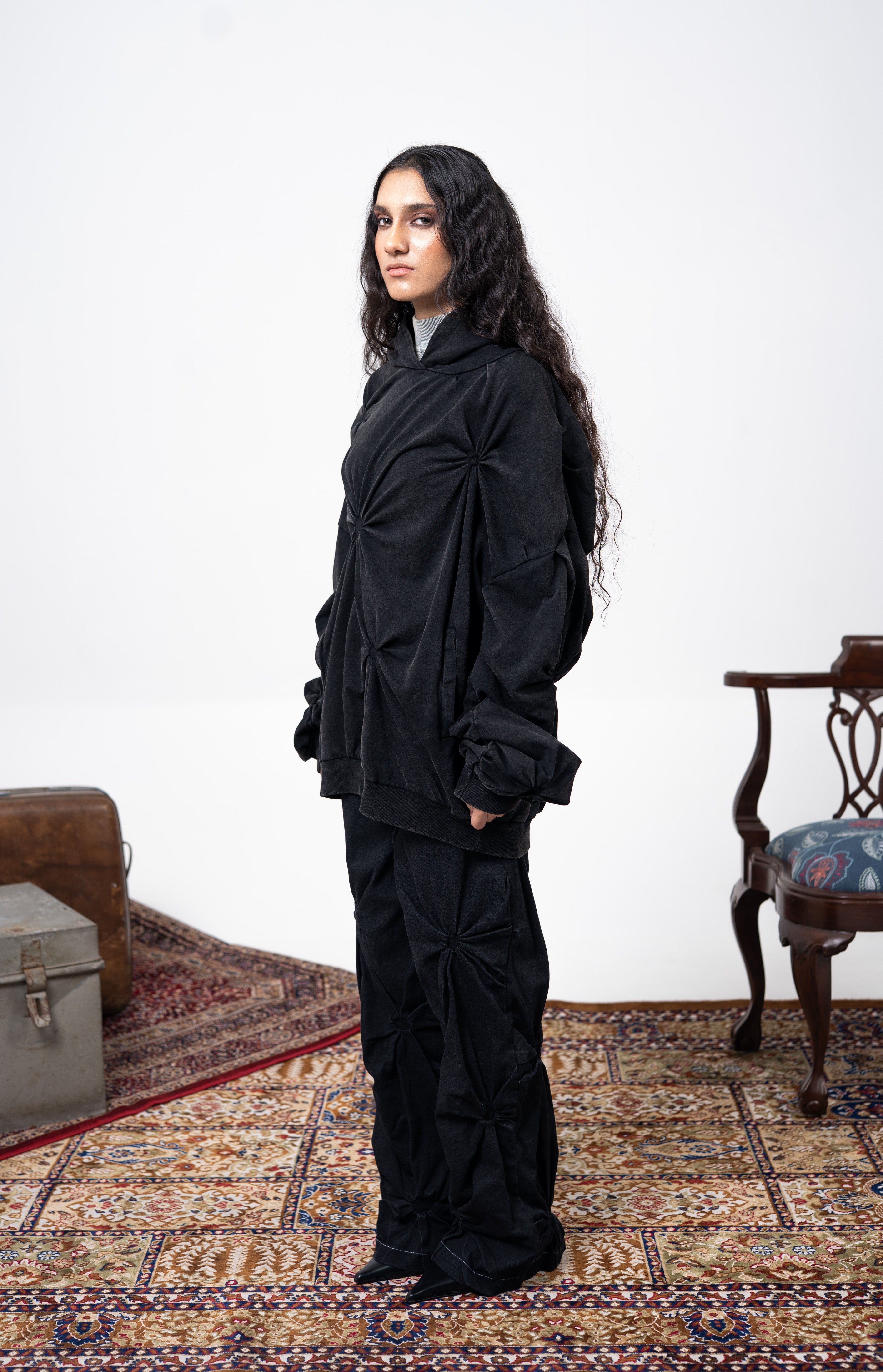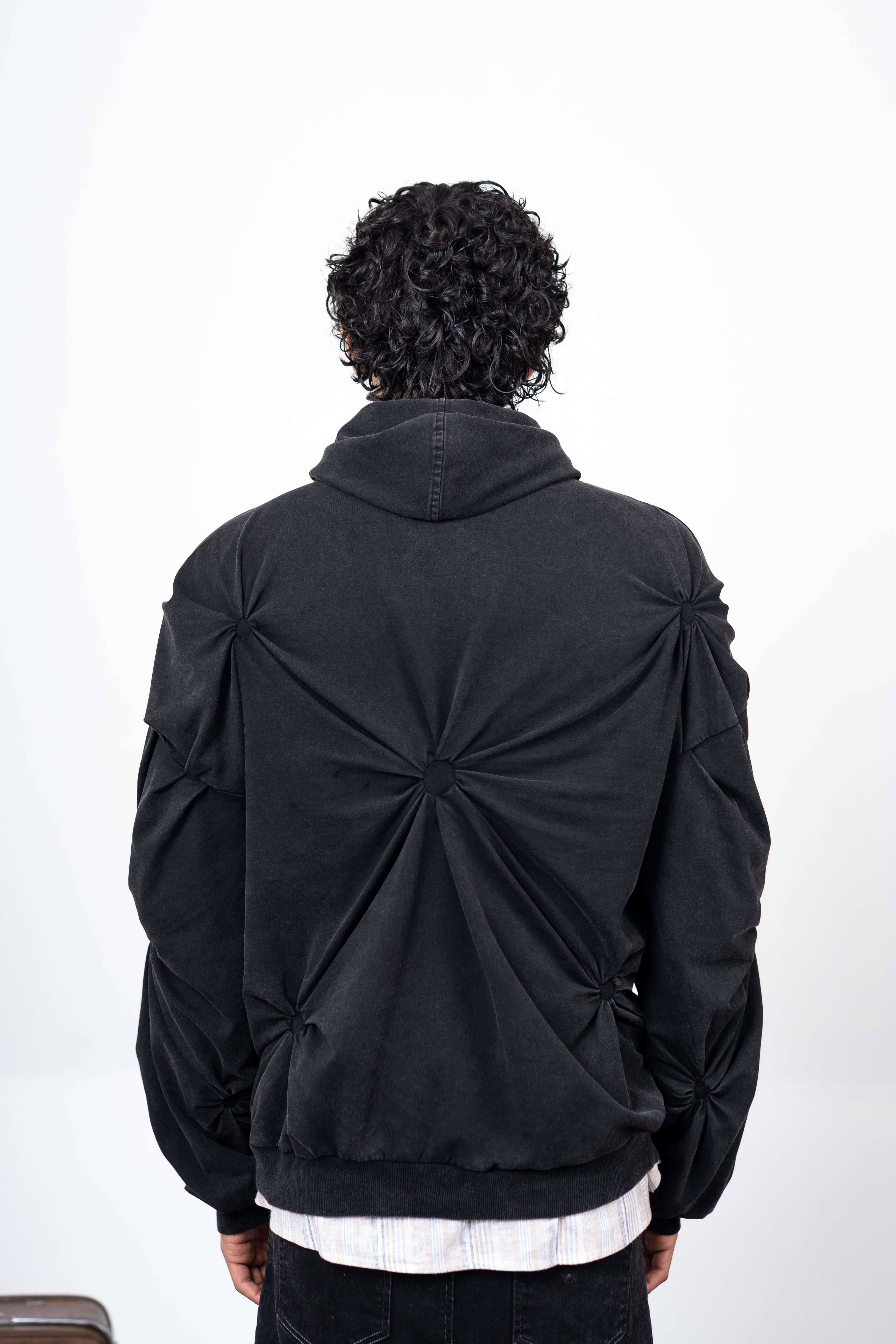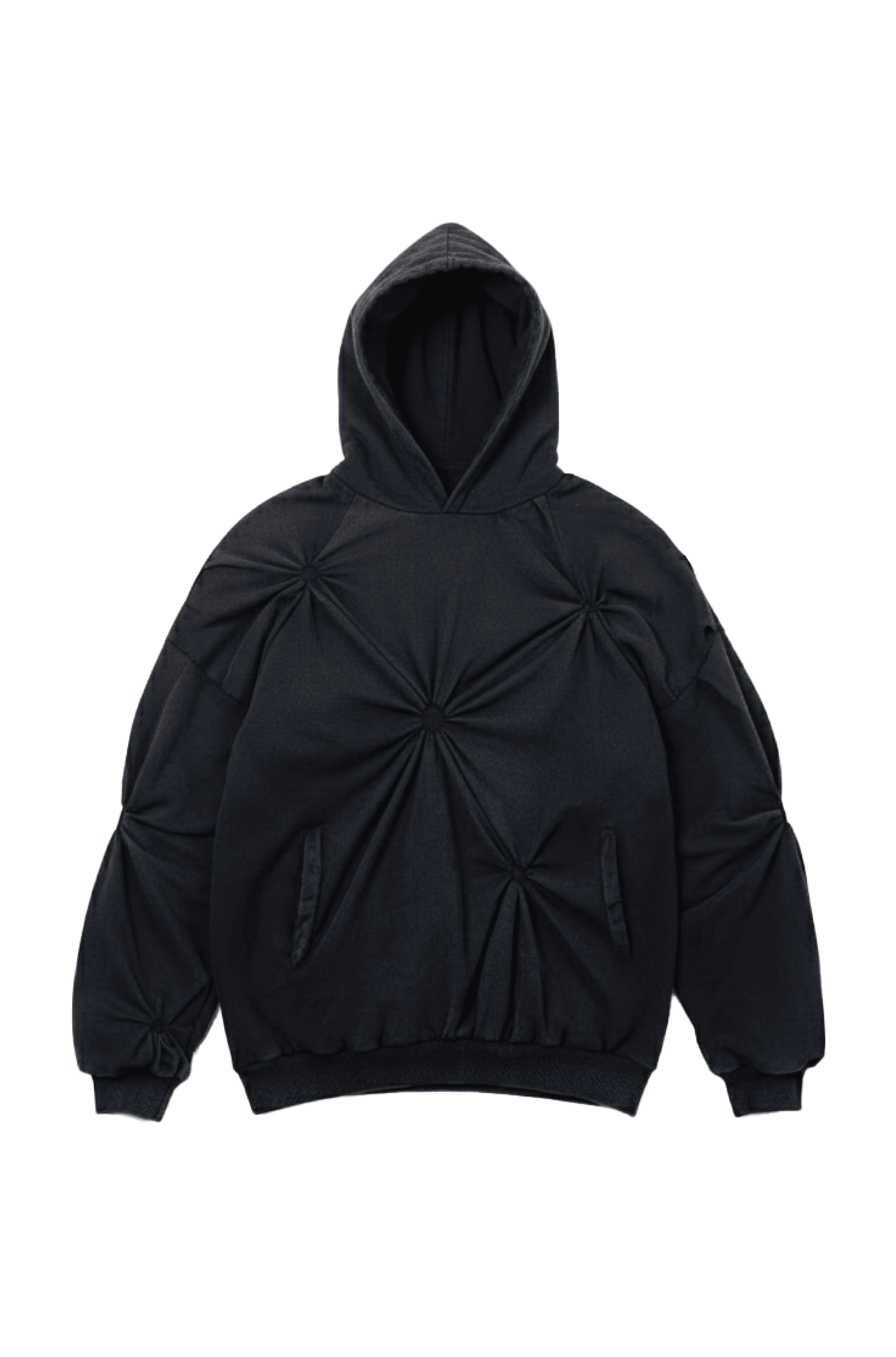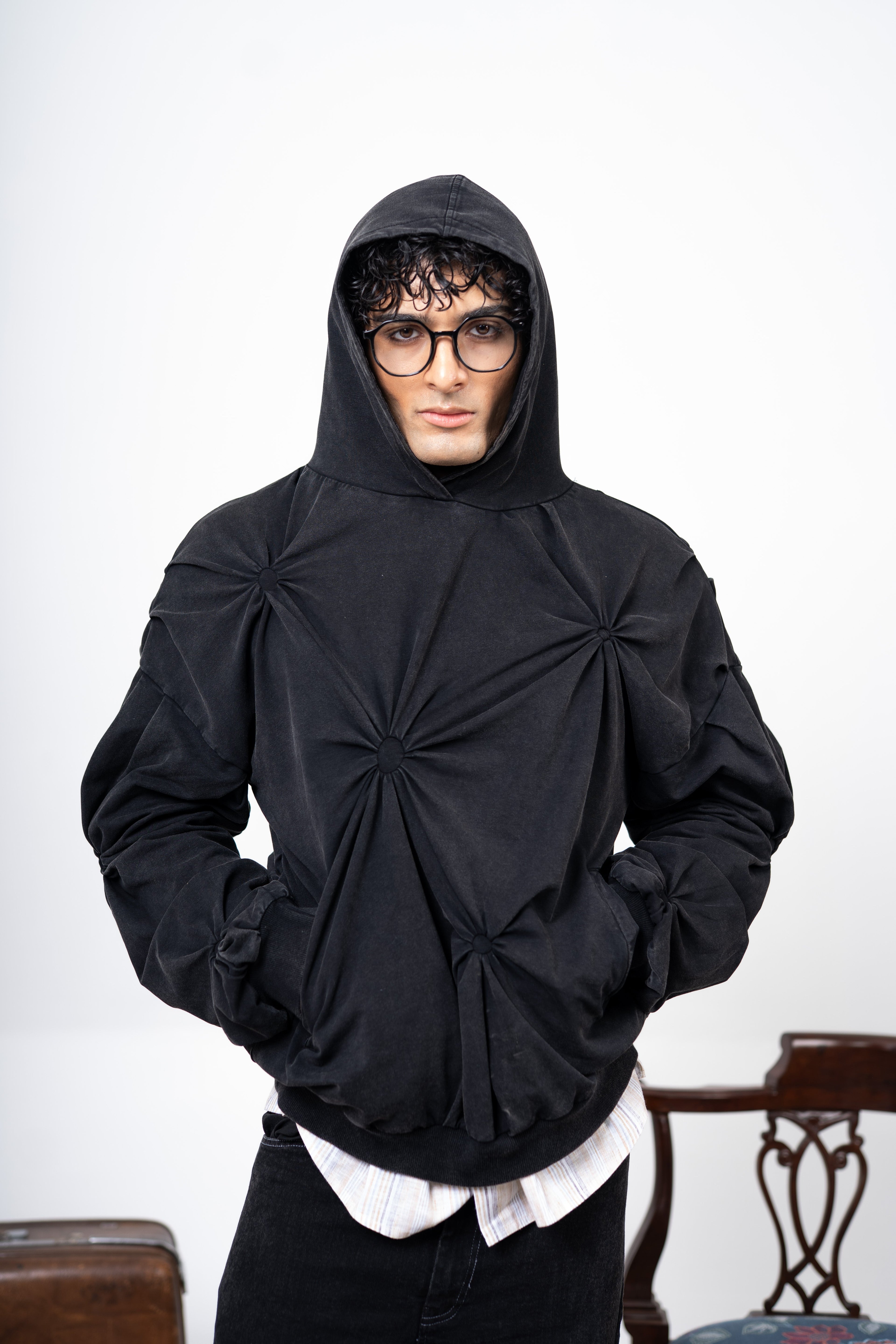 The Revolution Hoodie reimagines structure through movement. Crafted in soft terry lycra, it features an intricate surface manipulation technique using gathers and hand-placed rings to form circles of varying sizes across the silhouette. The lycra allows every fold to sit with intention, creating a sculpted yet effortless drape.