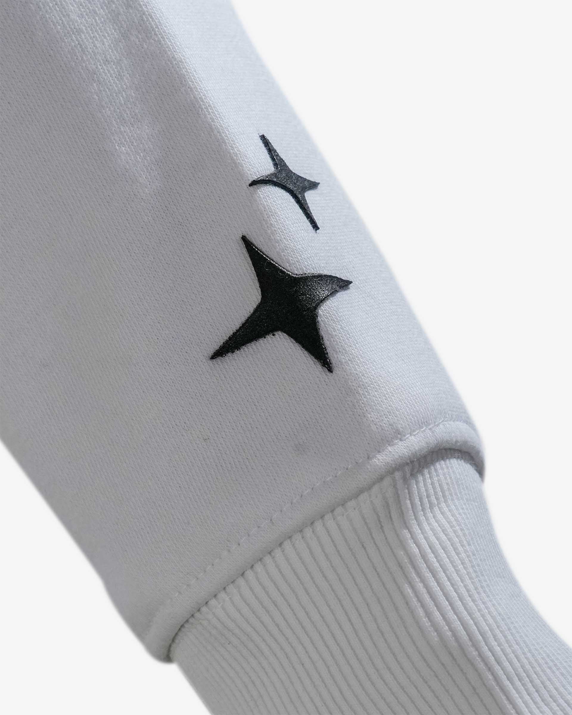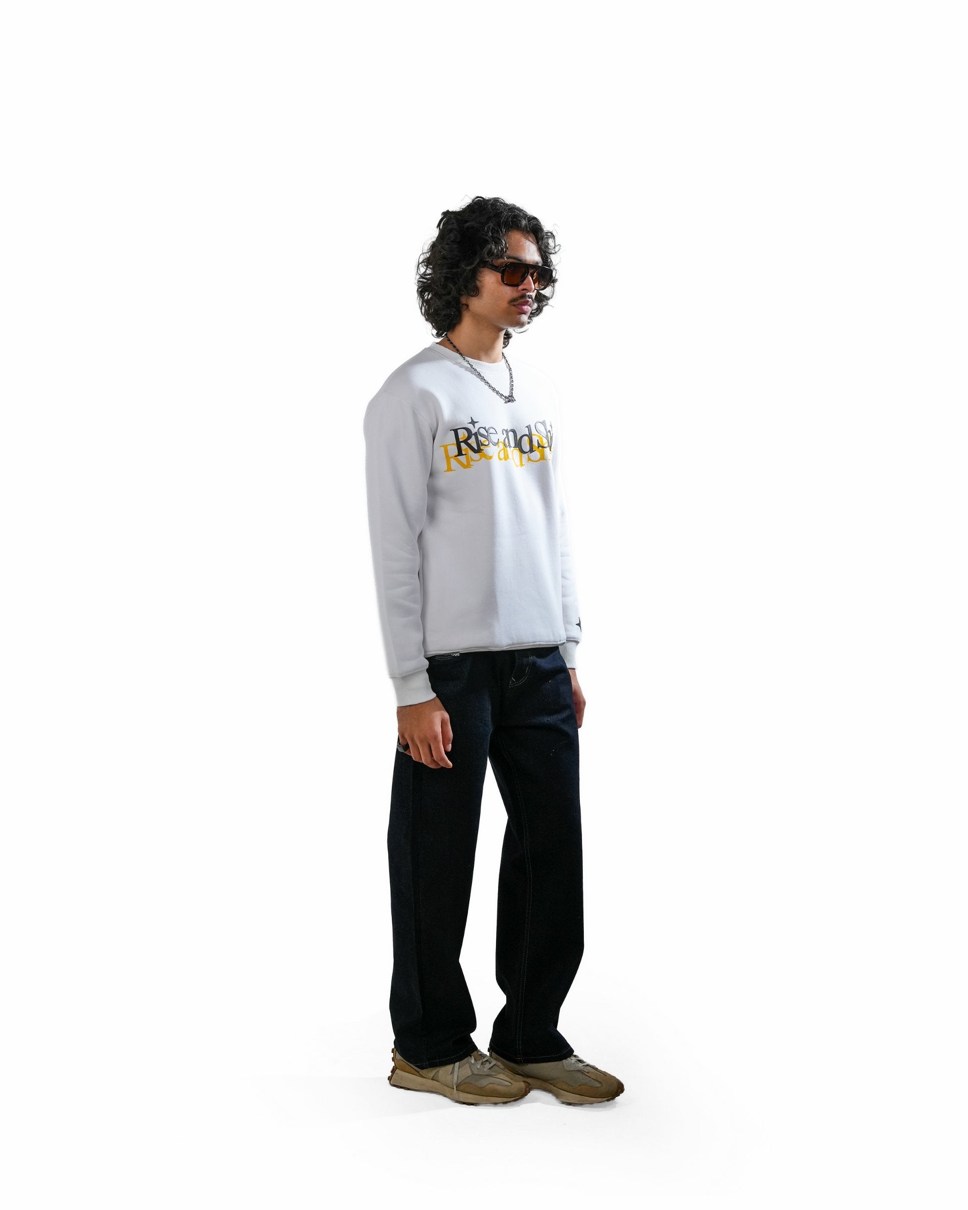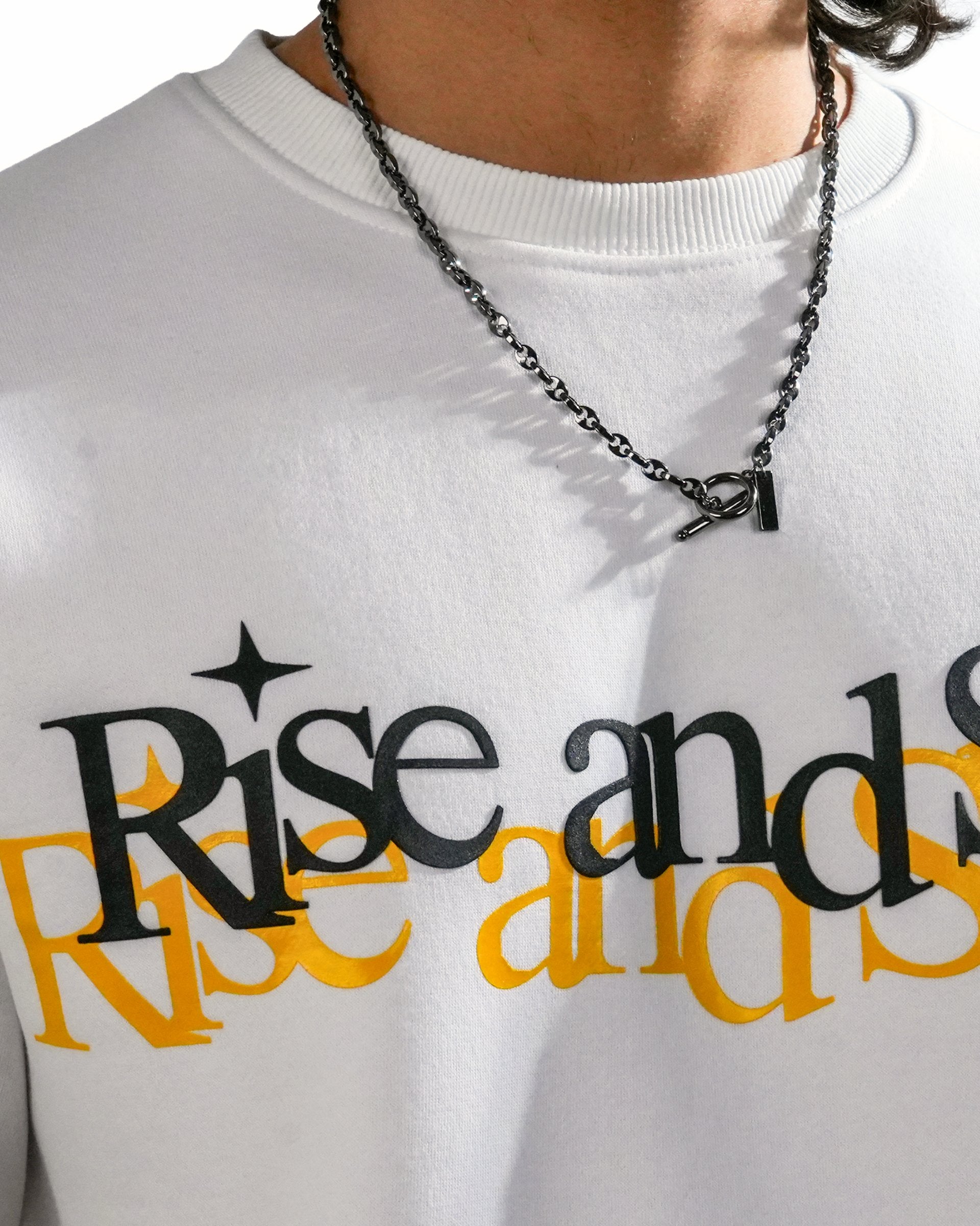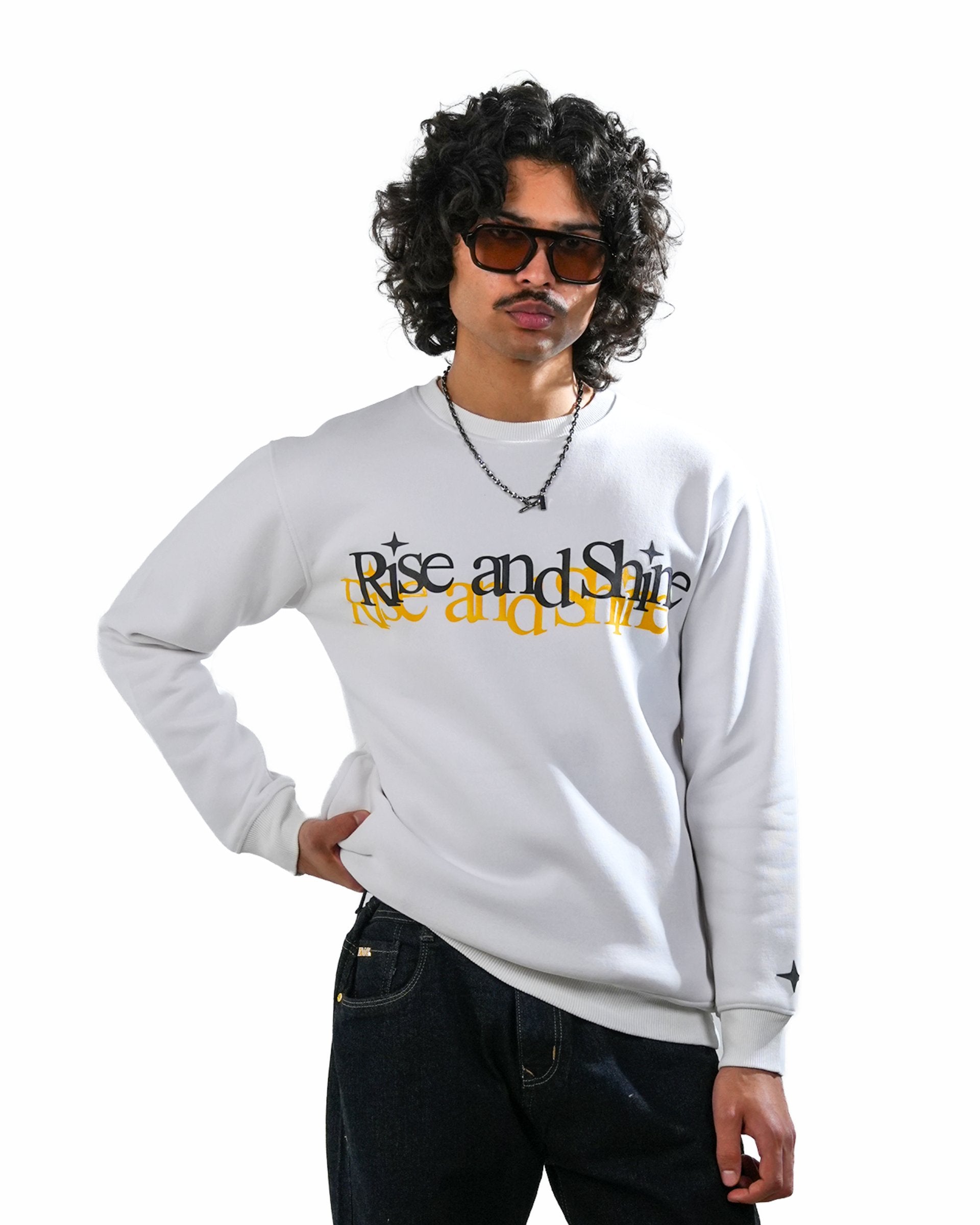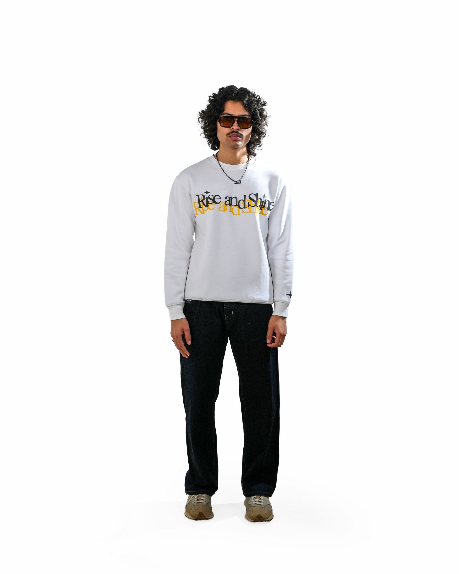 The Rise and Shine Sweatshirt in white is made from premium 400 GSM Cotton 3-Thread Fleece, delivering a clean, heavyweight structure with comfortable stretch. A double silicone finish enhances the white fabric with a smooth, soft, and refined feel.