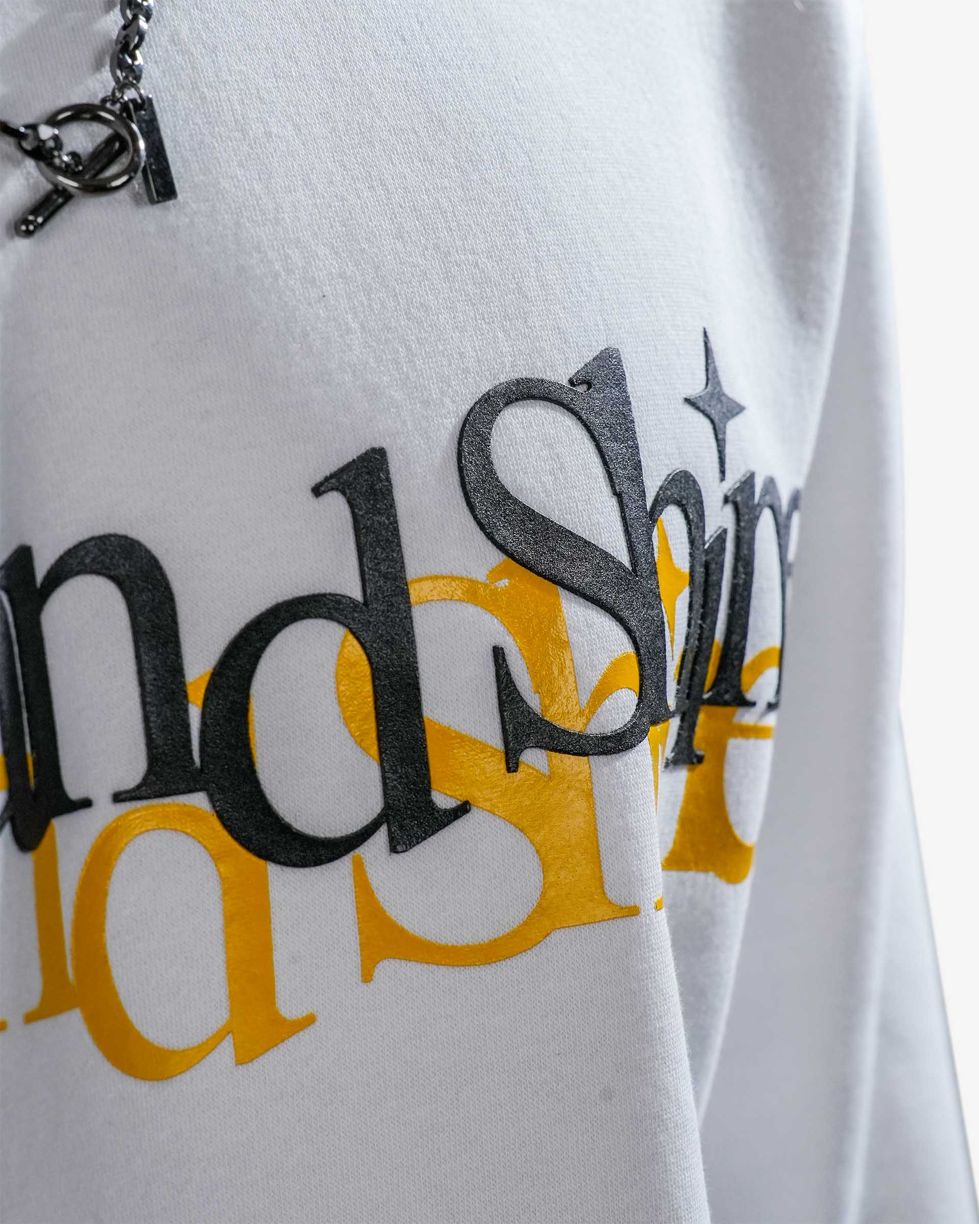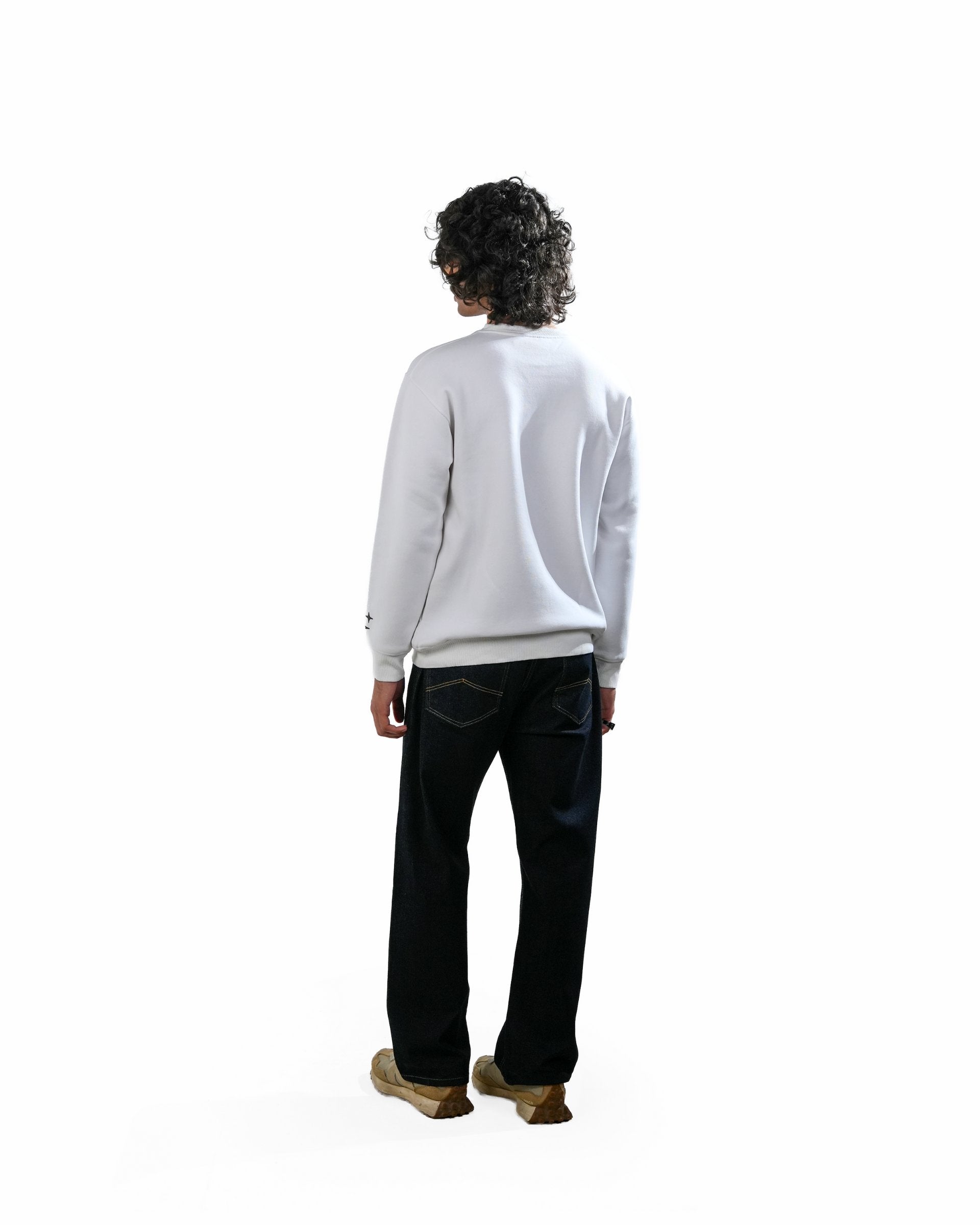 Cut in an oversized silhouette, it features bold high-density raised prints on the front that stand out sharply against the white base, adding depth and visual impact. Finished with durable 2x1 ribbing, this sweatshirt balances statement style with everyday comfort.