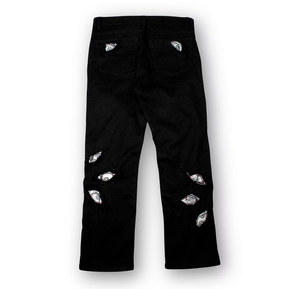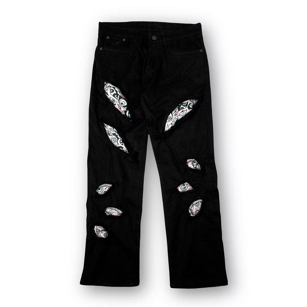 Meet "RISING MALICE" – a daring fusion of avant-garde style. Strategically cut white fabric patches, hand-painted with malicious eyes in black and red, create a captivating three-dimensional effect. Stuffed with plush cotton, these eyes appear to emerge from the denim, adding an enigmatic touch to your look. Elevate your style with a pair that transcends fashion norms. Step into the extraordinary with "RISING MALICE" – where rebellion meets artistry.