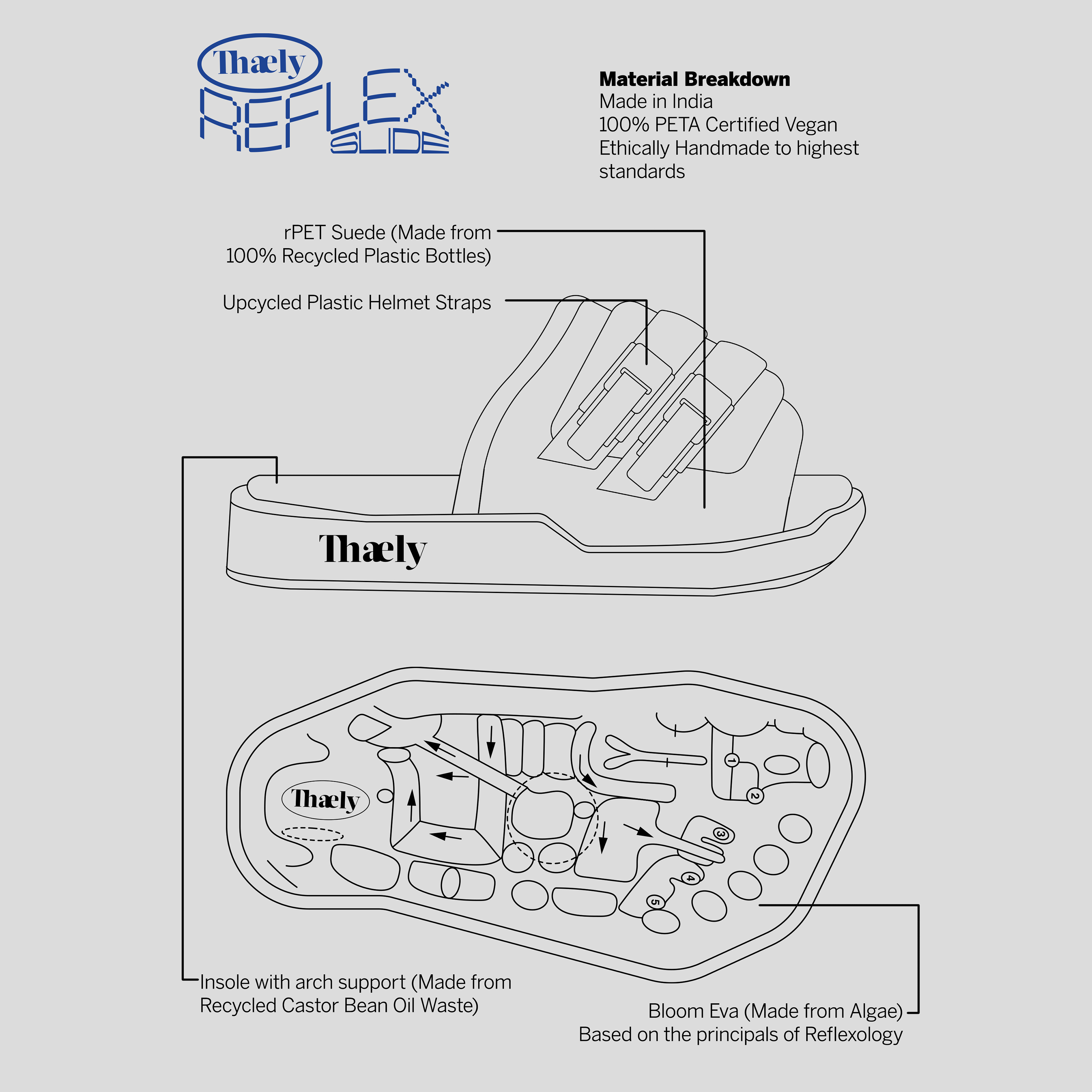 Thaely Reflex Slides are where sustainability meets cloud-like comfort. Crafted with a plush RPET suede upper made from 100% recycled plastic bottles and insoles crafted from recycled castor bean oil waste, these slides redefine open footwear like never before.