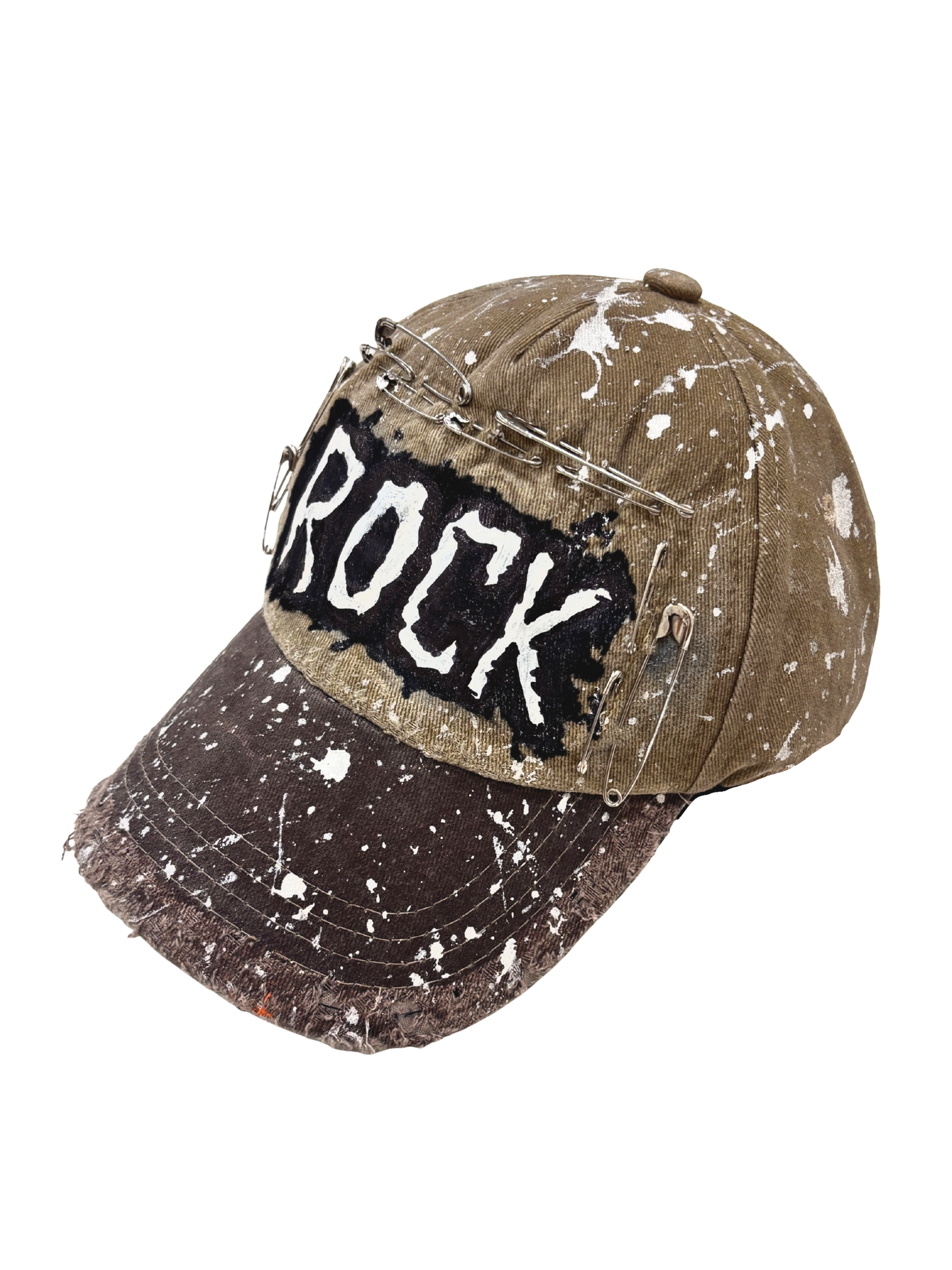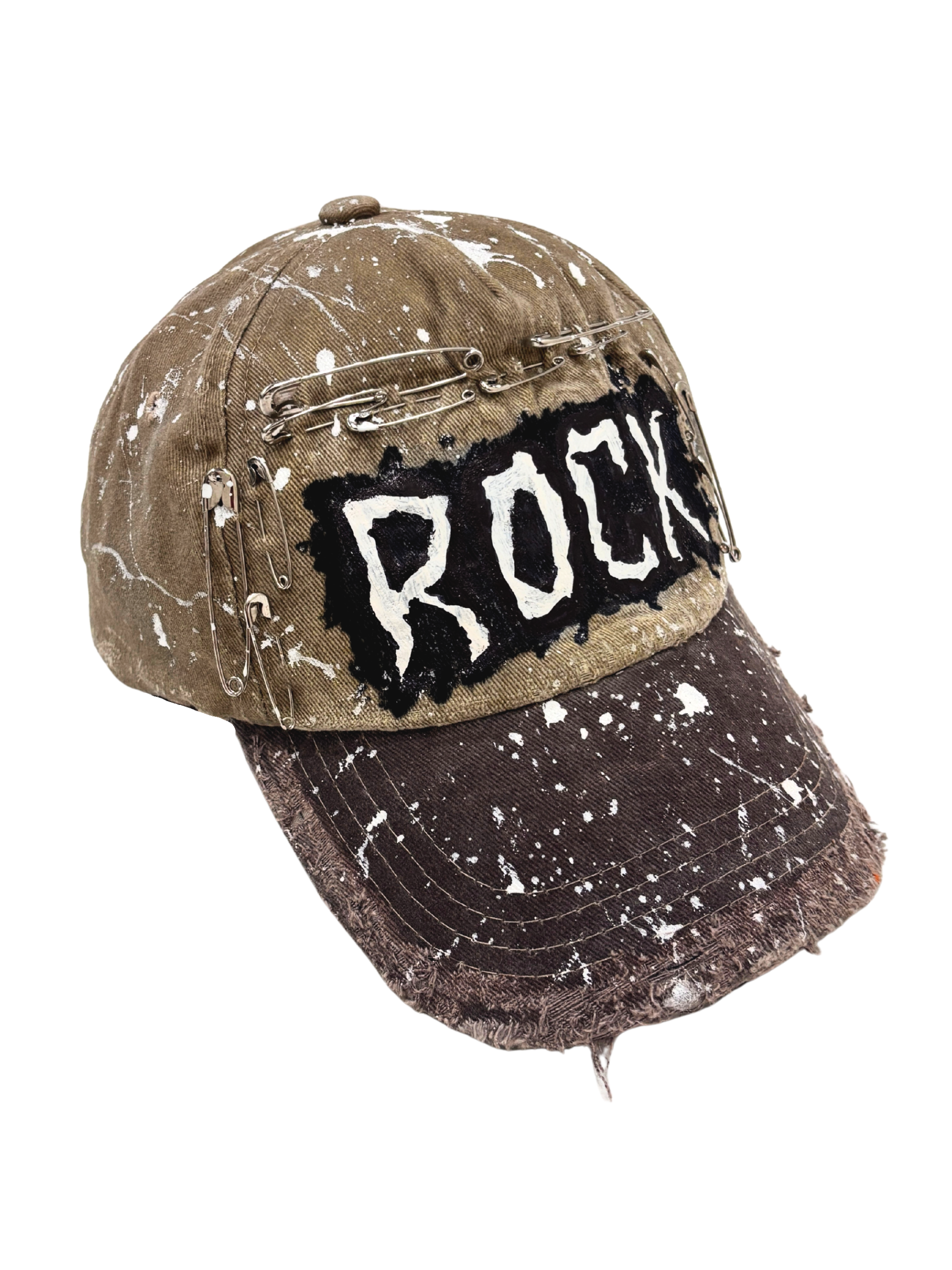 This one-of-one cap is a battle scar in fabric form hand distressed, hand painted, paint-splattered, and held together with safety pins like a badge of rebellion. The bold “ROCK” across the front isn’t just a word, it’s a statement. Built for the misfits, the outlaws, the ones who make noise when the world demands silence.