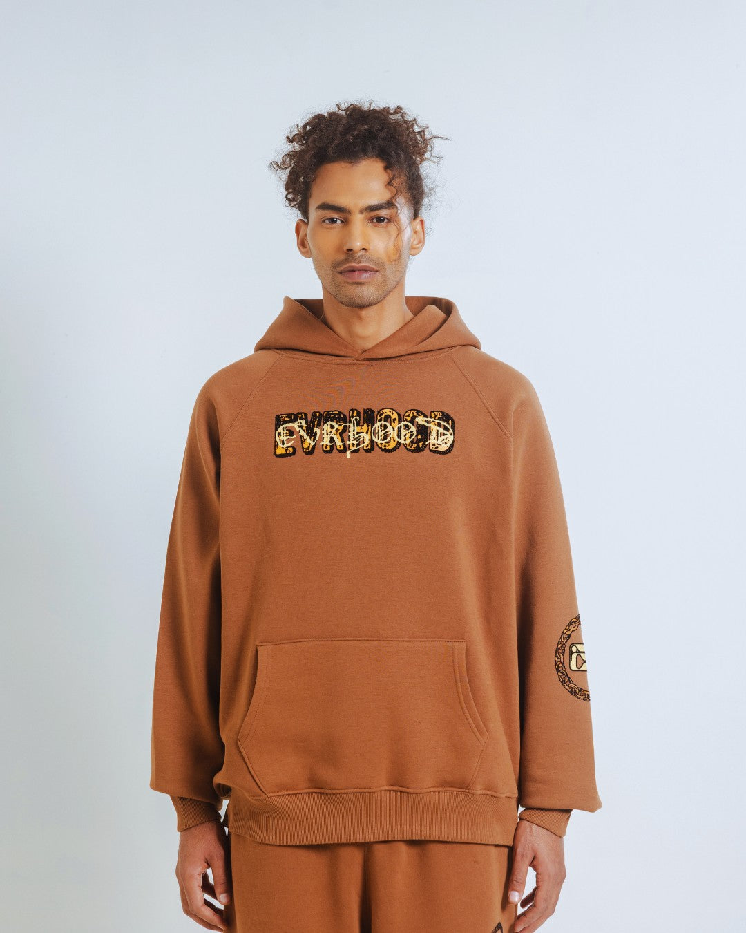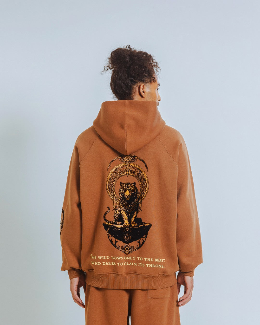 A camel-brown hoodie featuring a detailed tiger graphic crafted using a mix of screen print and flocking for depth and texture. Built from soft, premium-weight fabric and finished with a smooth handfeel. Designed for those who move with quiet confidence.