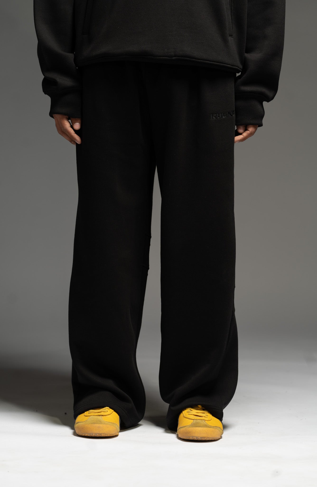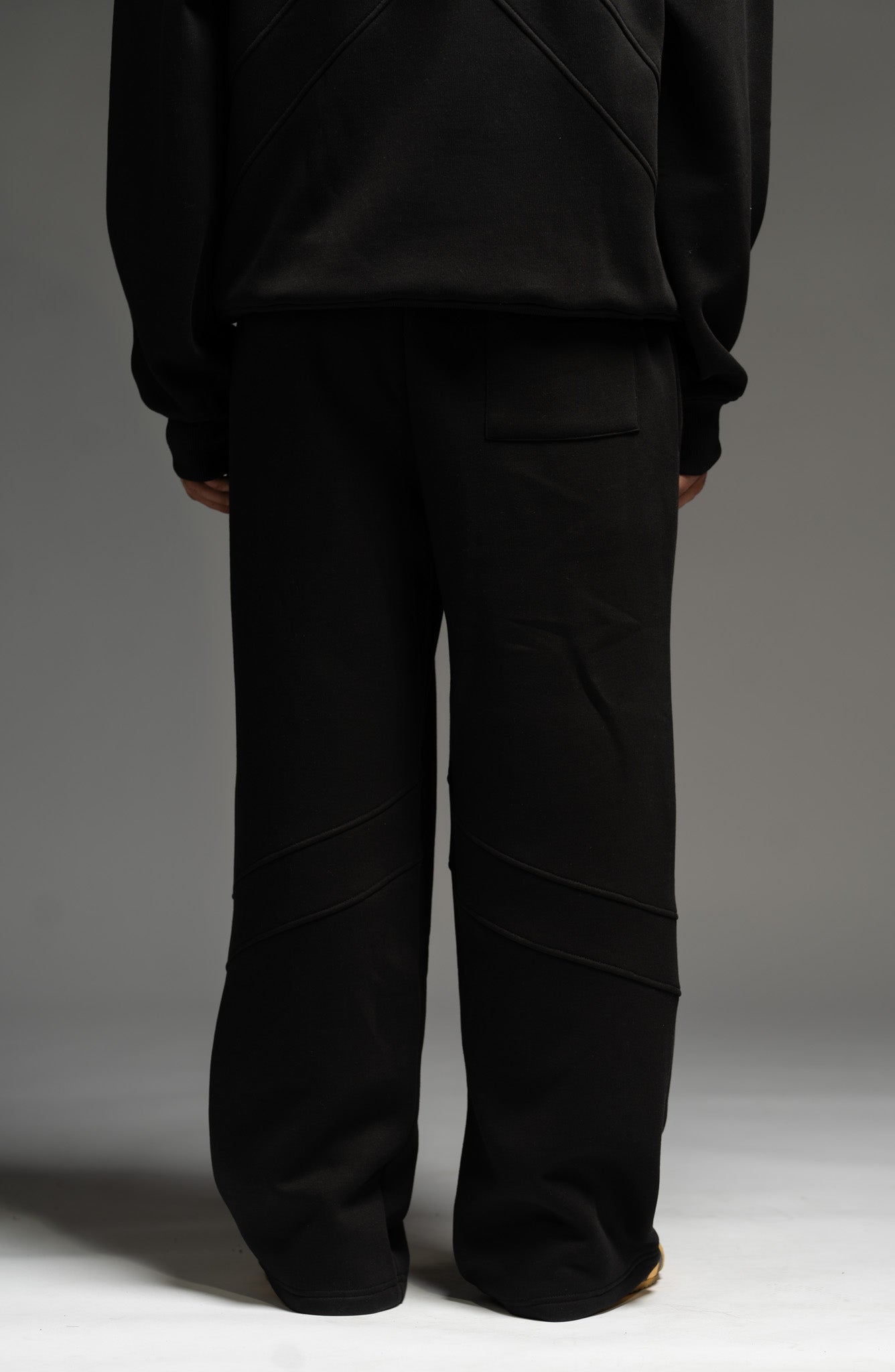 Baggy black sweatpants made from premium fleece with curved cut-and-sew lines along the legs. Finished with tonal embroidery and a clean back pocket for a refined look.