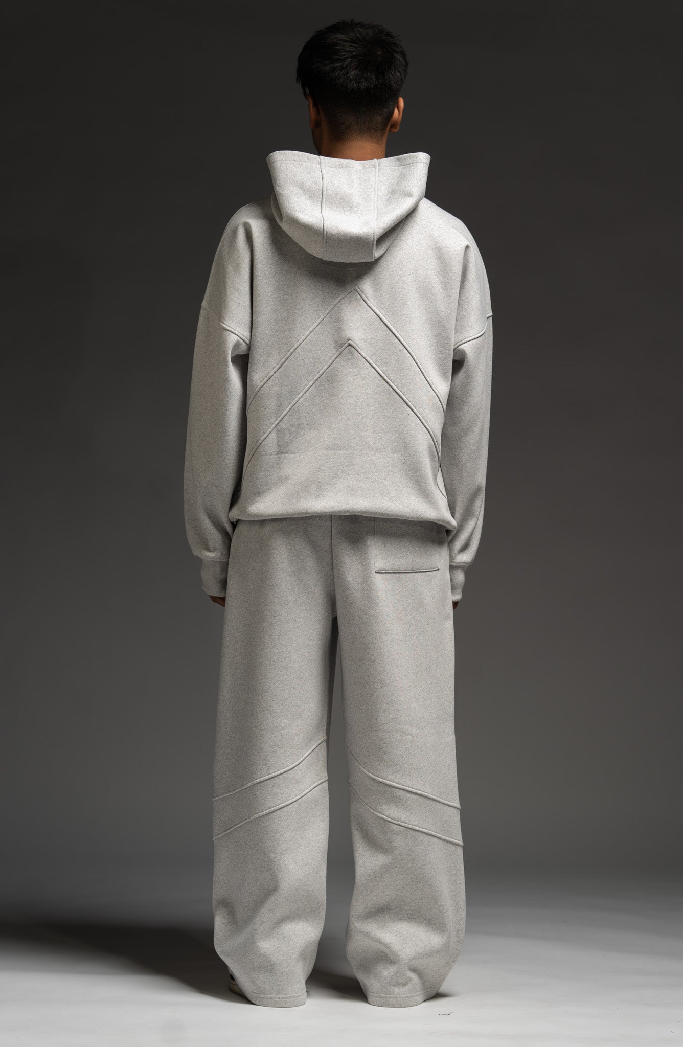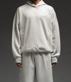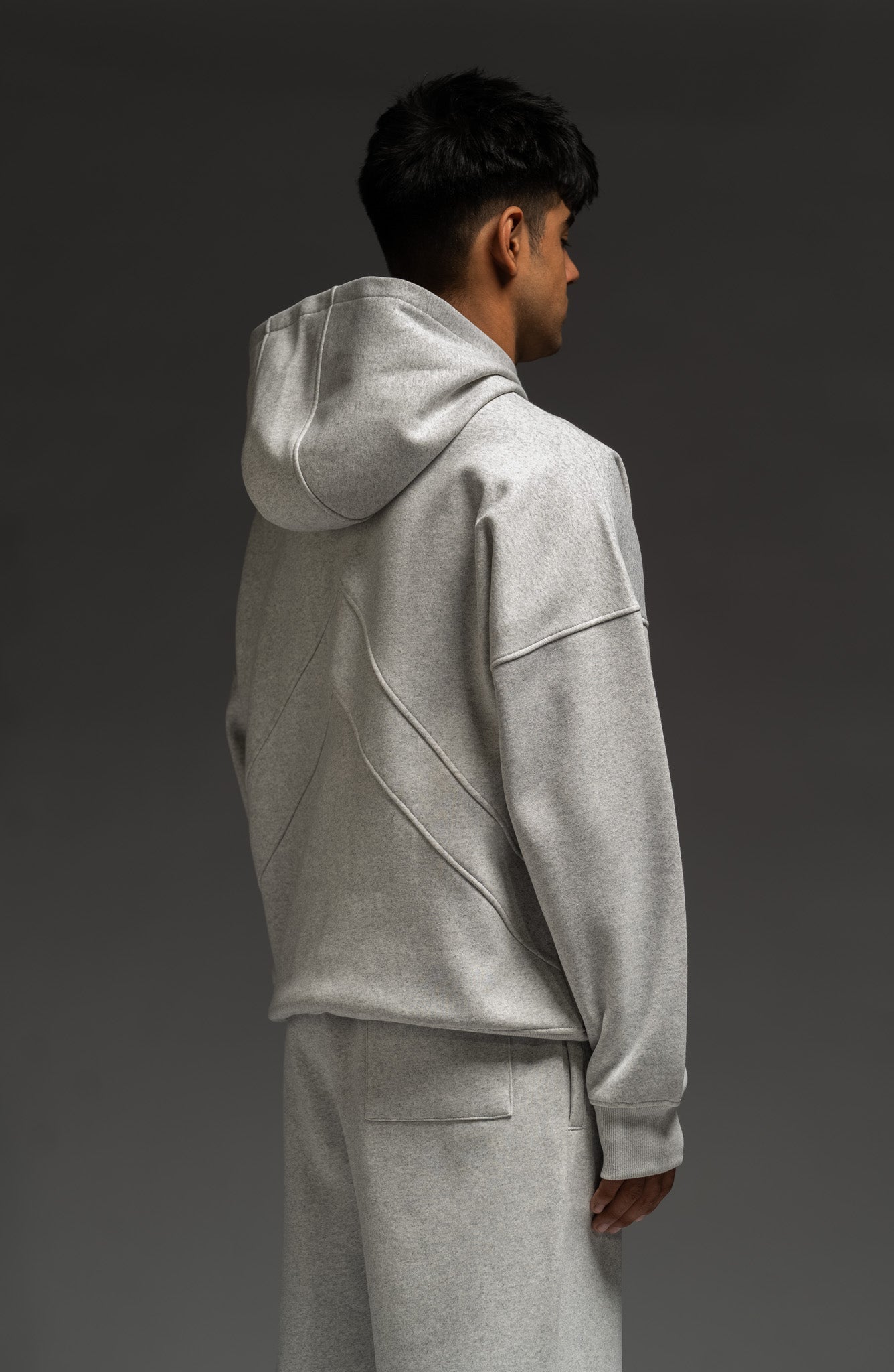 A rich grey hoodie featuring Ruene’s signature cut-and-sew detailing on the back and tonal embroidery on the front. Soft, structured, and built for a clean everyday silhouette.