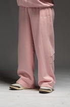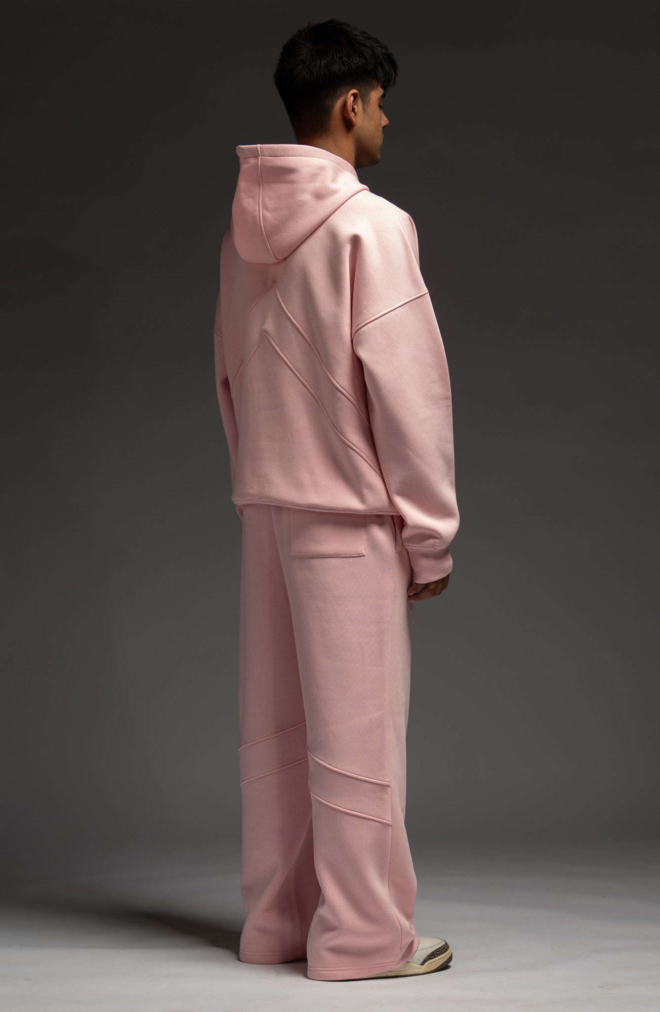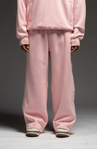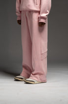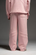 Baggy pink sweatpants made from premium fleece with curved cut-and-sew lines along the legs. Finished with tonal embroidery and a clean back pocket for a refined look.