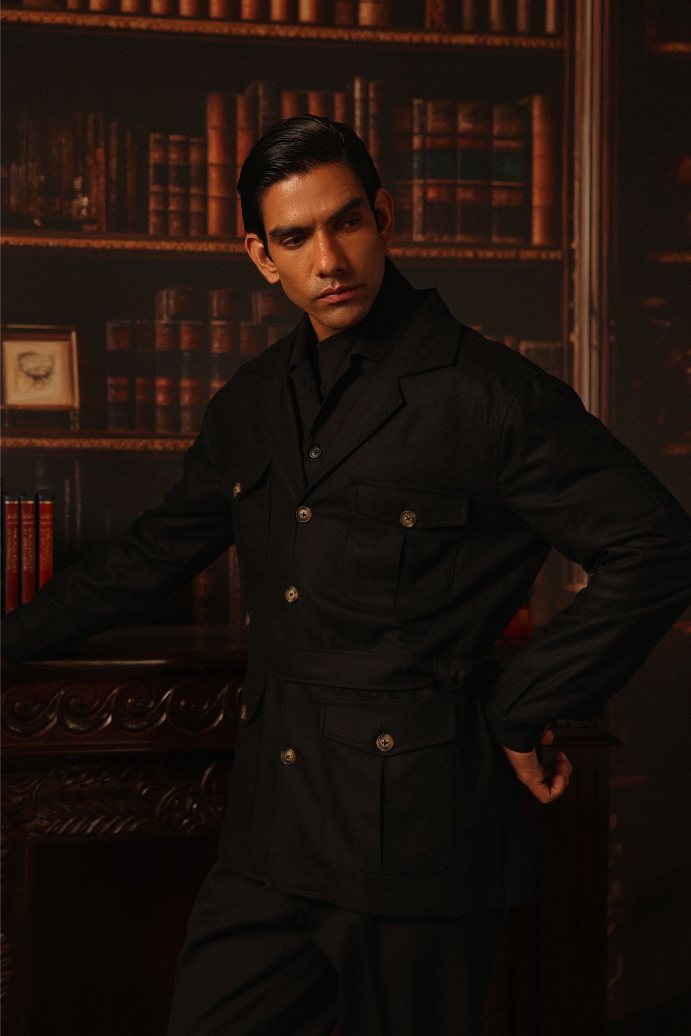 The Wake Your Dreams Safari Jacket is made from the exceptional 110 VBC fabric—a heritage dating back to 1663, representing the pinnacle of fabric excellence. Featuring a subtle fabric belt and hornbill buttons, it elevates any ensemble.