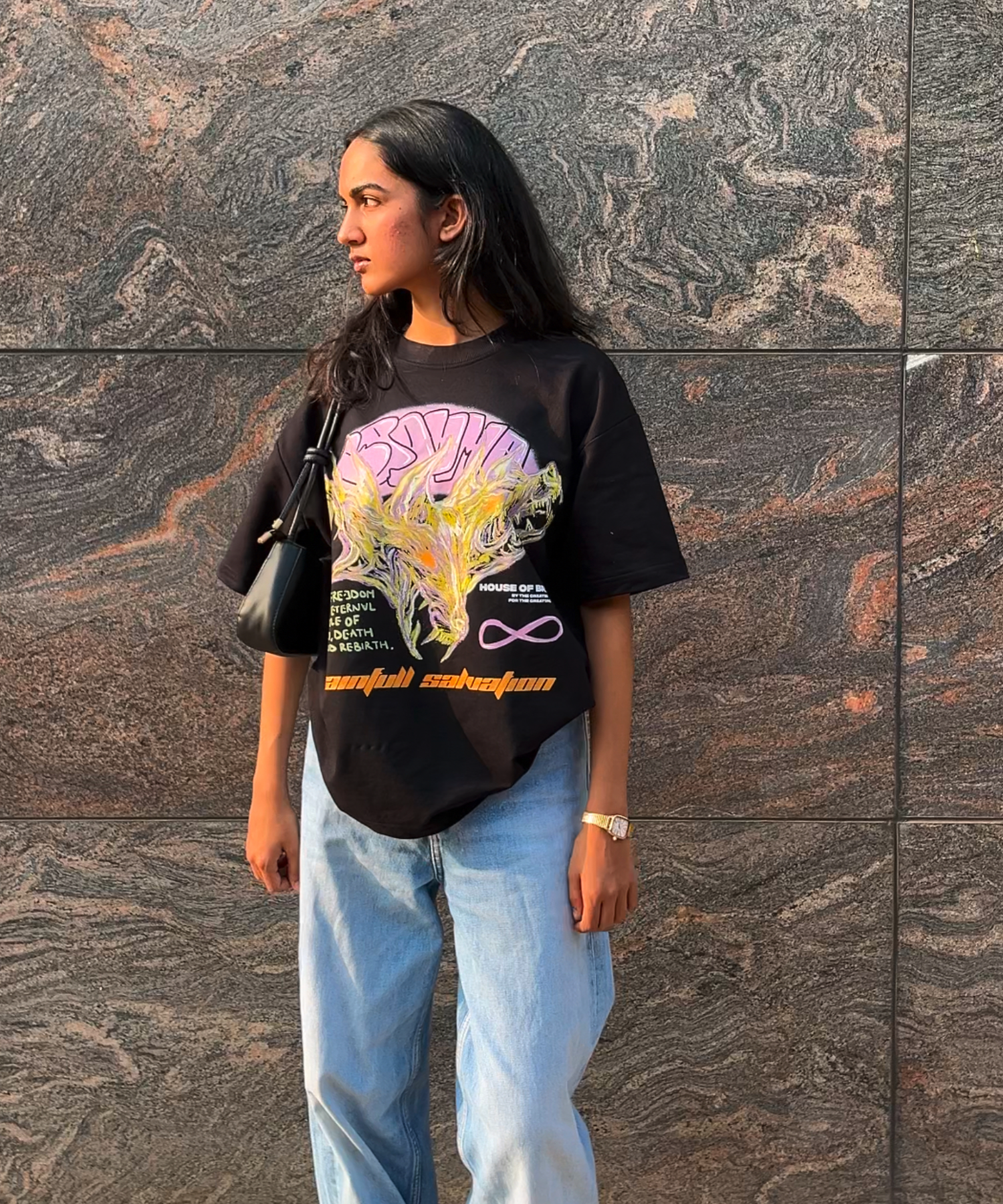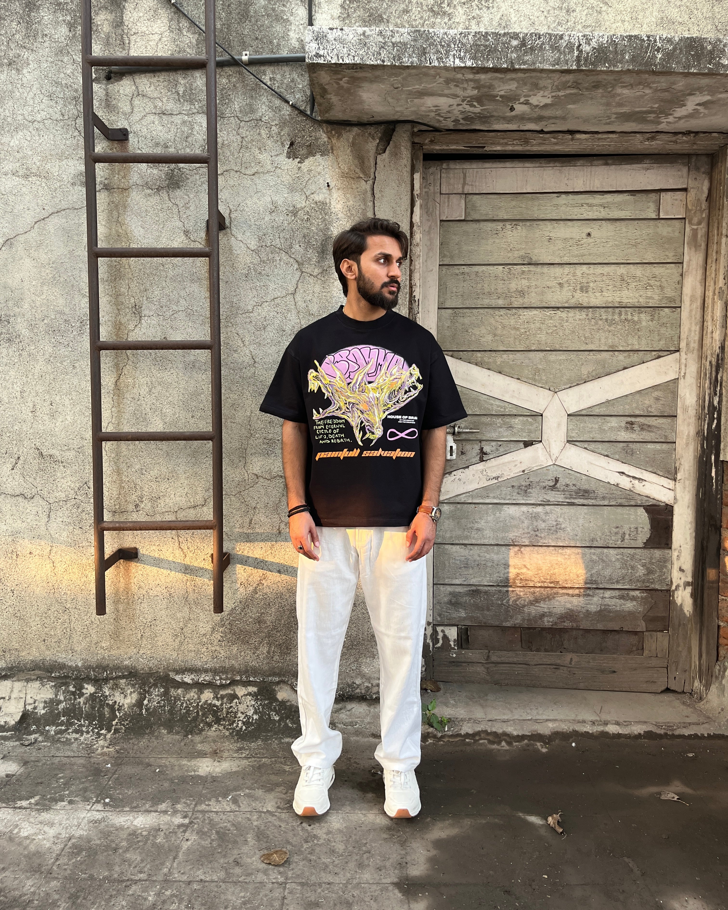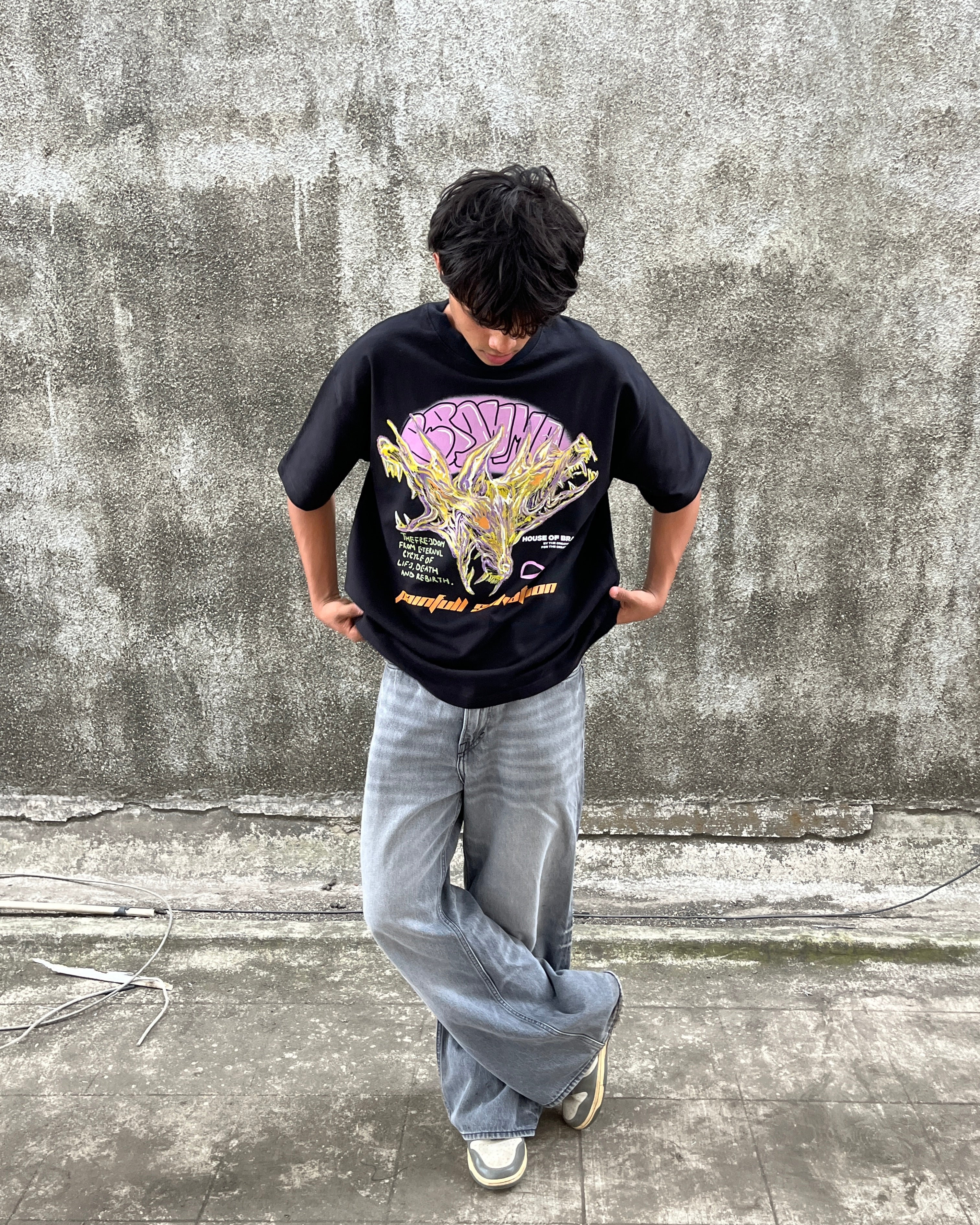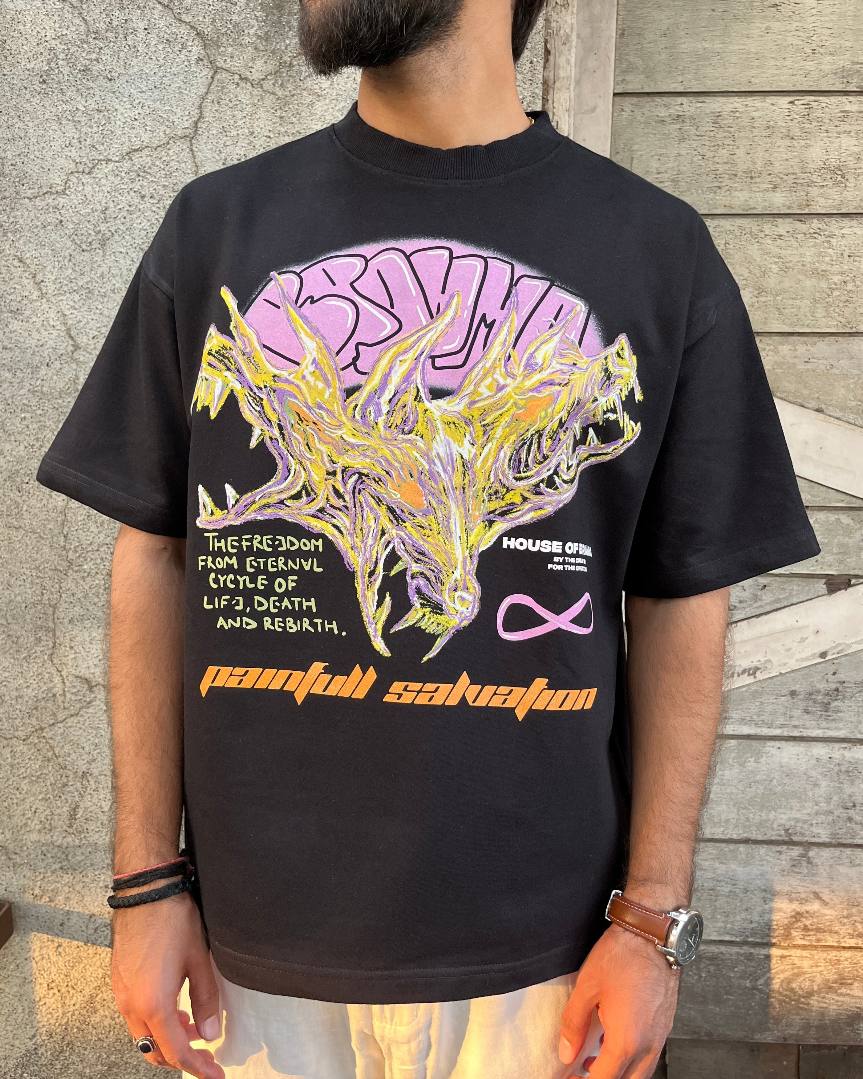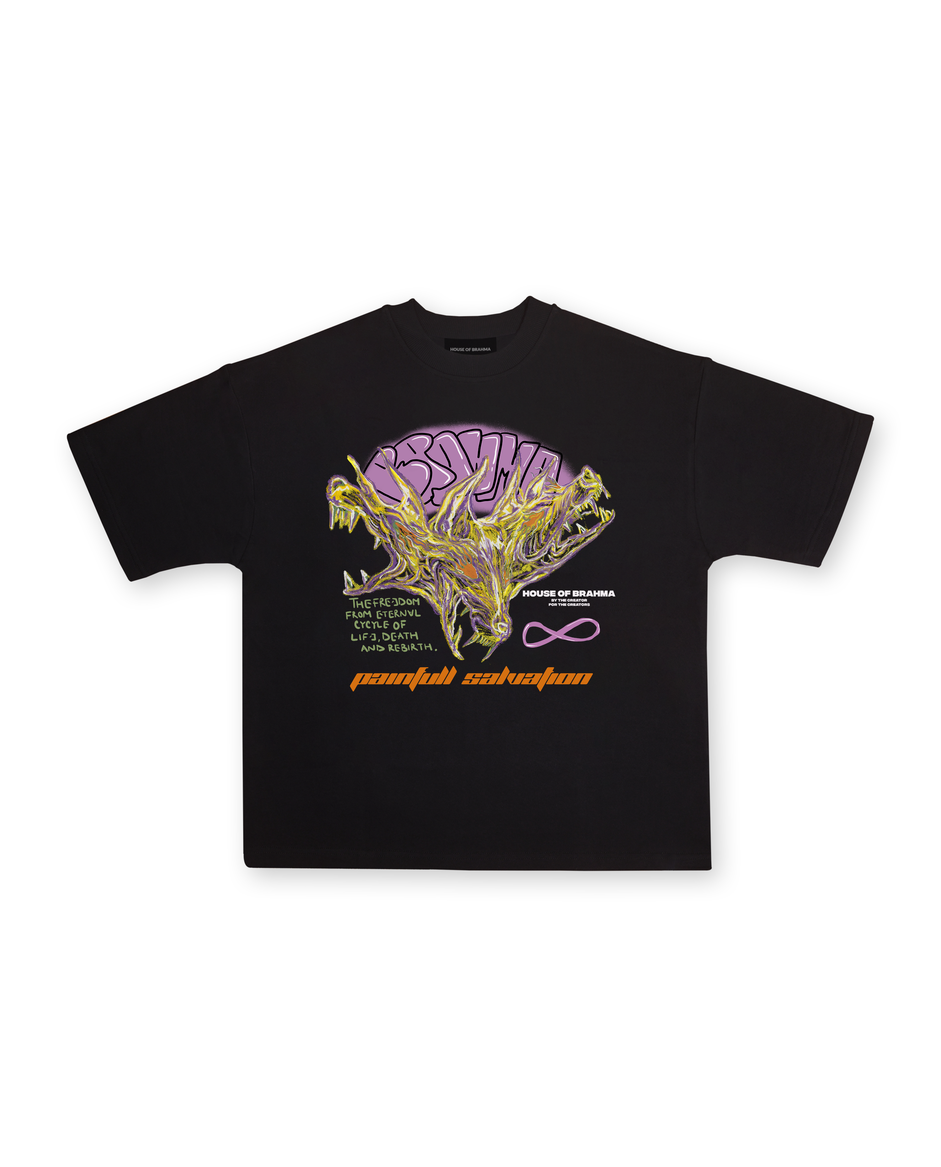 The front of the t-shirt is adorned with a powerful, super artsy illustration of a mythical three-headed creature, symbolising the guardianship over sins and the struggle for redemption. Below this fierce imagery is a profound quote: "The freedom from the eternal cycle of life, death, and rebirth." This evokes the philosophical concept of karma and the arduous path to enlightenment, further emphasised by the phrase "Painful Salvation" positioned beneath the artwork.