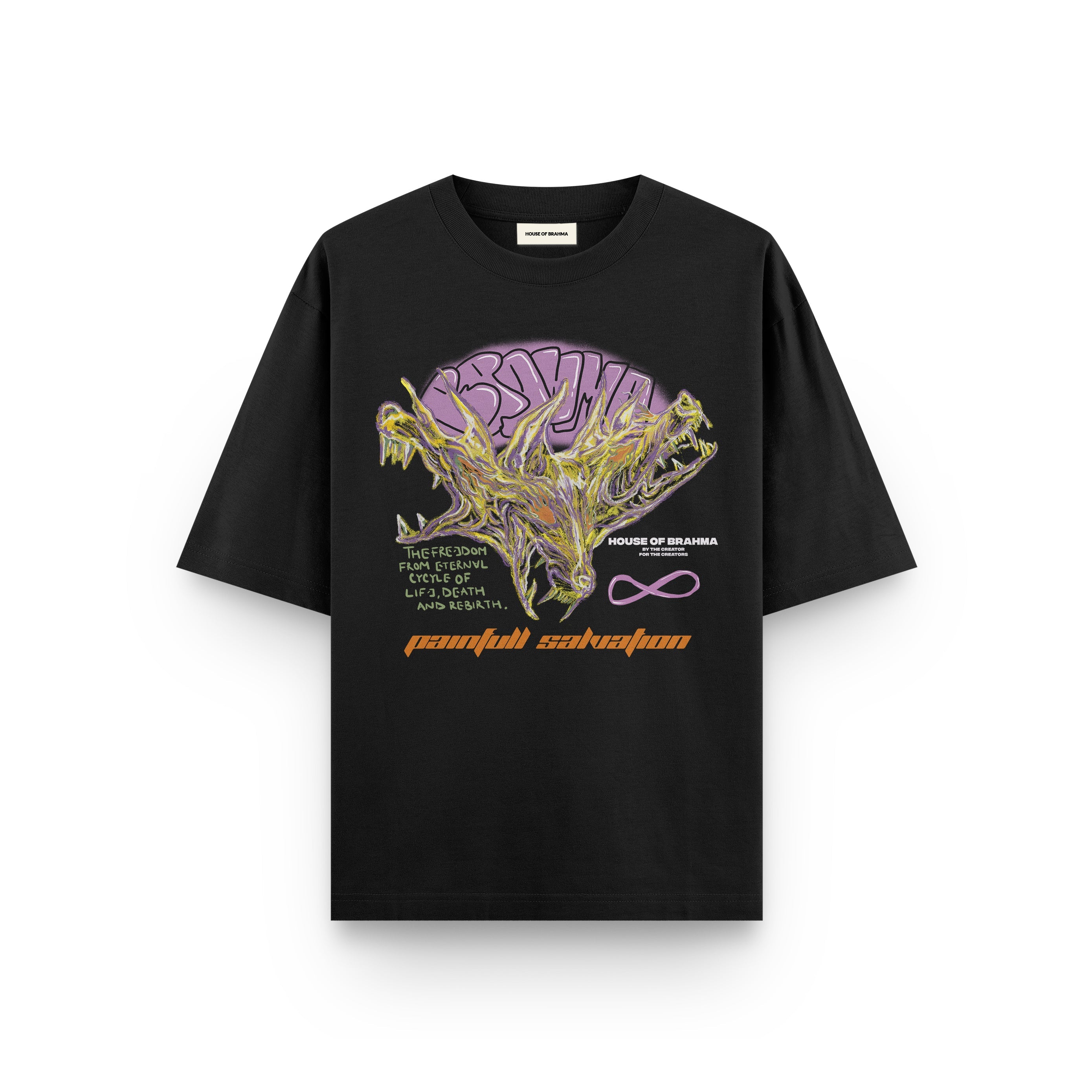 The front of the t-shirt is adorned with a powerful, super artsy illustration of a mythical three-headed creature, symbolising the guardianship over sins and the struggle for redemption. Below this fierce imagery is a profound quote: "The freedom from the eternal cycle of life, death, and rebirth." This evokes the philosophical concept of karma and the arduous path to enlightenment, further emphasised by the phrase "Painful Salvation" positioned beneath the artwork.