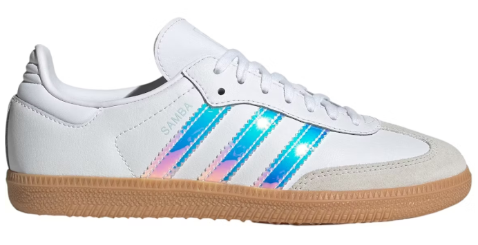 The Samba OG Iridescent Stripe White combines classic design with a modern twist. Featuring the iconic Samba silhouette, this sneaker offers durable leather construction and enhanced traction from its gum rubber outsole. The iridescent stripes add a subtle yet striking visual appeal, making it a versatile choice for both casual wear and athletic use. Its low profile ensures comfort and flexibility, ideal for those seeking a blend of heritage style and contemporary detail.
