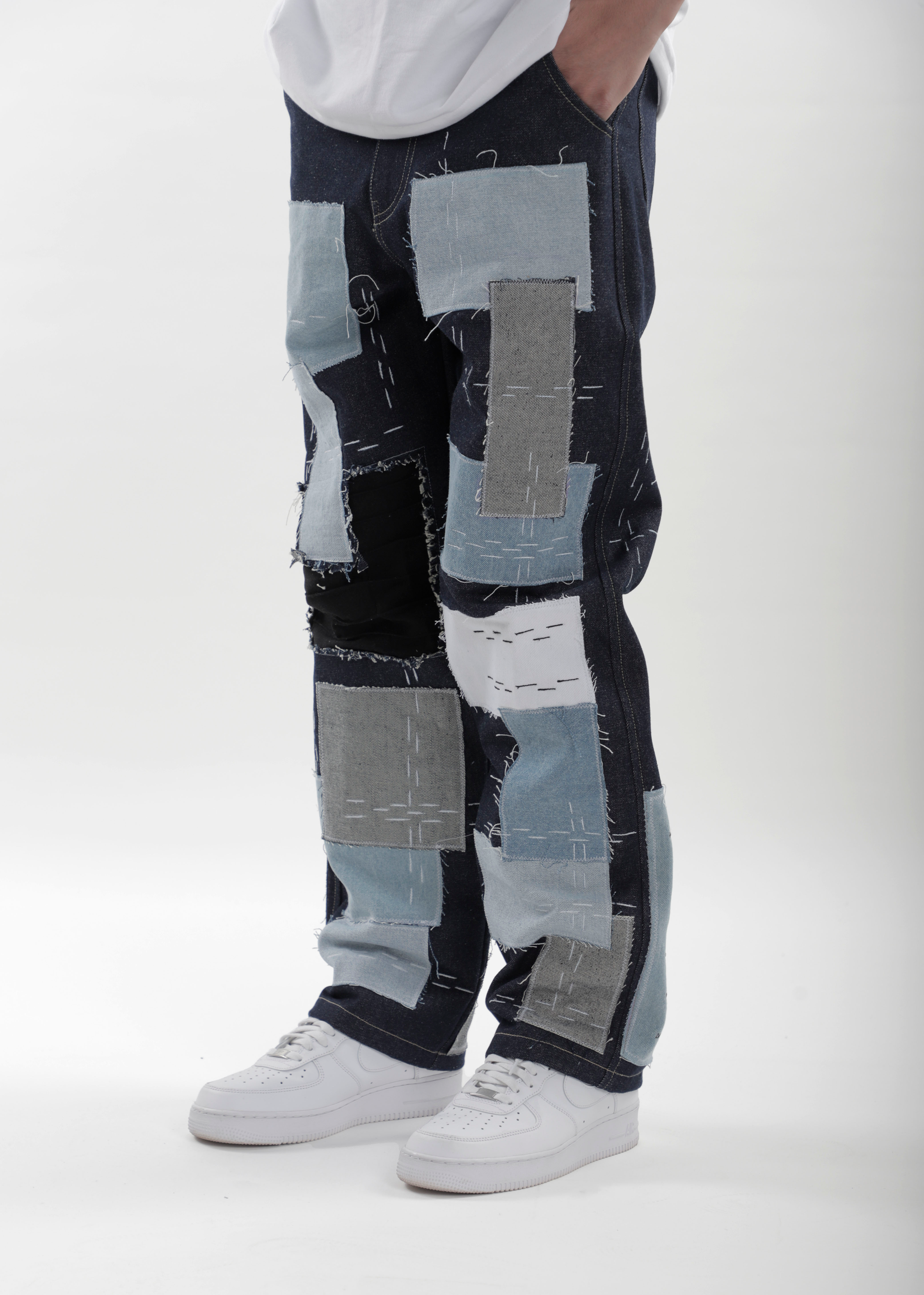 Inspired by sashiko and boro techniques this patchwork denim utilises a range of different denim fabrics and stitching techniques to give you a one-off denim unlike any other in your collection.