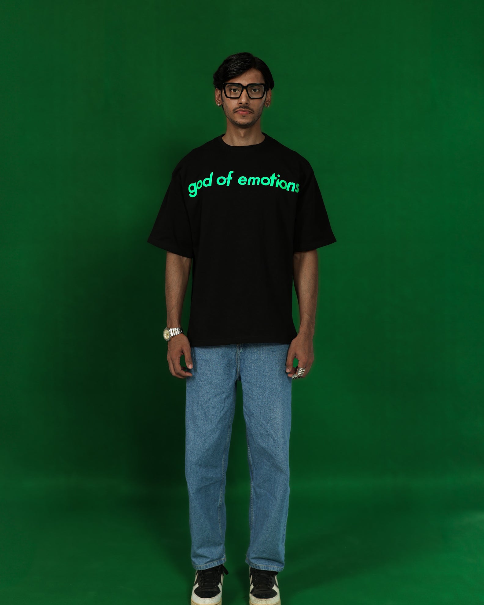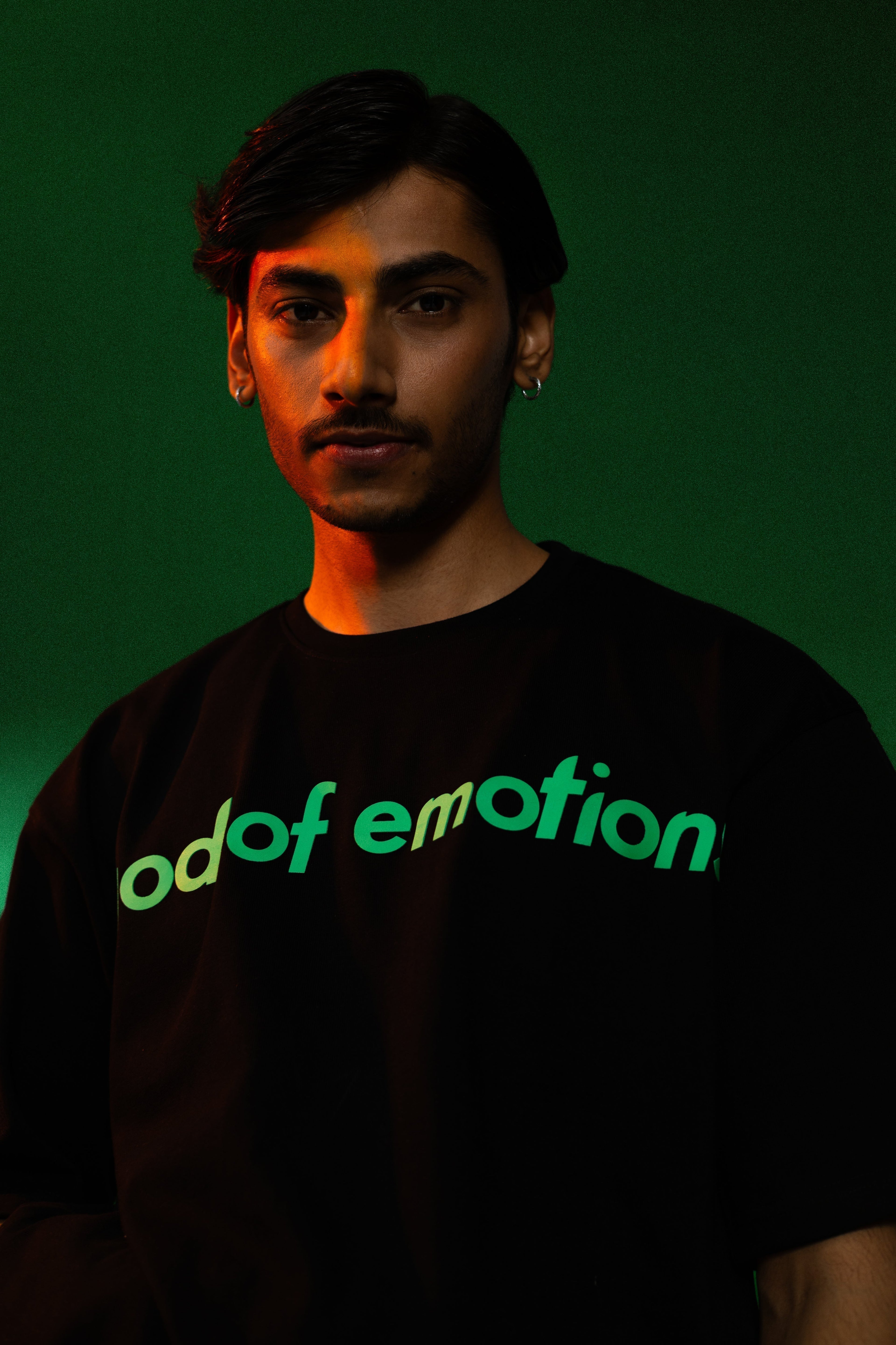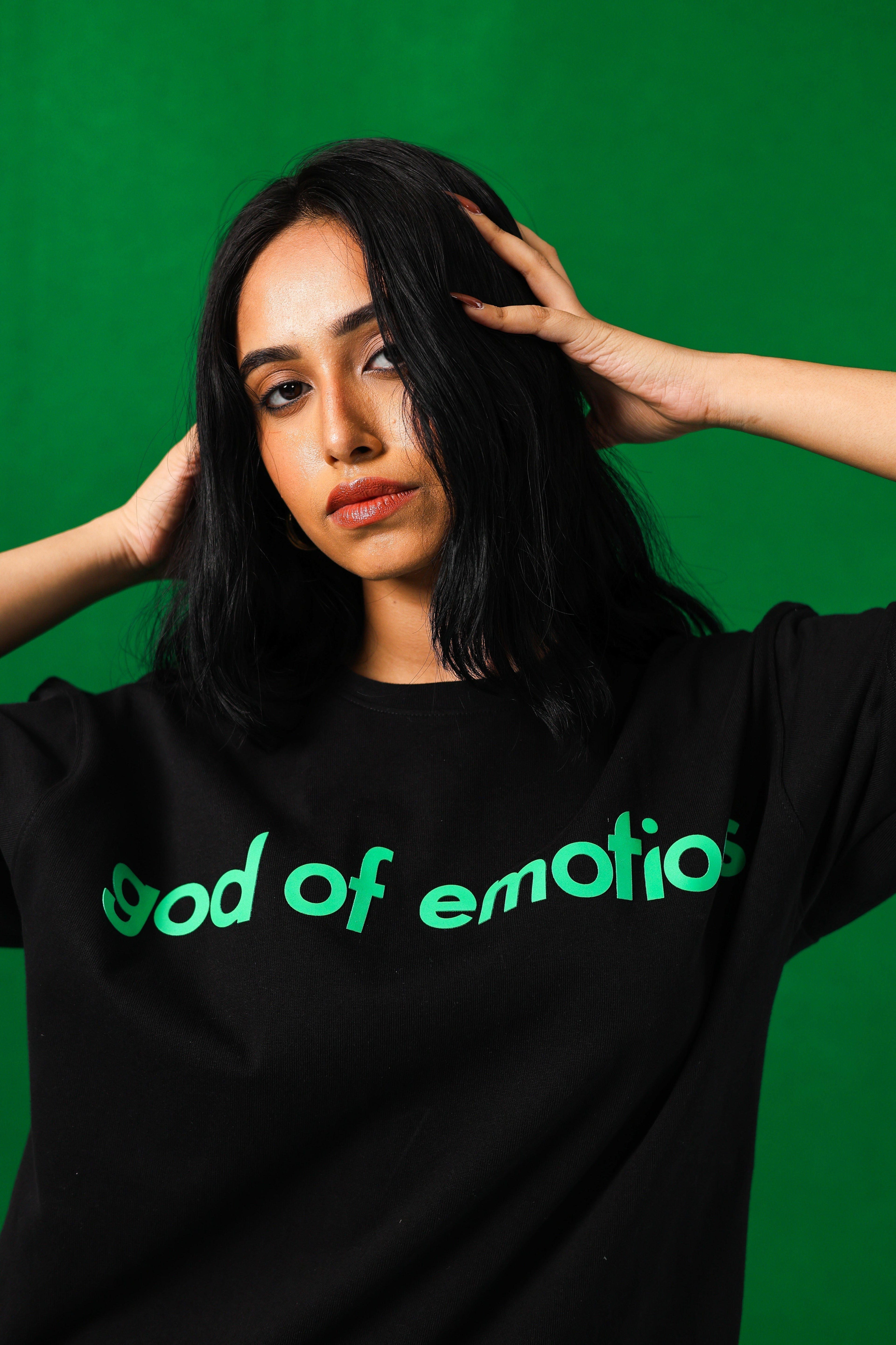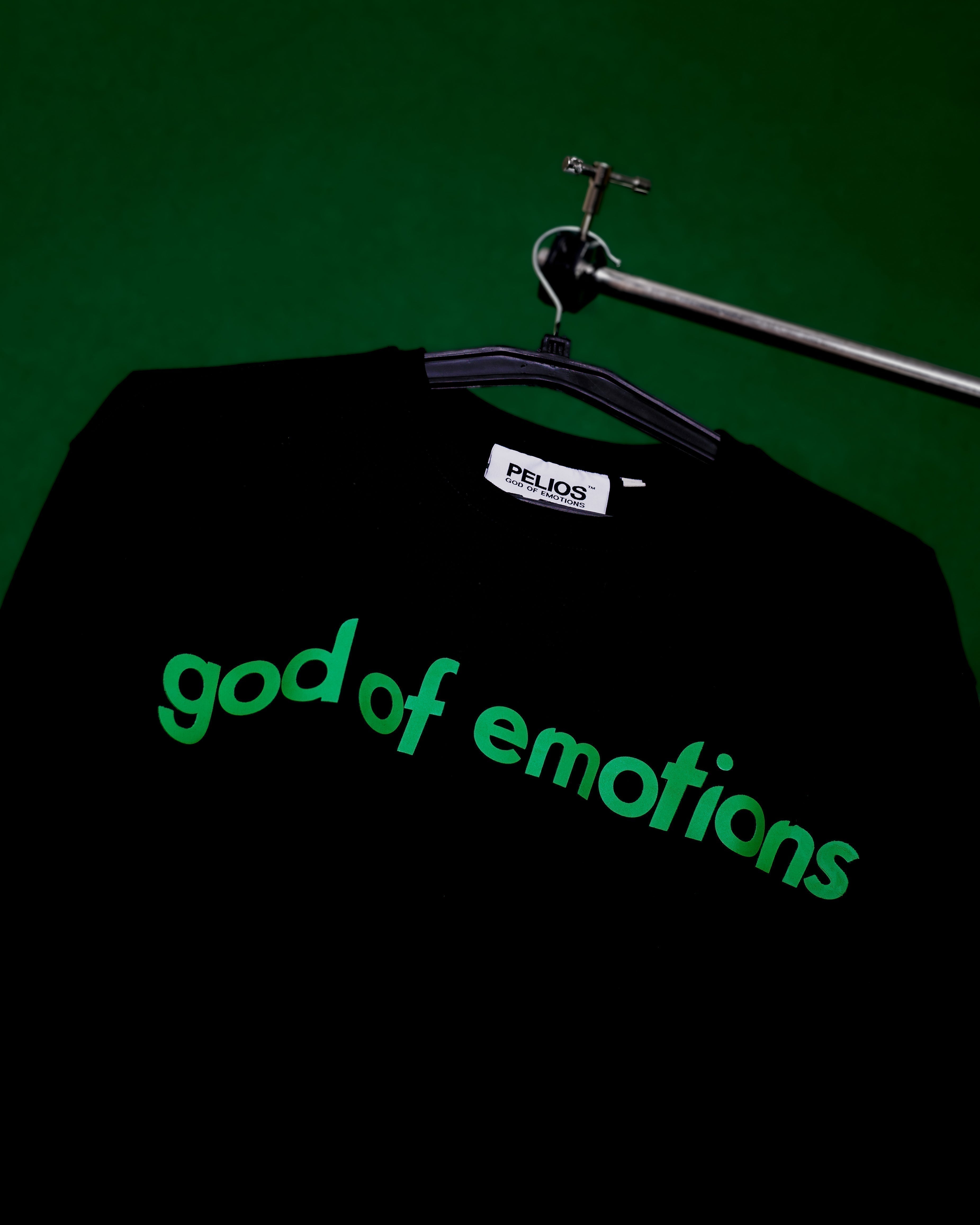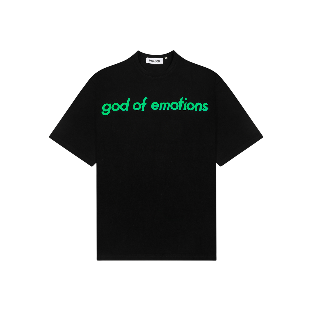 A TIMELESS, CONCEPTUAL TEE IN DEEP BLACK, DESIGNED TO EVOKE THE QUIET INTENSITY OF LONGING. THE FRONT FEATURES THE GOD OF EMOTIONS LOGO, SCREEN-PRINTED IN IVY GREEN / A SYMBOL OF GROWTH, REGRET, AND STILLNESS.
