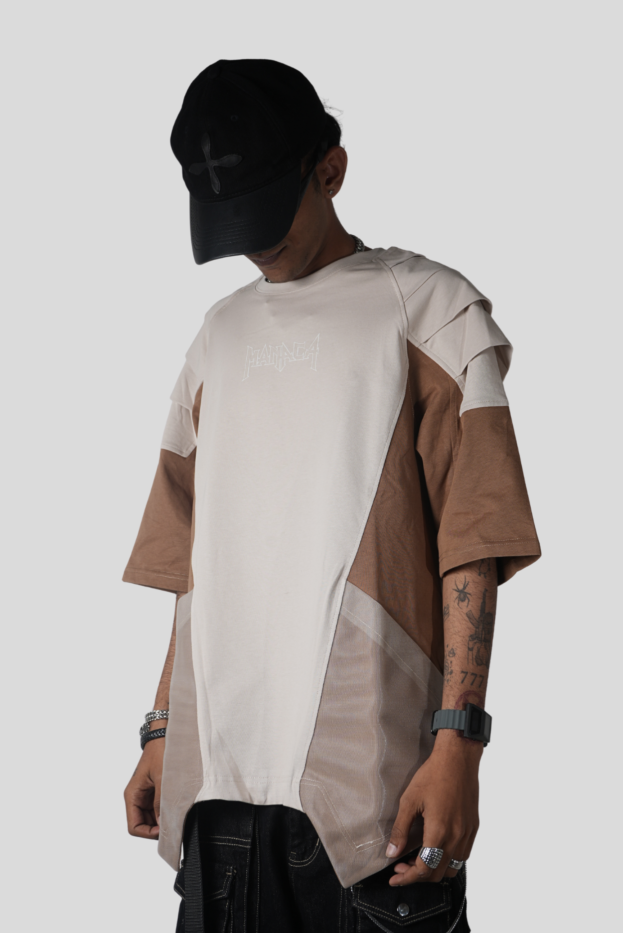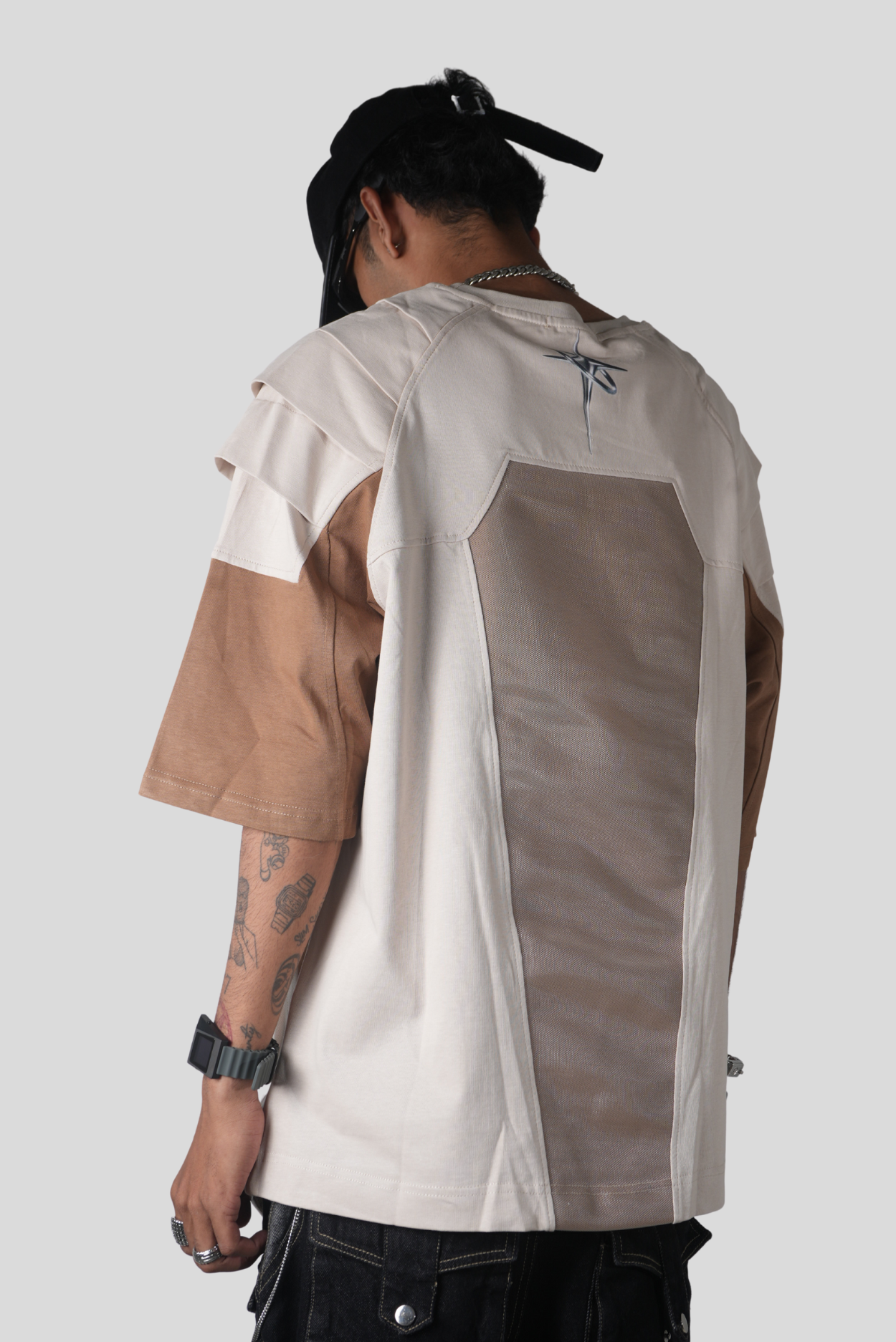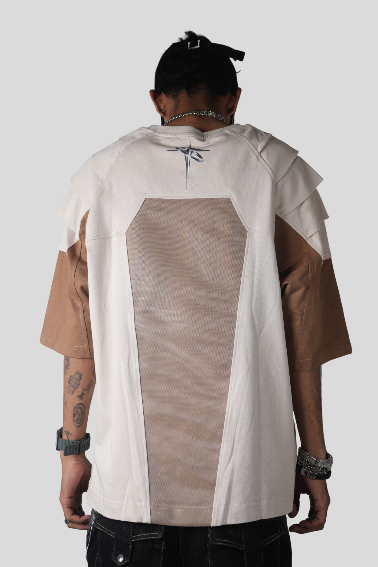 Futurism meets functionality with the SHELL VI BRG — a next-gen streetwear tee designed to blur the line between utility and art. This multi-panelled silhouette features layered sleeve construction and a structured geometric back panel, bringing depth and movement to an oversized profile. The neutral brown and beige palette creates a refined yet experimental aesthetic, while the metallic emblem on the upper back injects a bold futuristic edge.