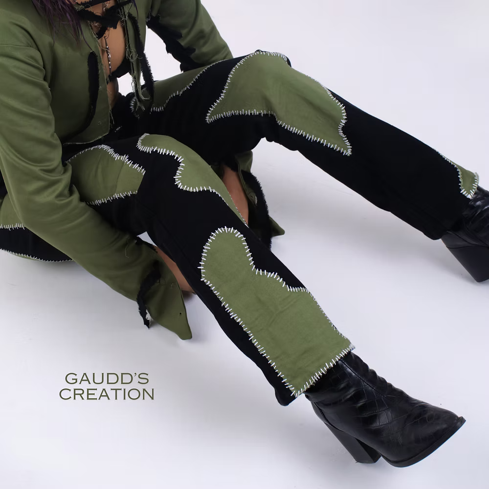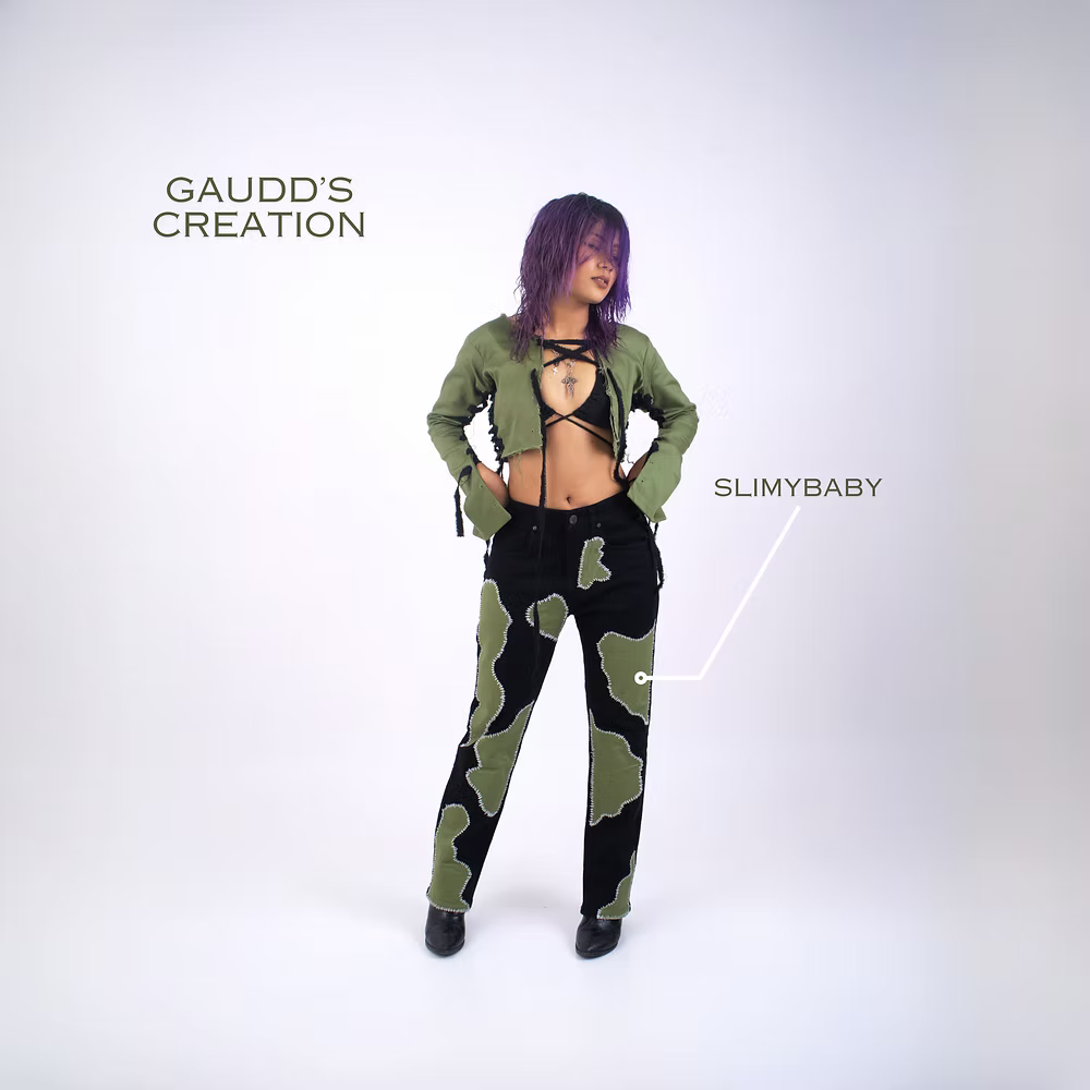 These jeans are more than clothing; they're a canvas of creativity, adorned with meticulously hand-sewn green patchwork in whimsical slimy shapes.