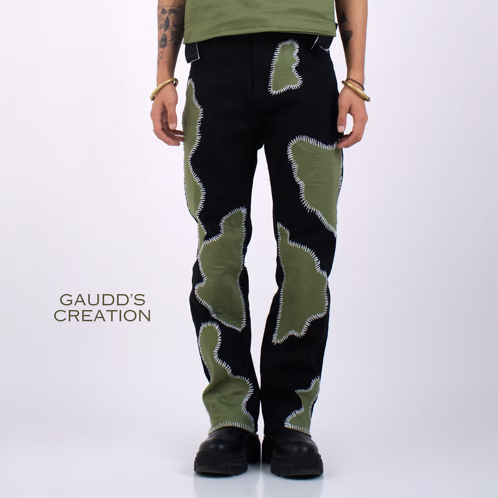 The pristine Black denim base provides a pristine canvas for this visual masterpiece, offering both style and durability. The hand-sewn green patchwork takes center stage, weaving a story of nature's beauty with each stitch. Crafted by skilled artists, these patches are not just artistry; they are a labor of love.
