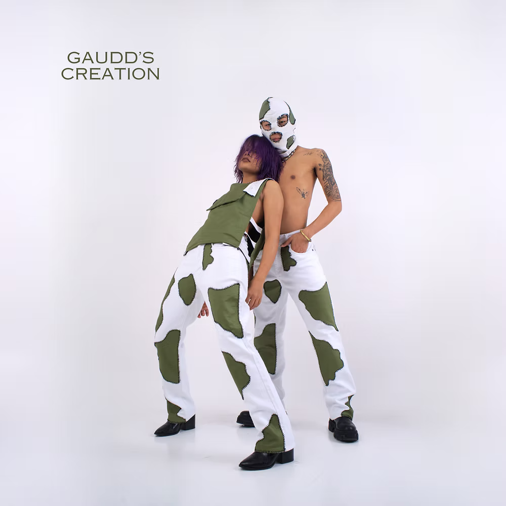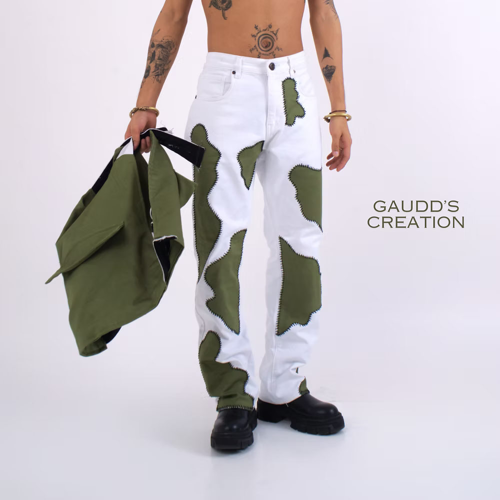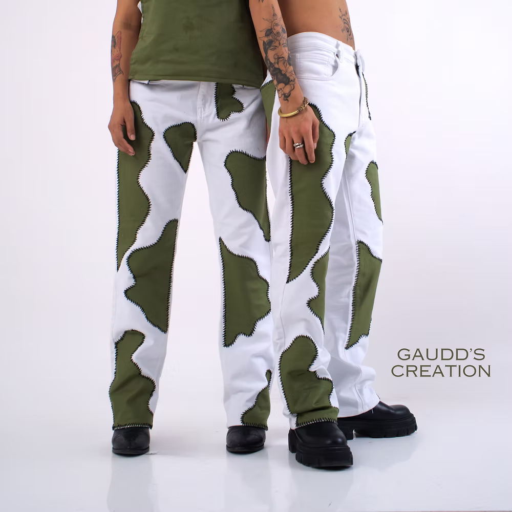These jeans are more than clothing; they're a canvas of creativity, adorned with meticulously hand-sewn green patchwork in whimsical slimy shapes.