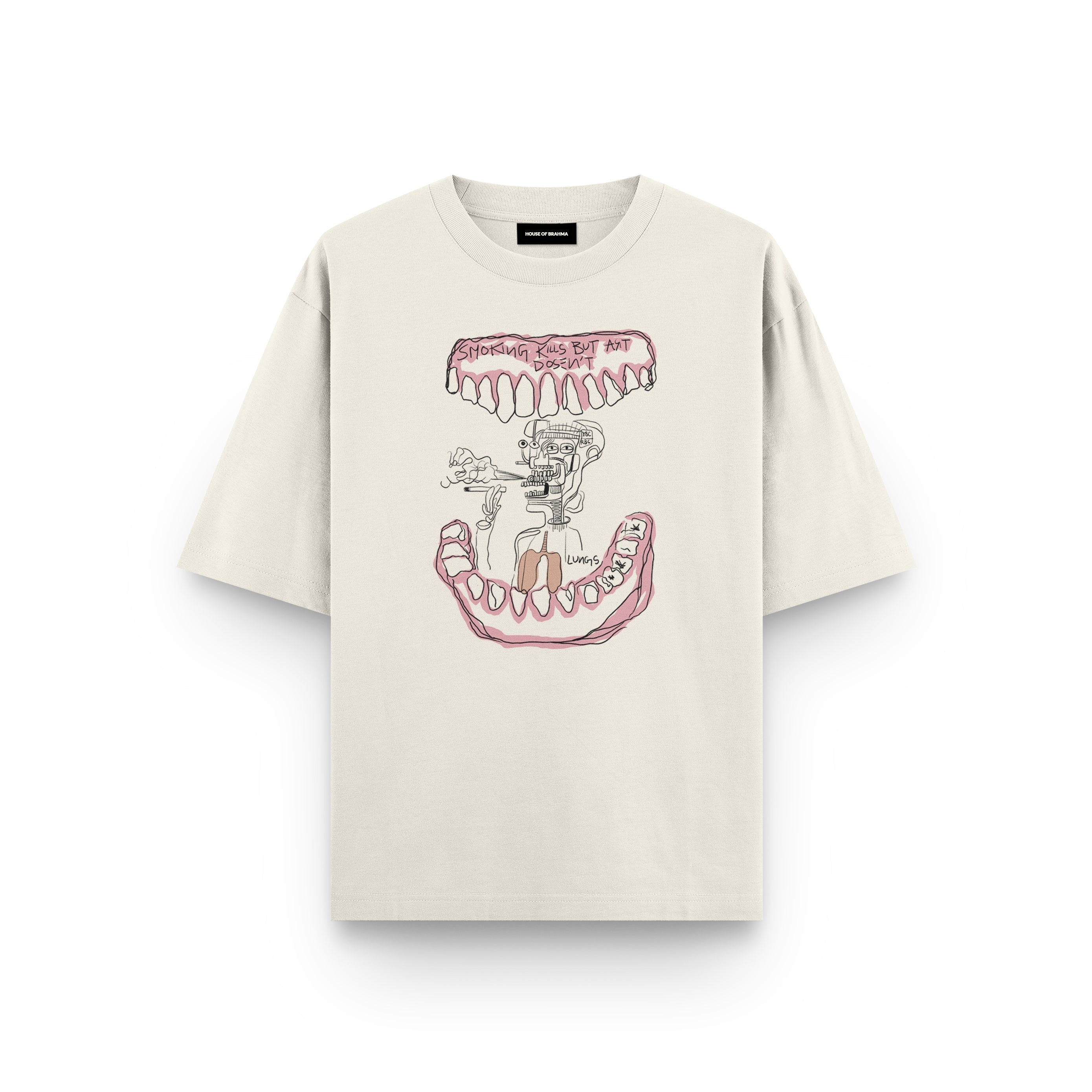But what really sets this piece apart is its striking artwork—a raw, eye-catching design featuring skeletal and mechanical elements. The powerful phrase, “Smoking Kills but Art Doesn't,” is framed by an iconic set of jagged teeth, adding layers of meaning and depth. It’s more than just a shirt—it’s a wearable piece of art, a conversation starter, and an expression of rebellion.