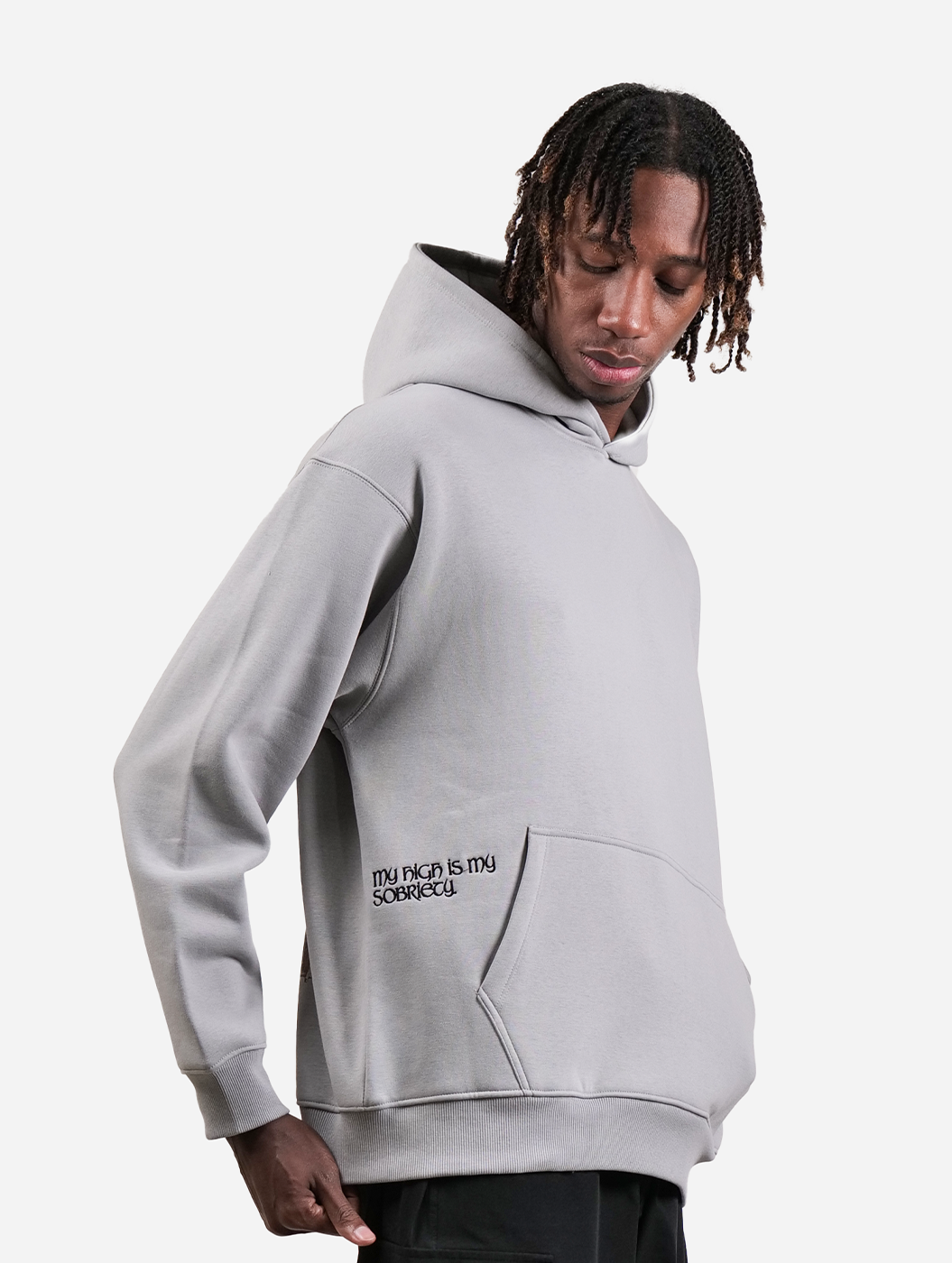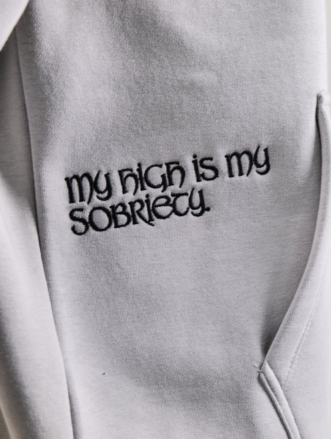 Introducing the Sobriety Hoodie, minimal design in a soothing grey pastel tone. Featuring an embroidered front artwork with the bold statement "My High is My Sobriety" and a striking digital print on the back, this hoodie merges subtle elegance with a powerful message. Crafted for comfort and durability, it offers a relaxed fit and a cozy hood, perfect for layering or wearing solo.
