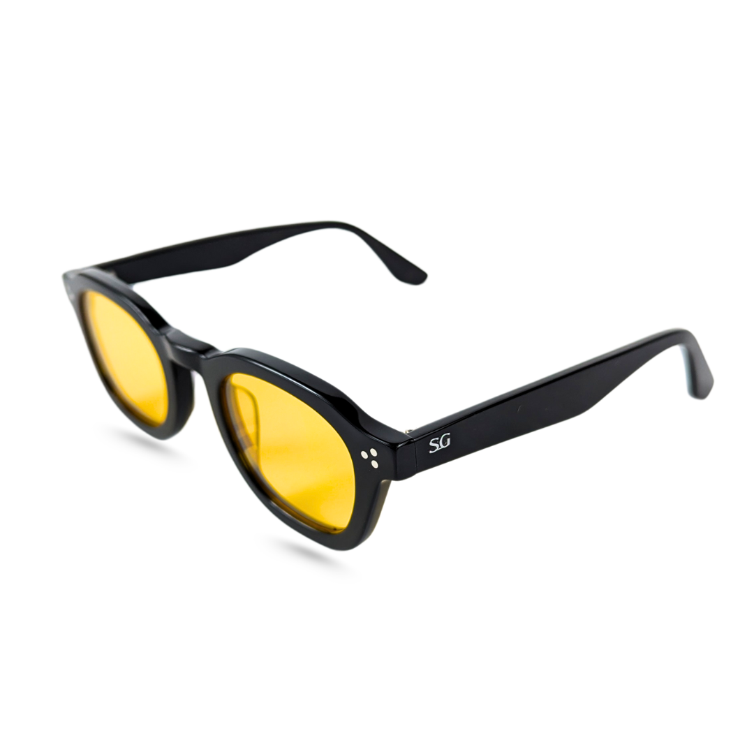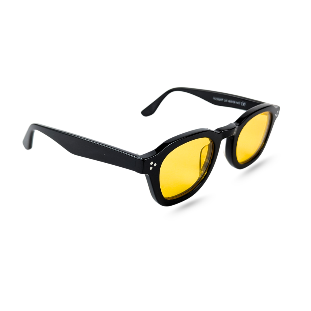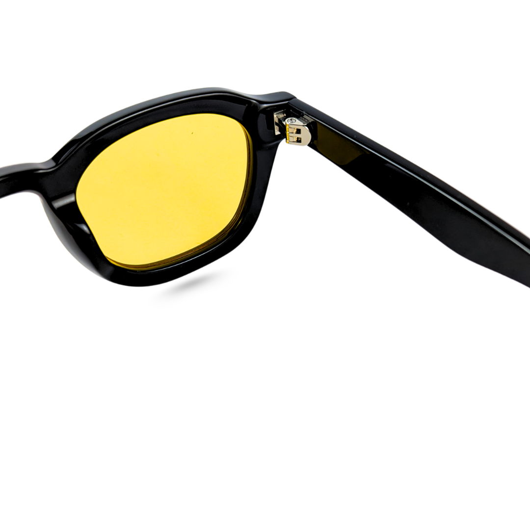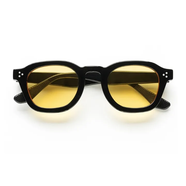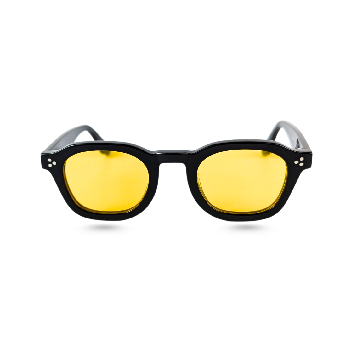 Description-Solar Muse is an ode to the thinkers, wanderers, and visionaries. Meticulously carved from rich black acetate and paired with luminous amber-yellow lenses, this frame balances vintage charisma with modern charm. The round silhouette and subtle rivet detailing add a dash of intellectual edge — ideal for those who turn heads without raising their voice.