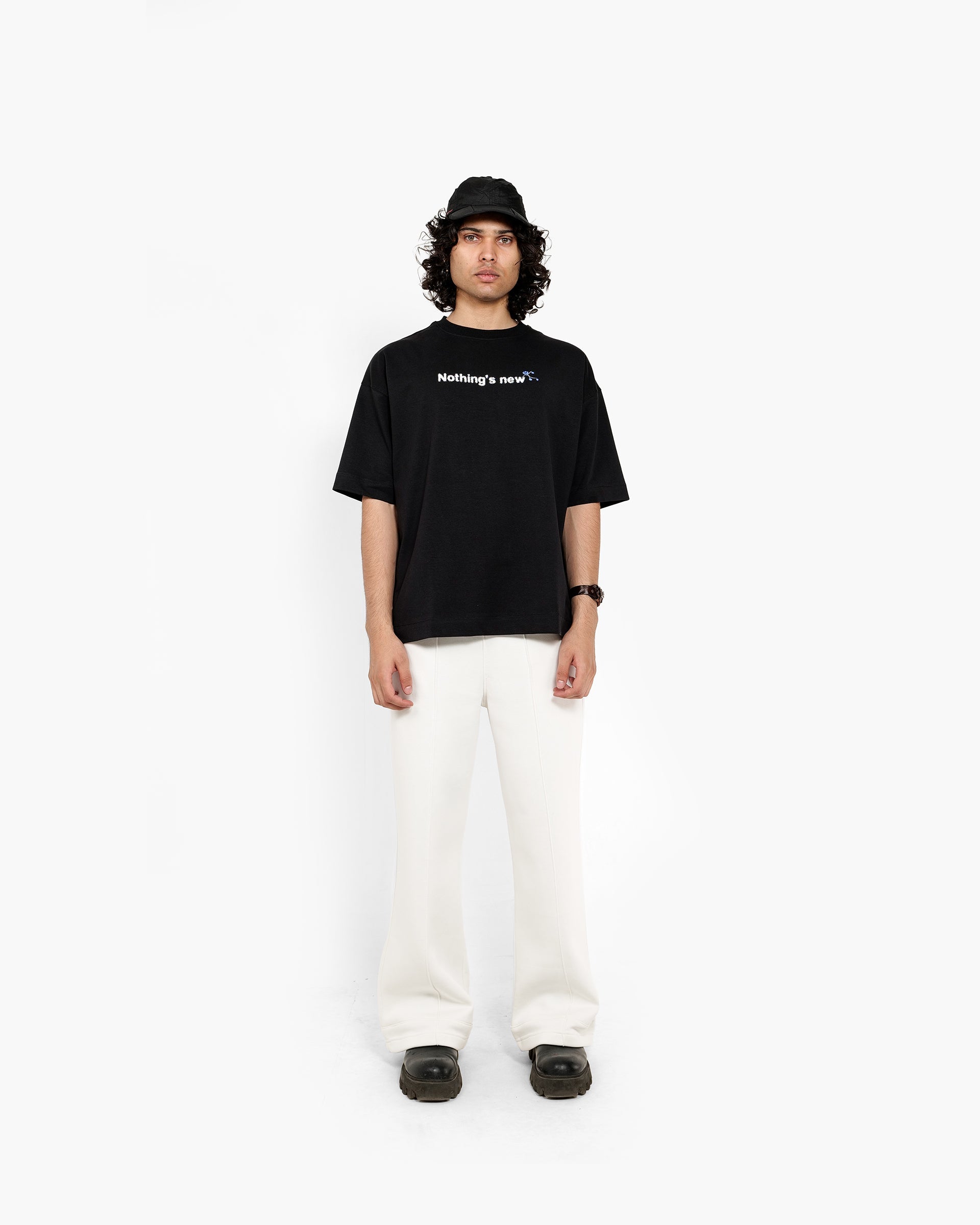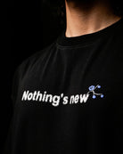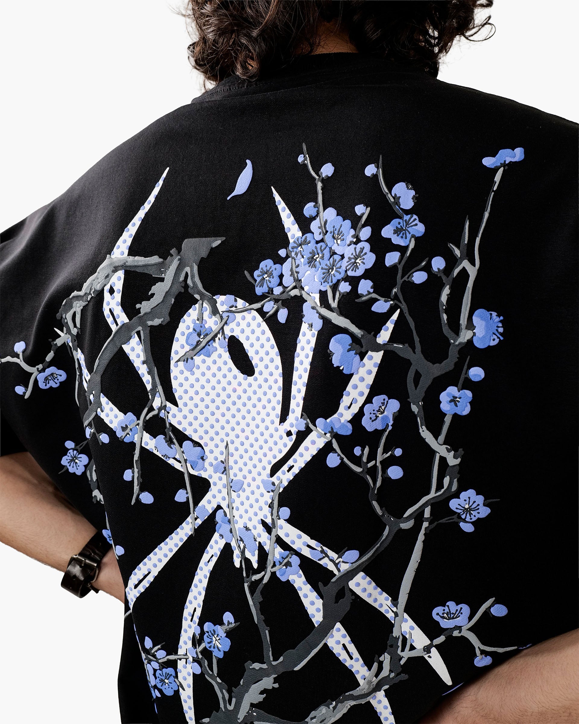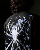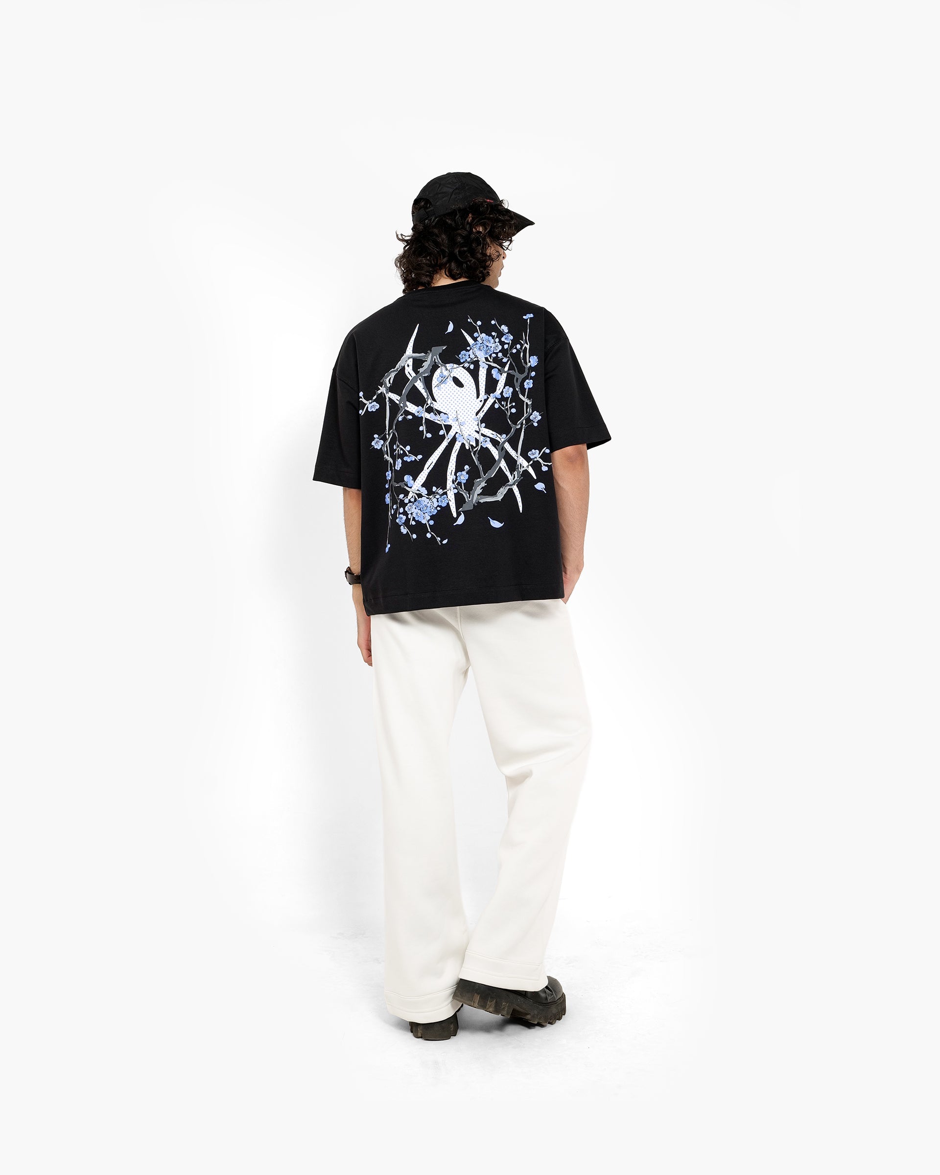 The Nothing’s New Spider Bloom Tee redefines dark elegance with a surreal fusion of grunge and florals. This black oversized unisex t-shirt features a minimalist front that reads “Nothing’s new” with a subtle floral accent, while the back steals the show with an intricate puff-printed spider entangled in blooming blue branches.