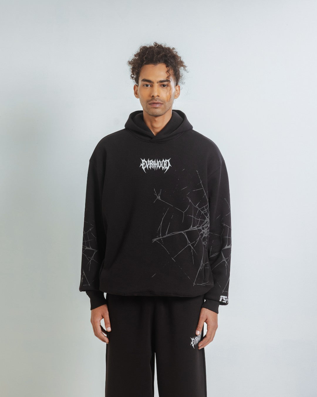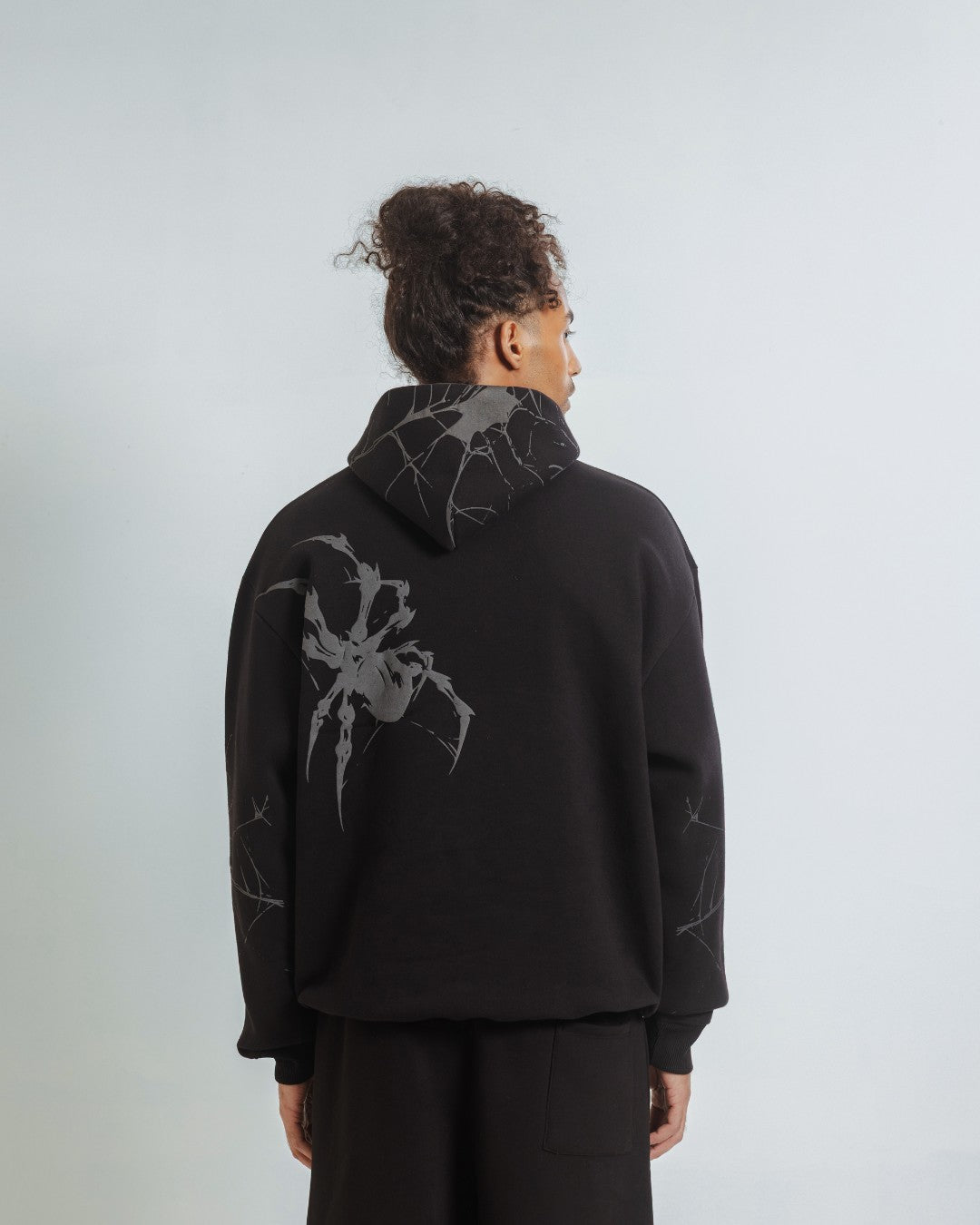A black hoodie featuring a puff-printed spider web design for added texture. Soft, comfortable, and easy to pair with anything. A clean graphic piece made for daily wear.