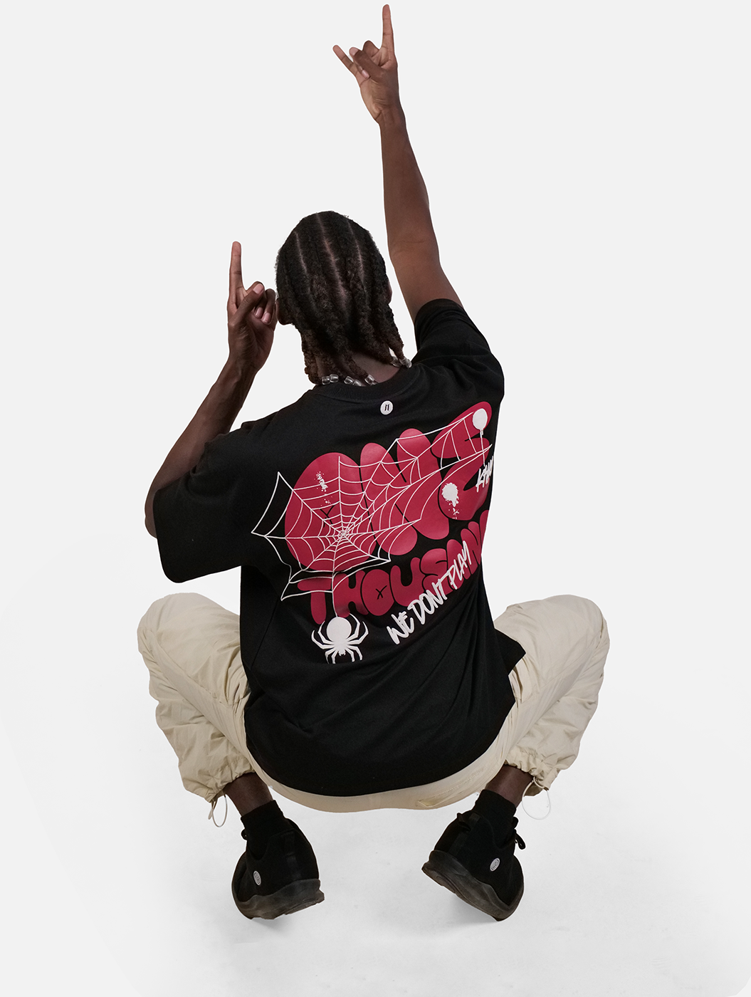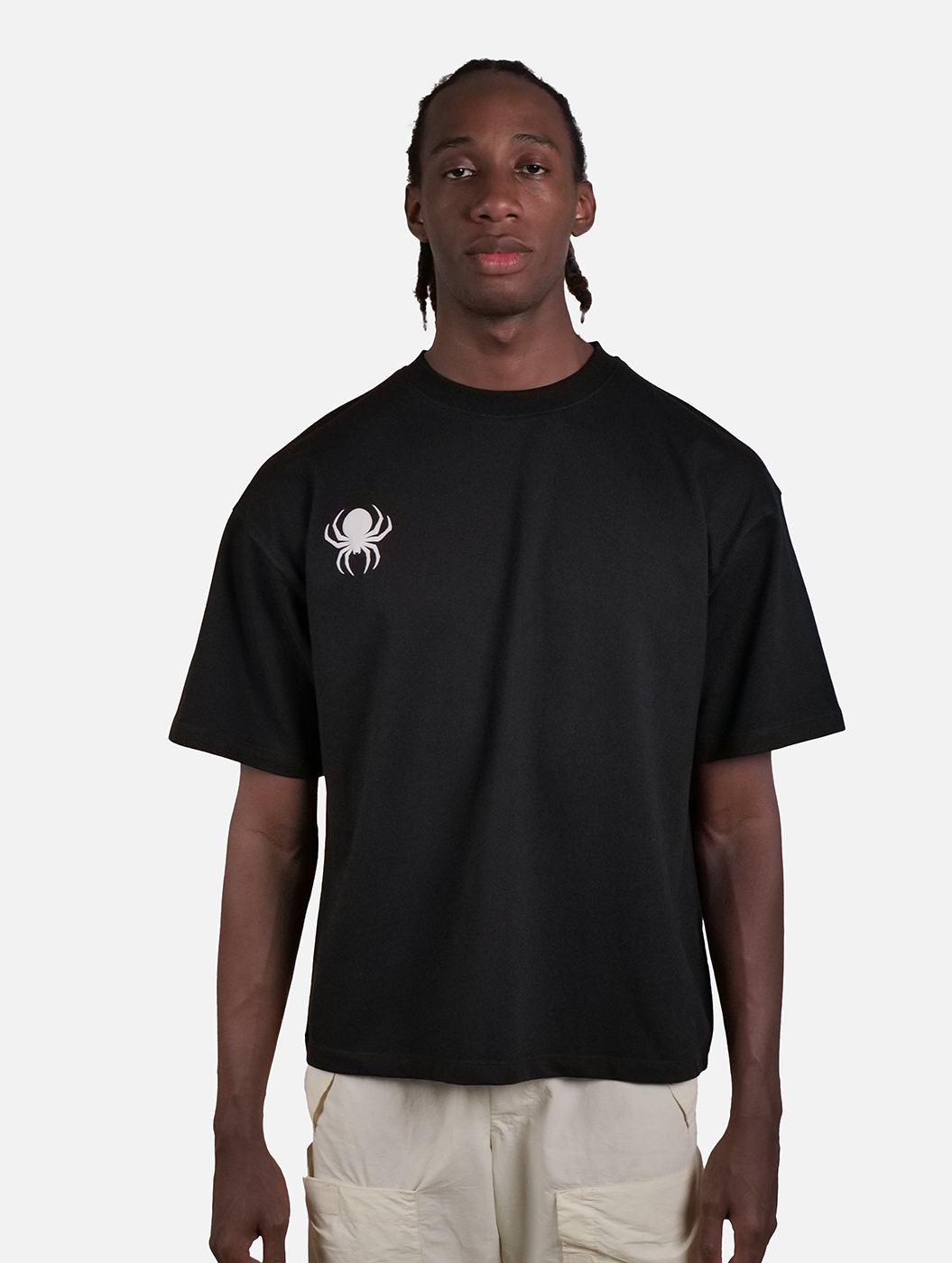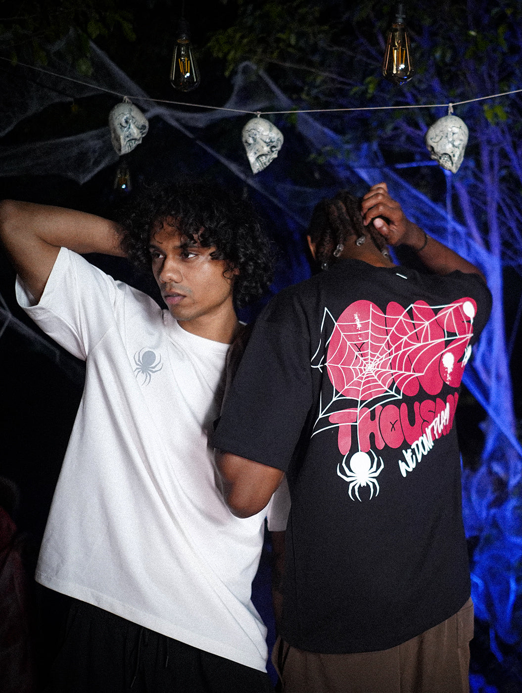 Presenting our oversized round-neck T-shirt with a striking spider web puff screen print on the back that adds an intriguing edge. Crafted from soft loop-knit terry, it provides a cozy feel and relaxed fit. Perfect for casual hangouts or lounging at home, this versatile piece effortlessly blends comfort and style for any laid-back occasion.