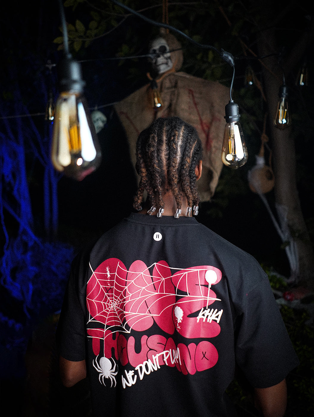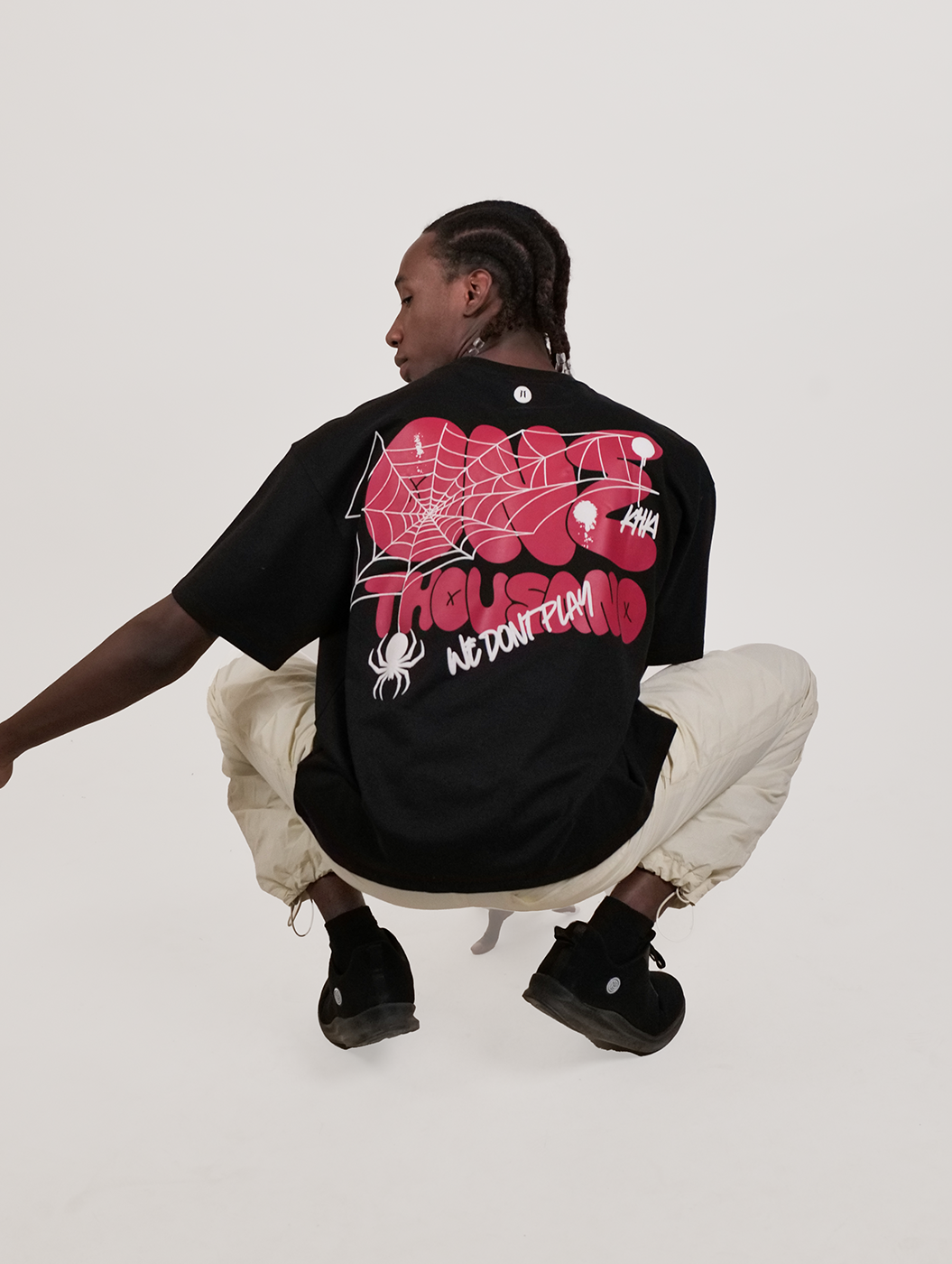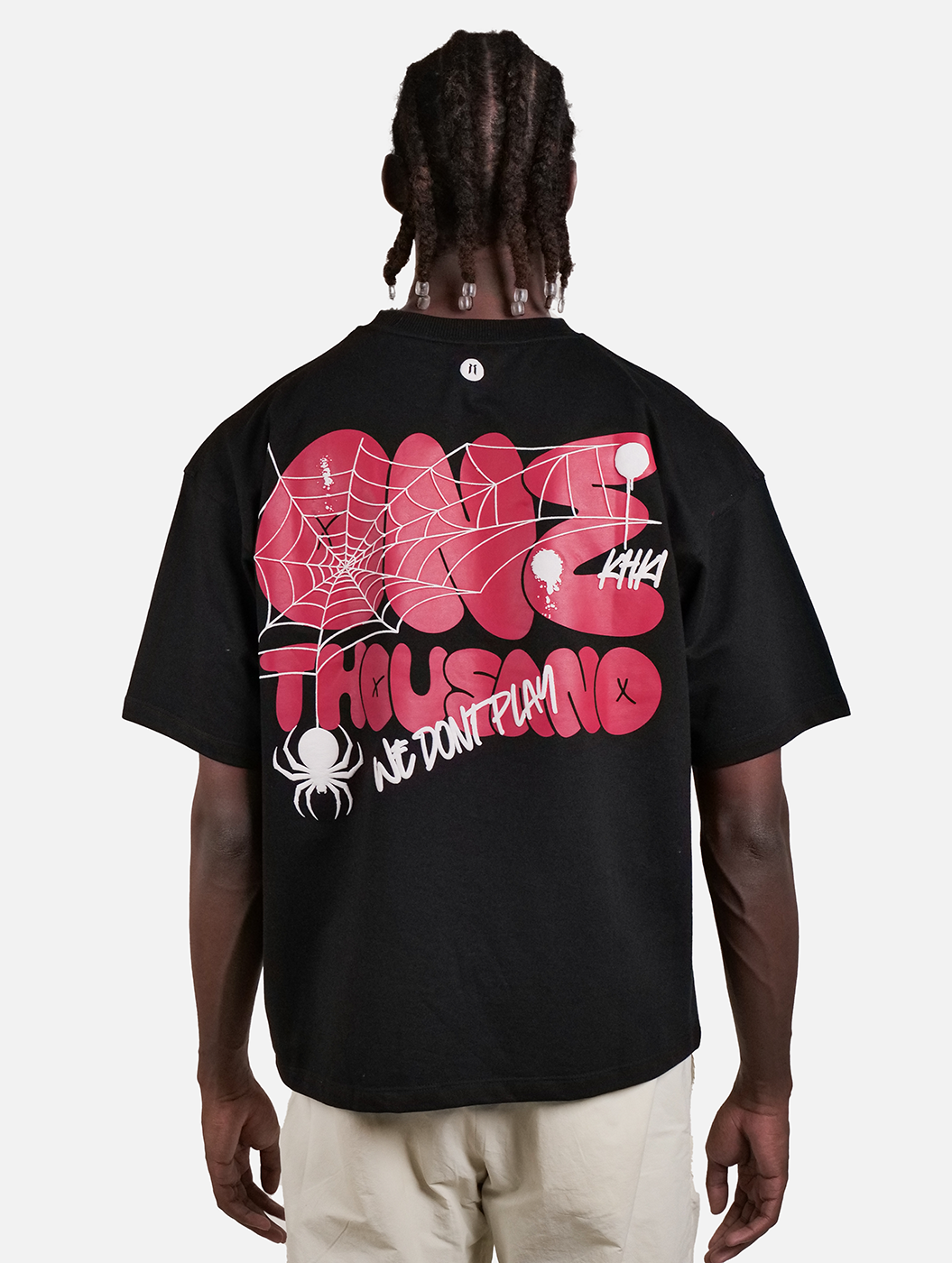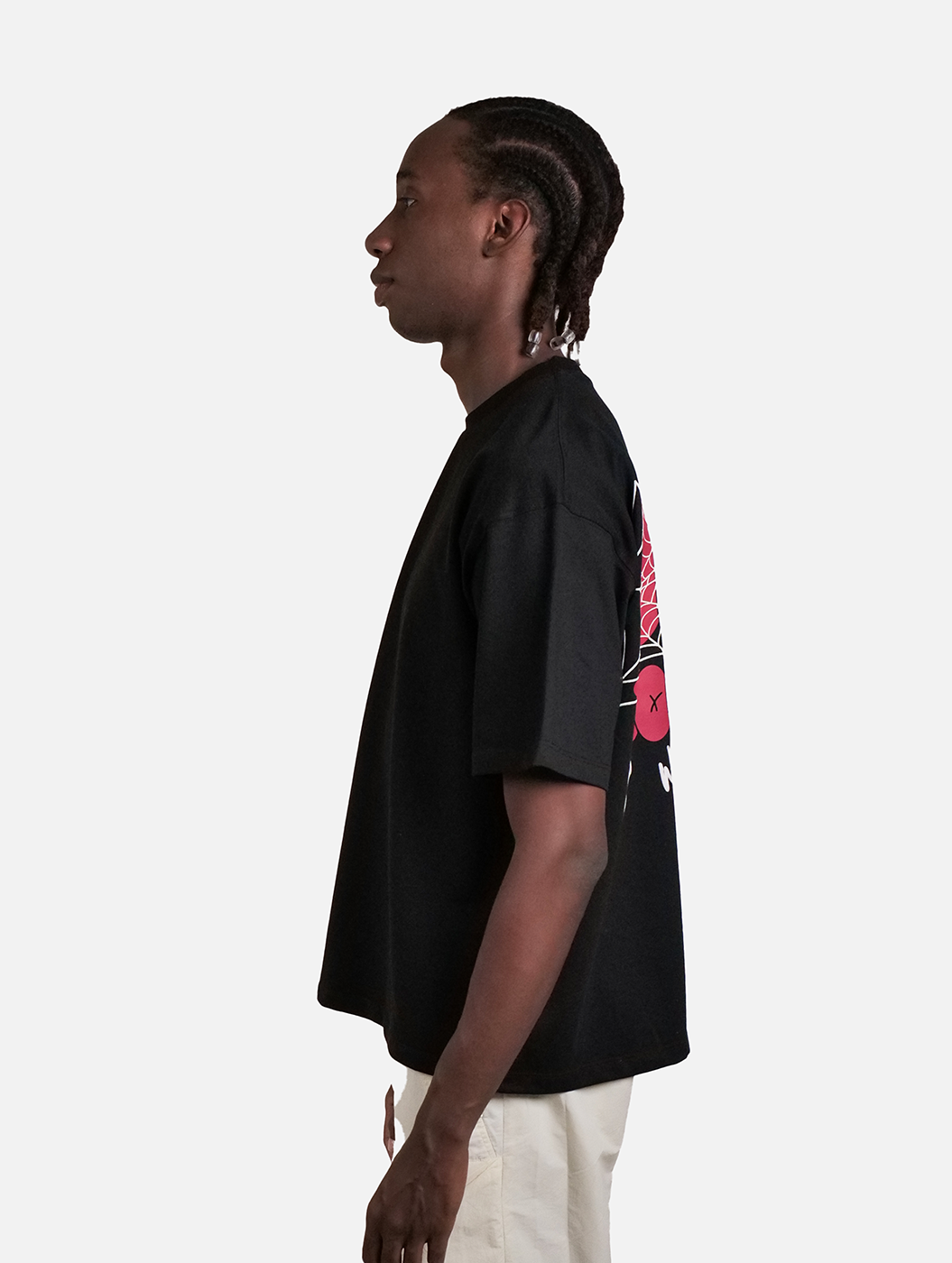 Presenting our oversized round-neck T-shirt with a striking spider web puff screen print on the back that adds an intriguing edge. Crafted from soft loop-knit terry, it provides a cozy feel and relaxed fit. Perfect for casual hangouts or lounging at home, this versatile piece effortlessly blends comfort and style for any laid-back occasion.