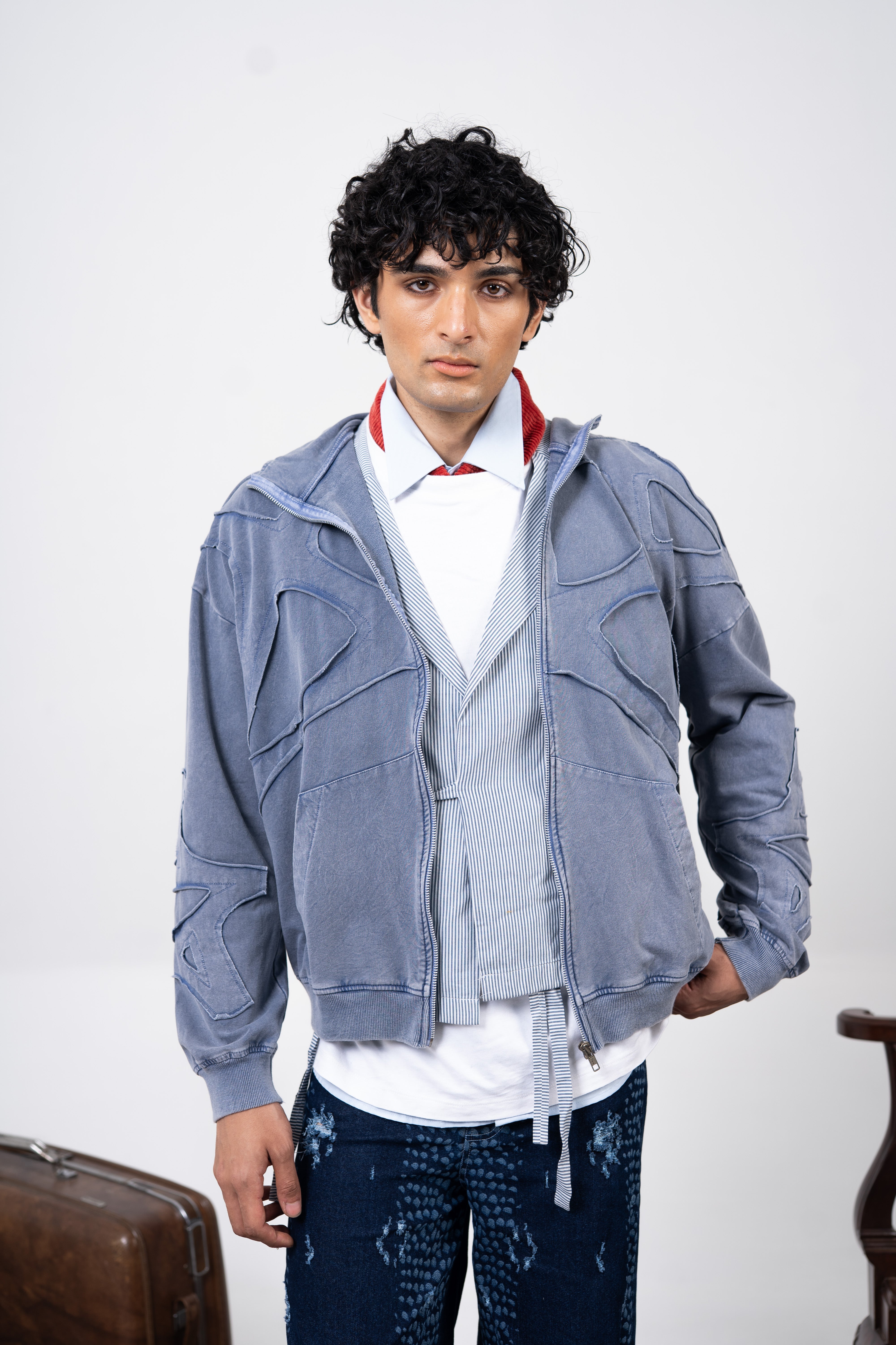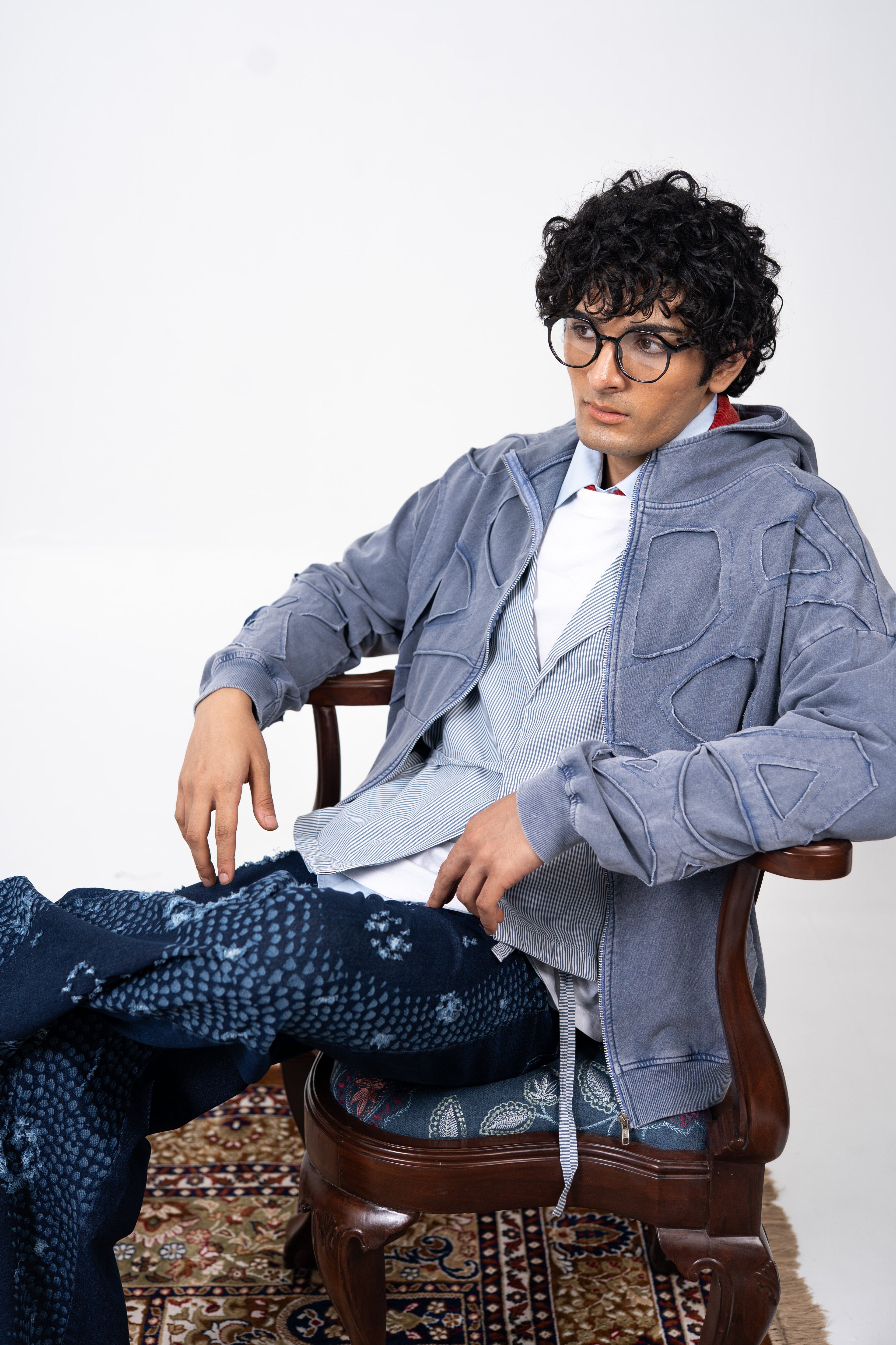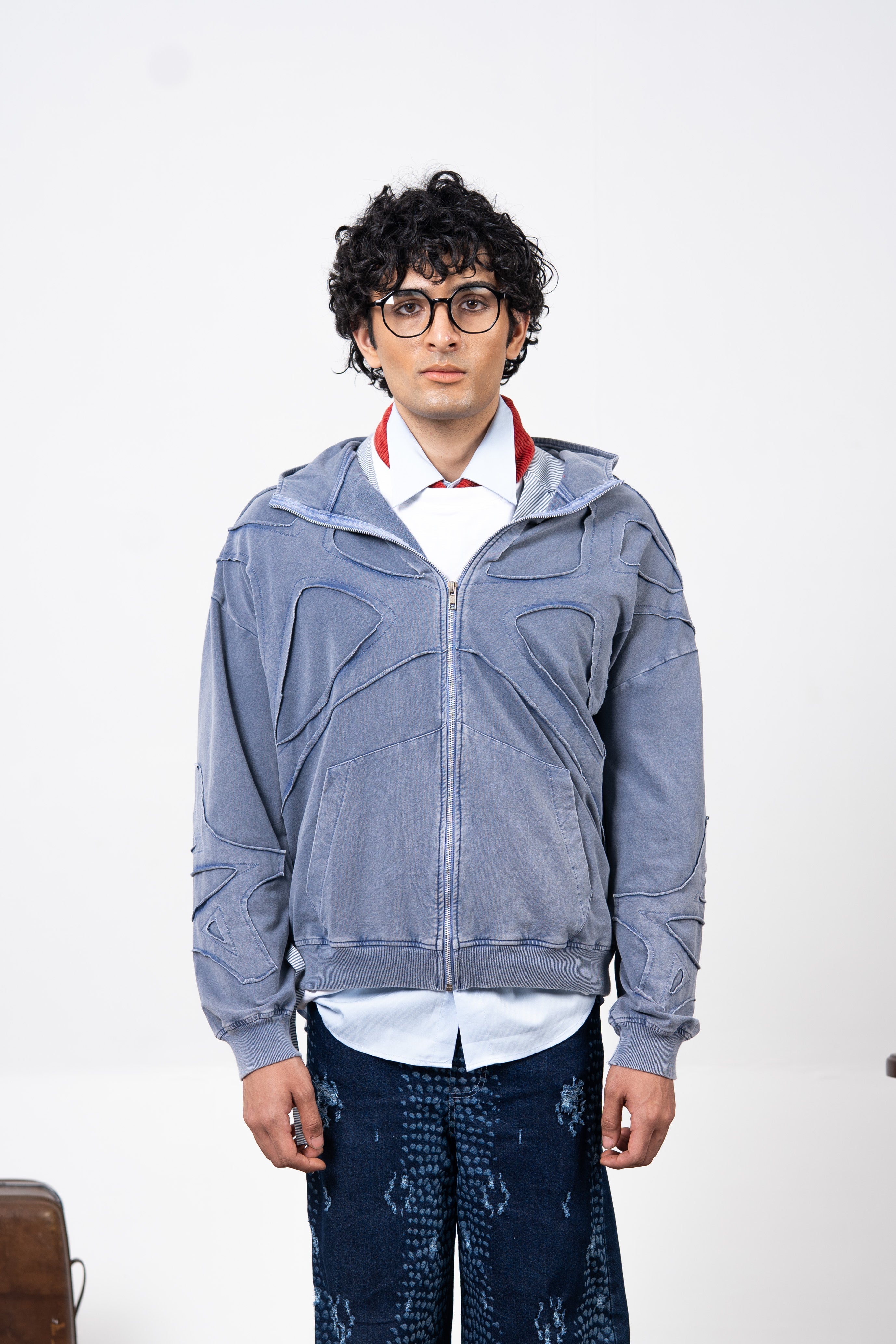 Inspired by the Nine of Pentacles and the freeform nature of the collection, this hoodie features precisely placed star-shaped patches on the centre and sleeves, rendered in a subtle blue-grey acid wash to symbolise abundance in simplicity. <p>Crafted in soft cotton terry lycra, it pairs structure with ease, complete with a hood, a functional front zipper, and a kangaroo patch pocket. A piece that carries quiet confidence, blending symbolic detail with everyday comfort.</p>