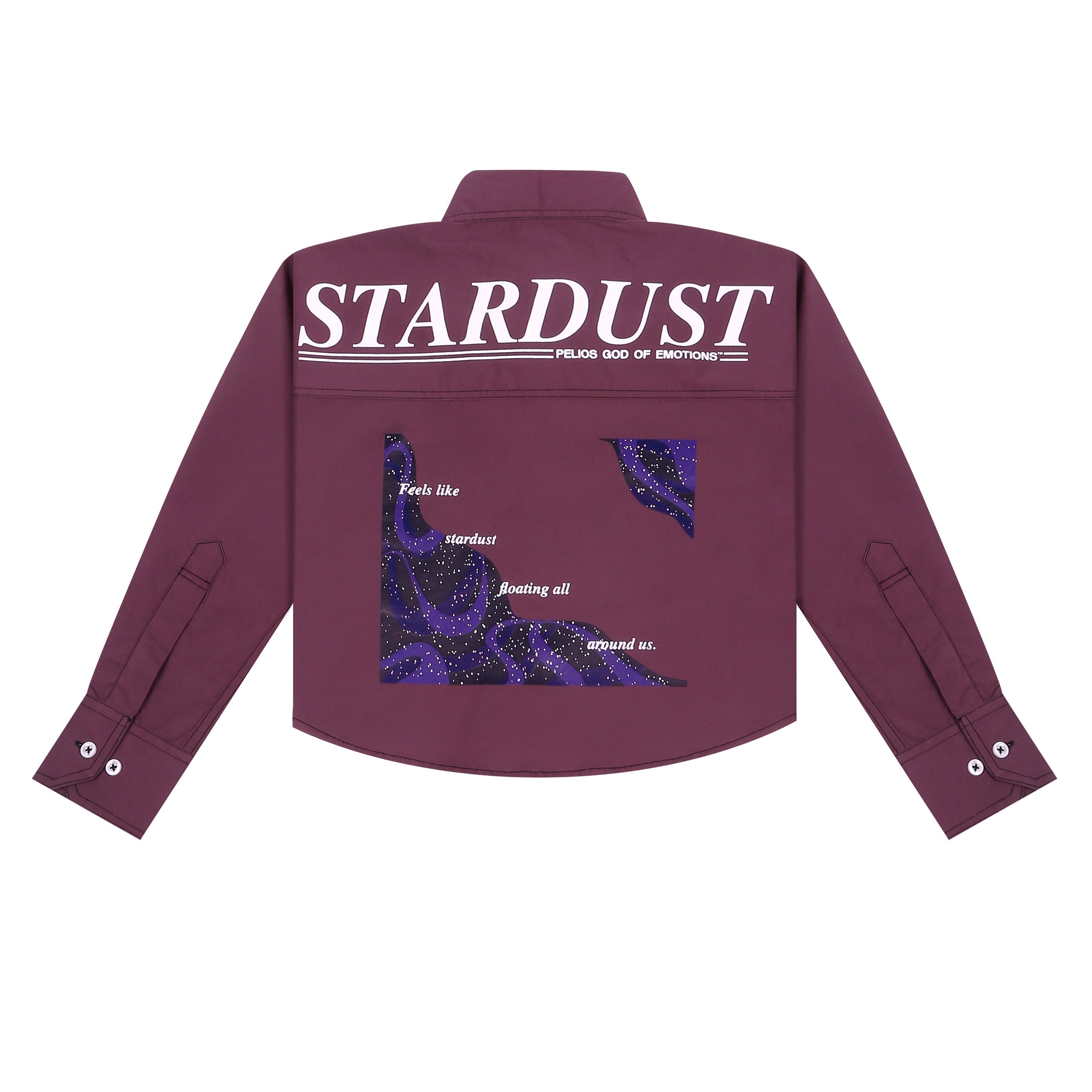 A CROPPED-FIT, CONCEPTUAL SHIRT DESIGNED TO BE WORN AS AN OVERSHIRT OR A STANDALONE PIECE. CRAFTED FROM PREMIUM COTTON POPLIN TWILL, IT FEATURES A GRAPHIC PRINT OF A STARRY SKY ON THE BACK, REFLECTING THE MAGIC OF THE COSMOS.