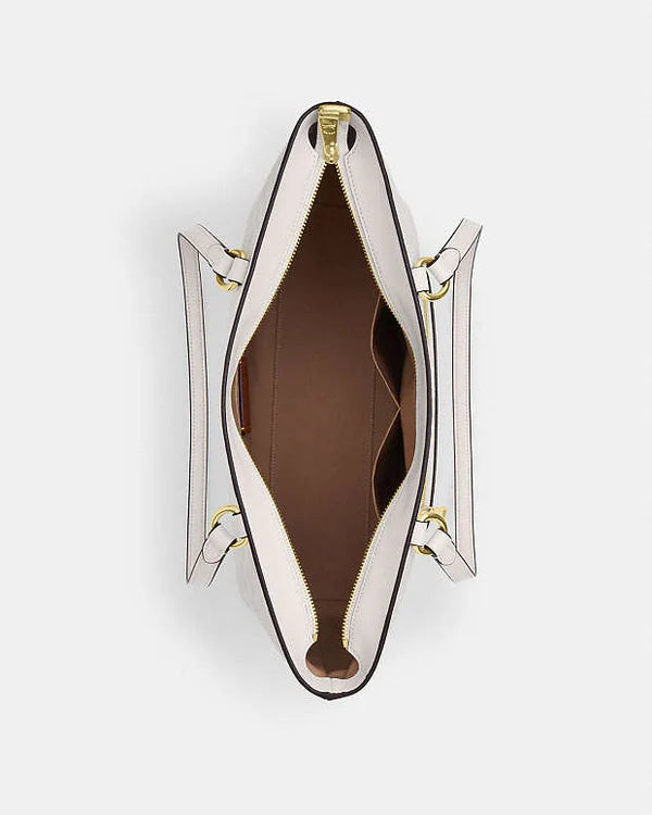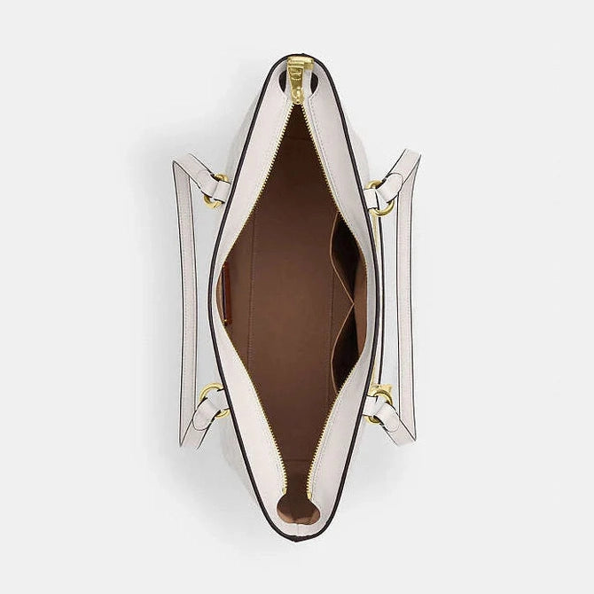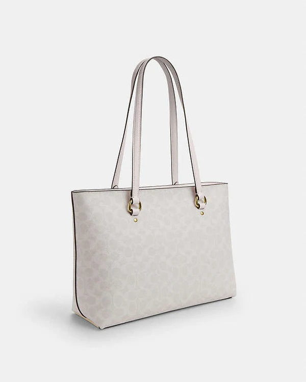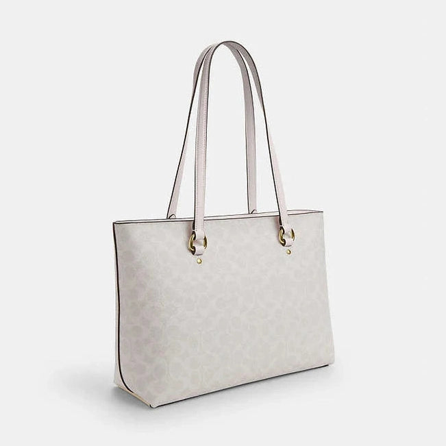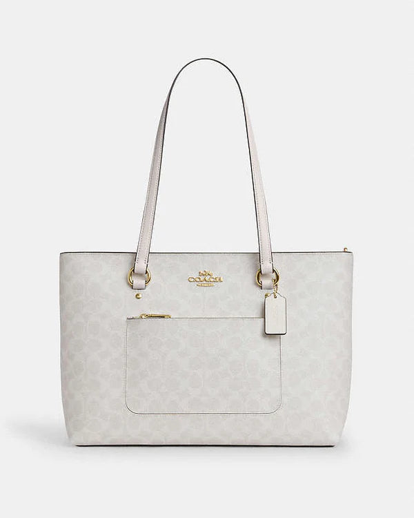The Coach Station Tote Bag in Signature Canvas Gold-White Chalk features the brand’s iconic canvas in a refined, light color palette. Crafted for durability and style, this tote provides ample space for your essentials, complemented by sturdy handles for comfortable carrying. Its elegant design perfectly suits both professional environments and sophisticated casual occasions, combining timeless appeal with practical functionality.