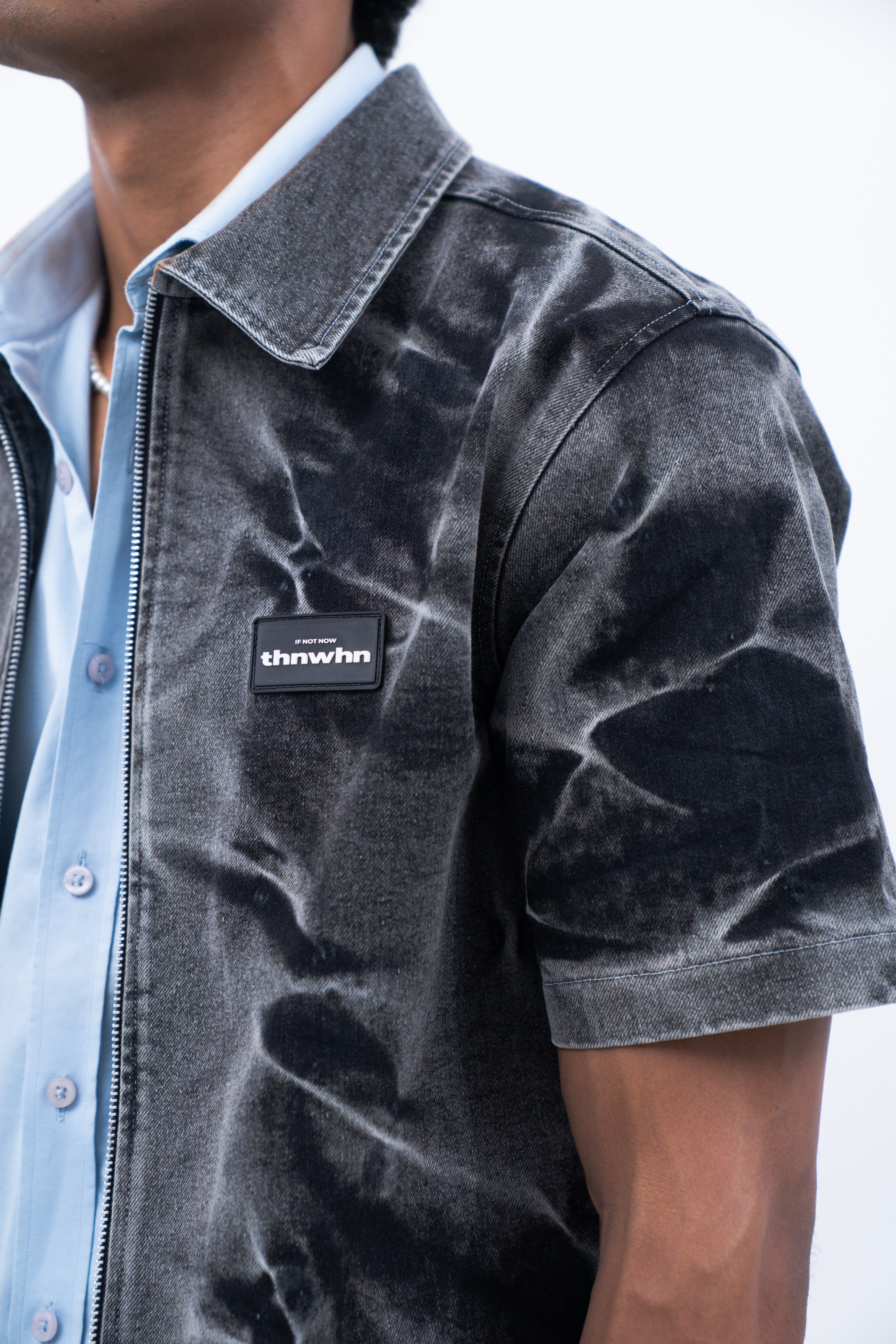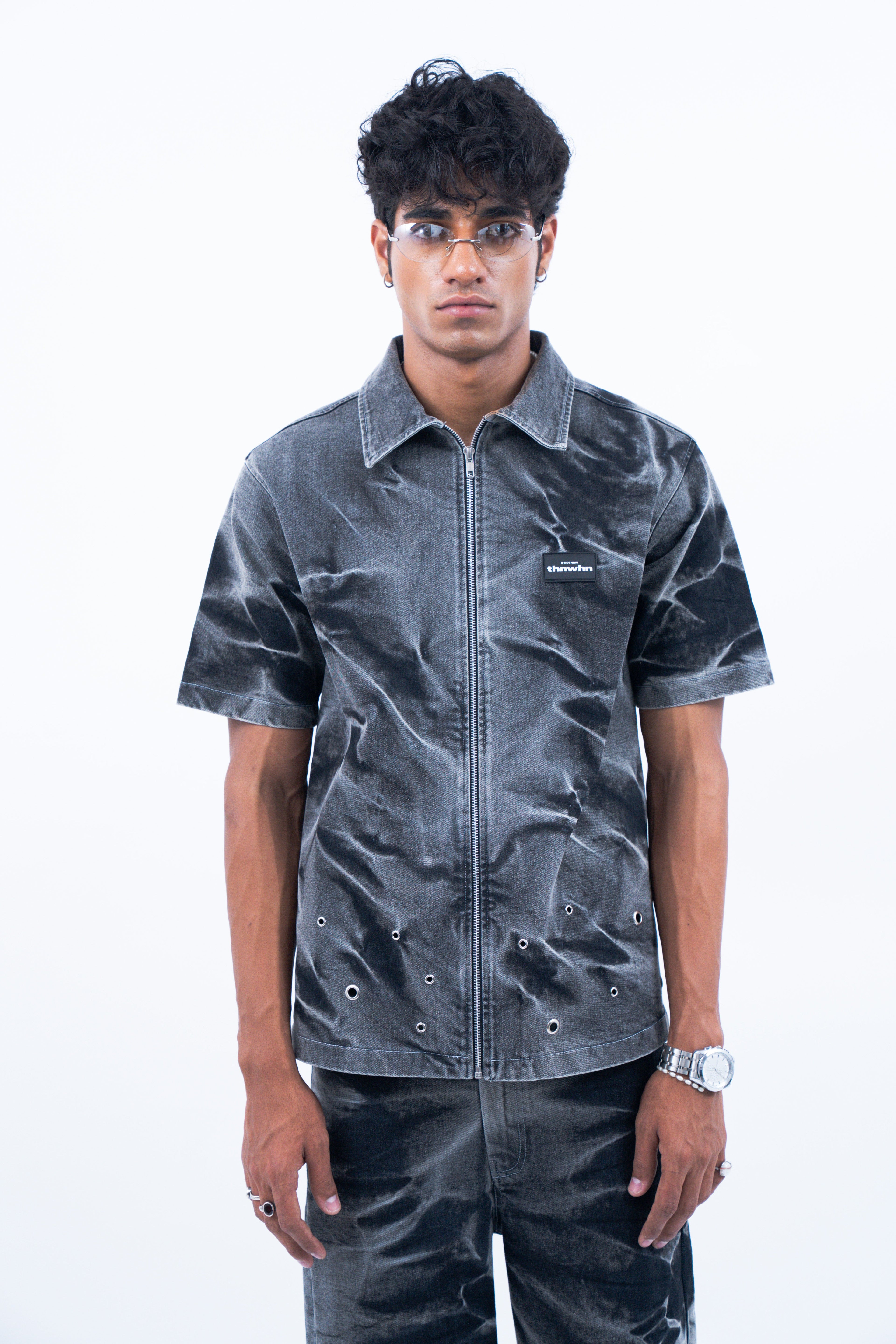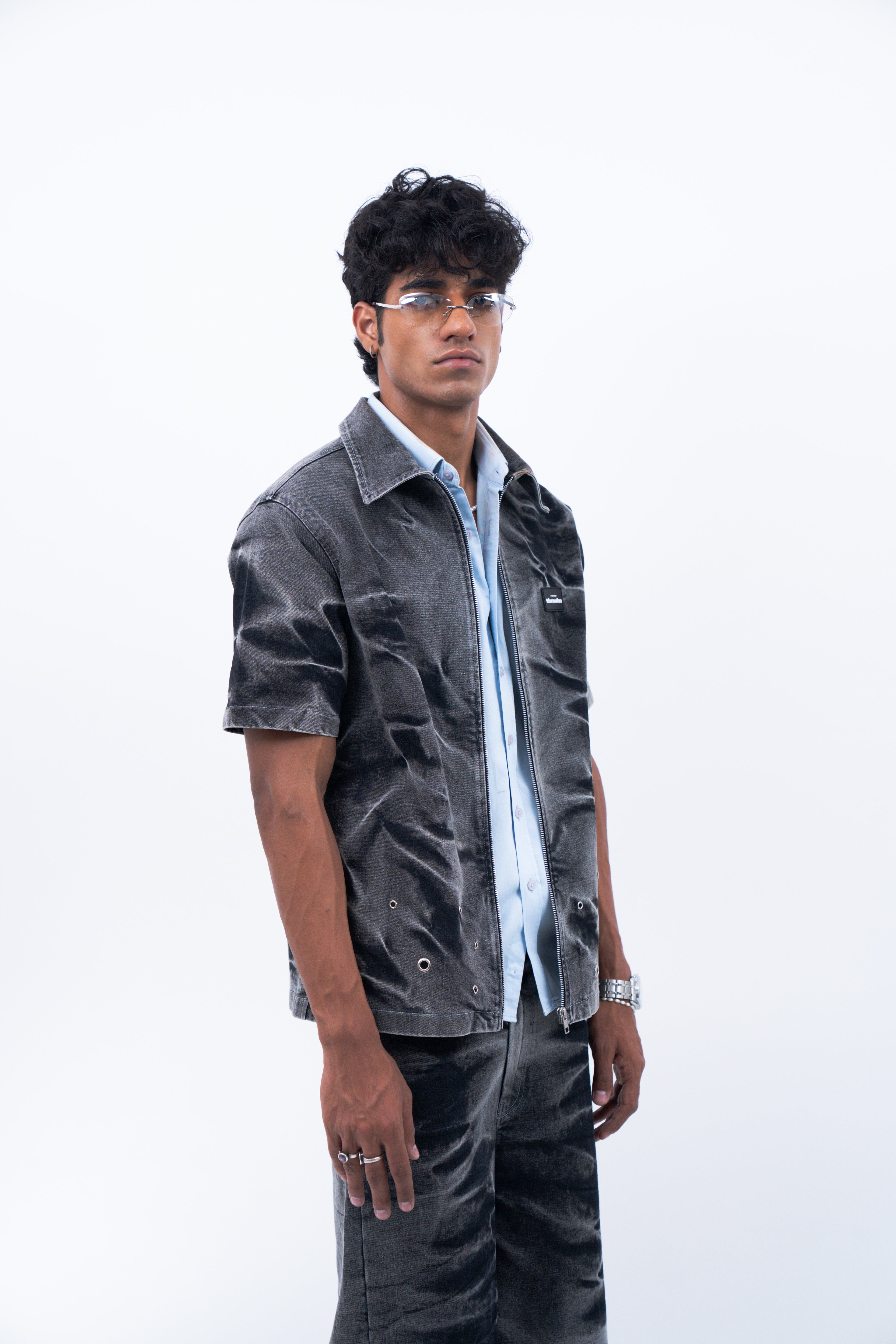 Crafted in premium black denim, this half sleeve shirt features an all-over riveting wash that gives it a stormy effect inspired from the feeling of a storm trying to blow us apart. Further the shirt is enhanced by the varying silver eyelet details emerging from the hem symbolising bullet holes and hardships. It is finished with a metallic zip closure at the front.