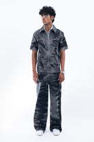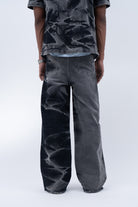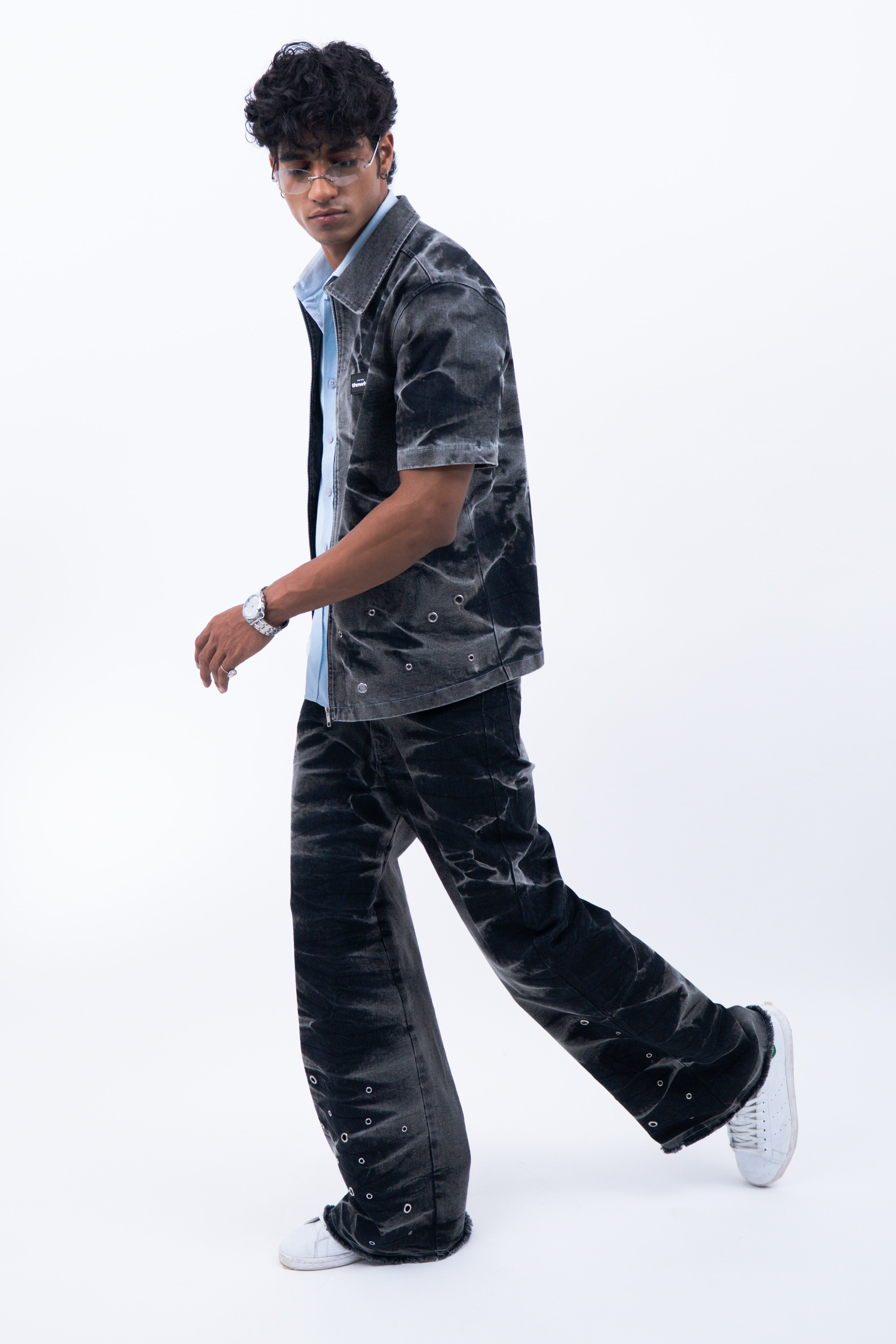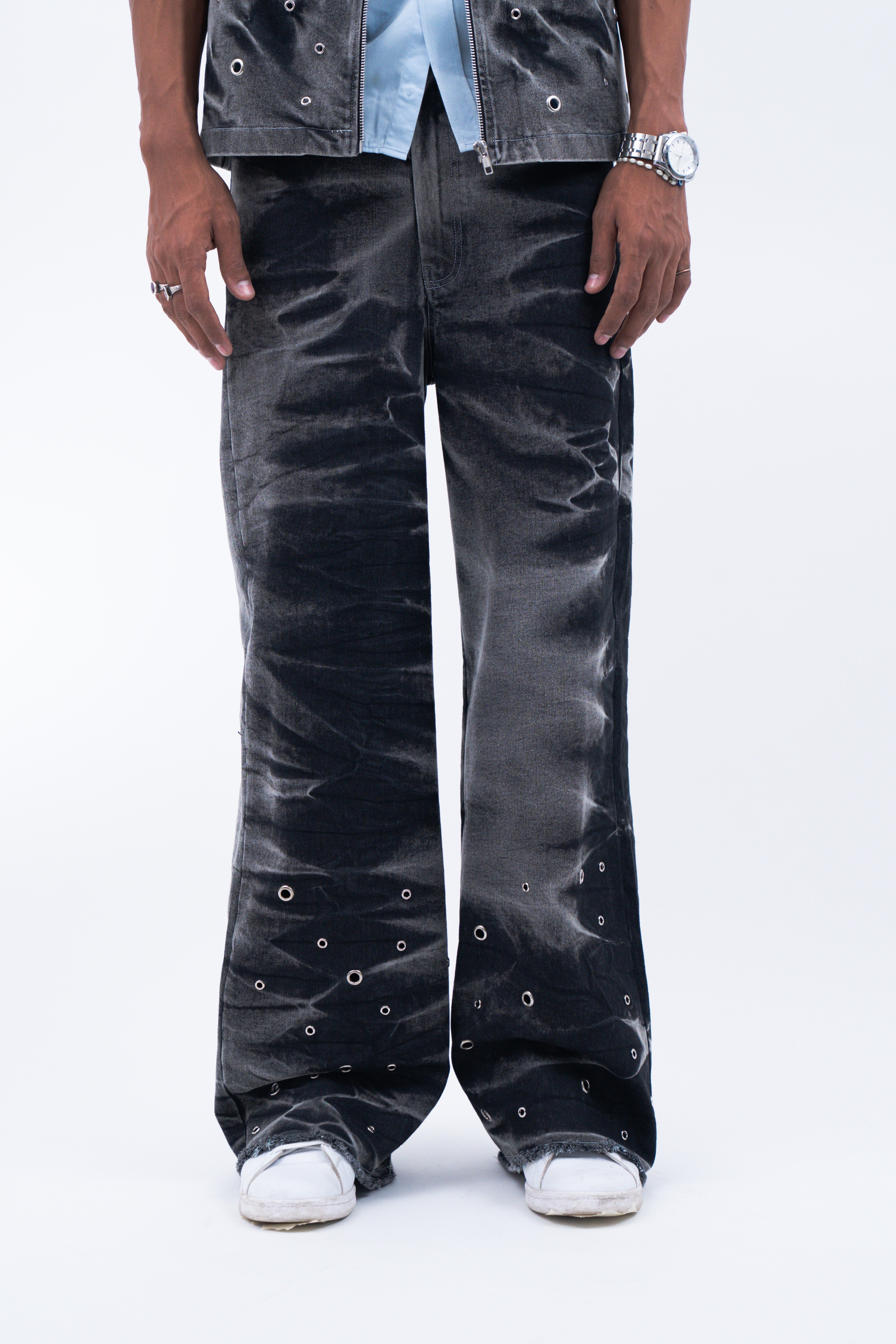 Crafted from premium black denim, this pant features a riveting wash along the sides that gives it a stormy effect inspired from the feeling of a storm trying to blow us apart. Further the pants are enhanced by the varying silver eyelet details emerging from the hem symbolising the bullet holes. For utility and functionality, this pant features two front and two back pockets.