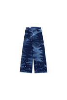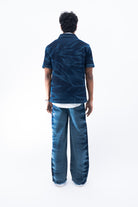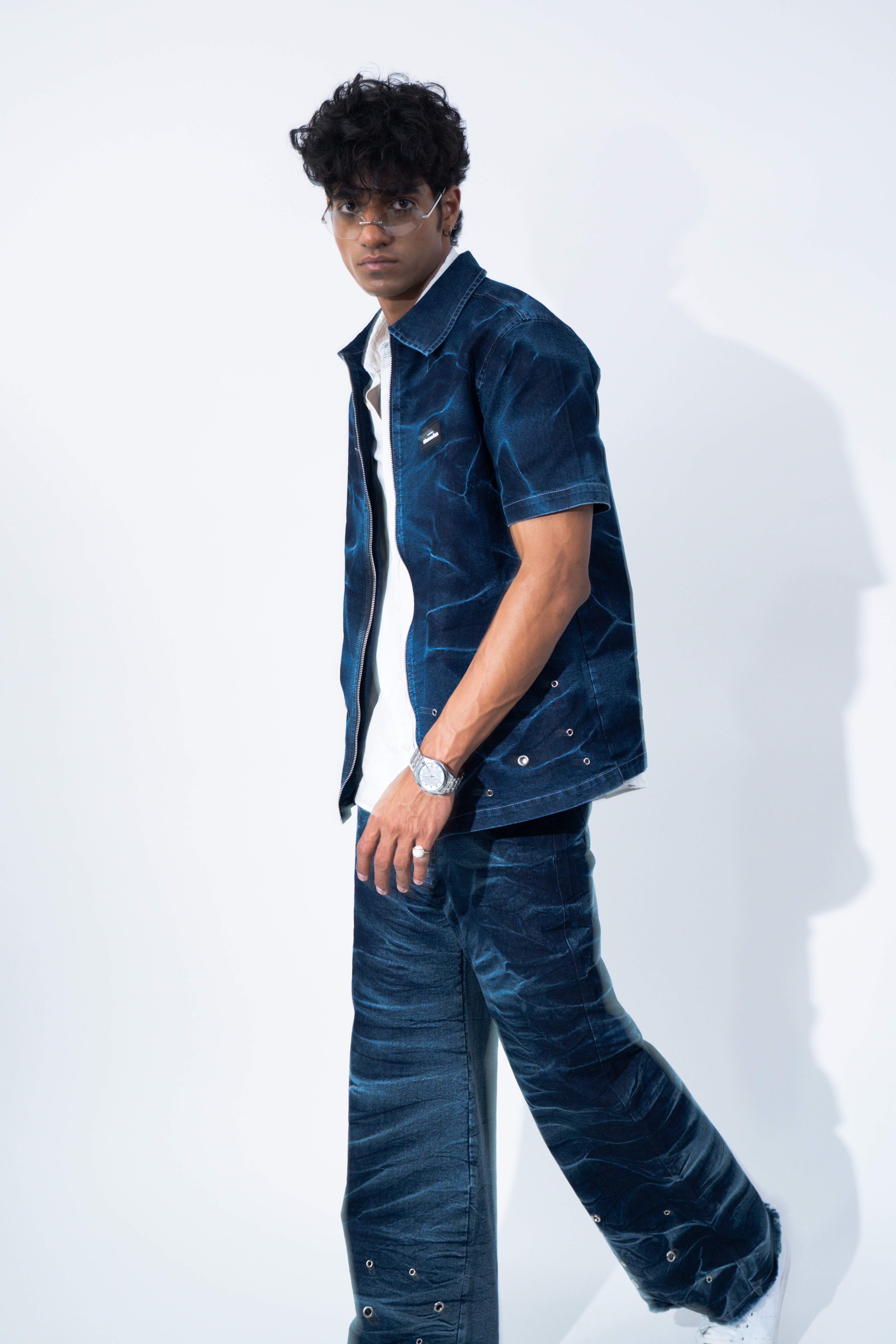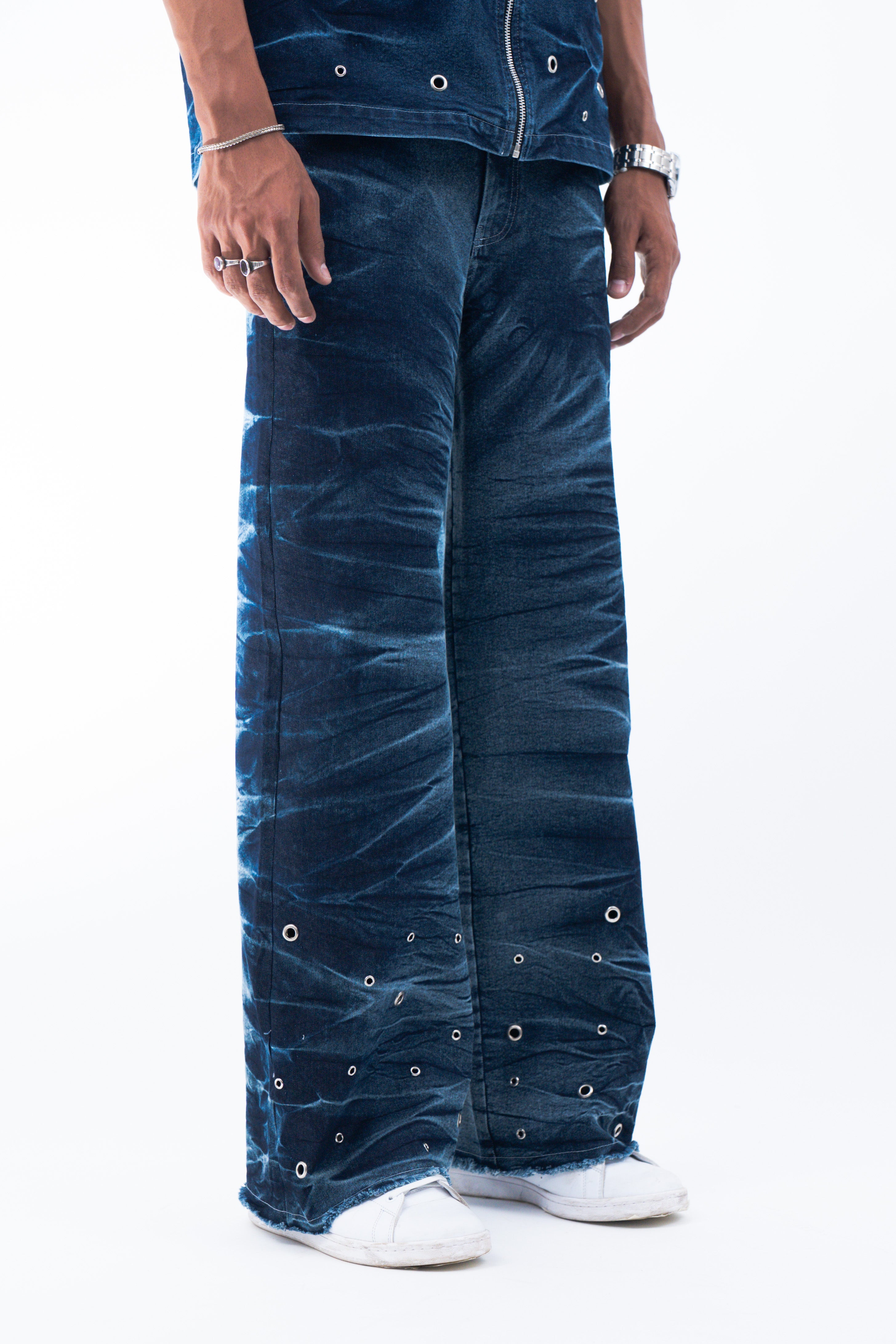 Crafted from premium blue denim, this pant features a riveting wash along the sides that gives it a stormy effect inspired from the feeling of a storm trying to blow us apart. Further the pants are enhanced by the varying silver eyelet details emerging from the hem symbolising the bullet holes and hardships faced. For utility and functionality, this pant features two front and two back pockets.