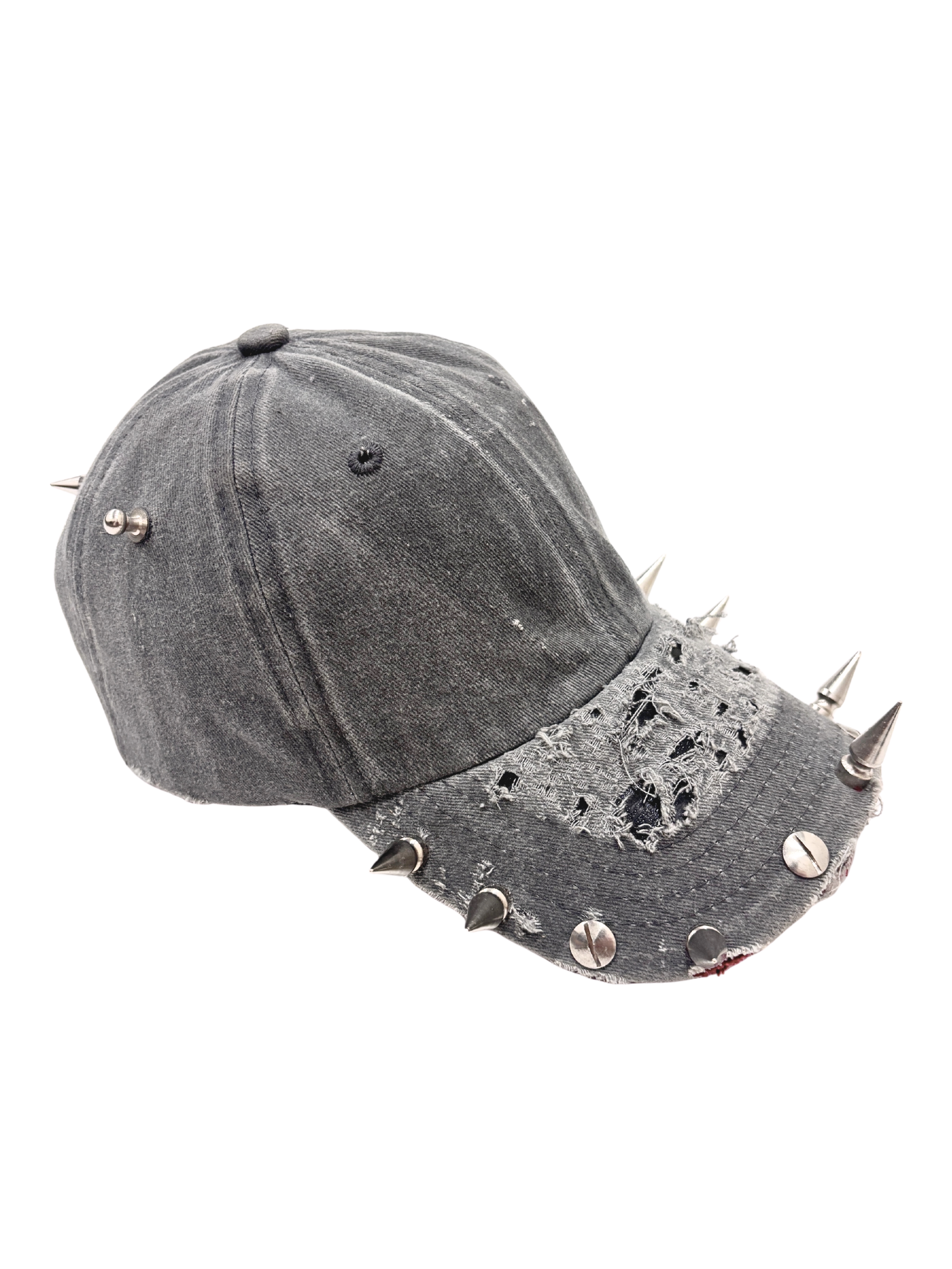 Not fashion—protection. This cap is torn, riveted, and spiked into existence like urban battle gear. Every scar and every piece of hardware adds weight to its story, turning denim into defense. One-of-one and built for rebels who turn the streets into their battleground.