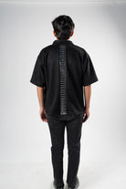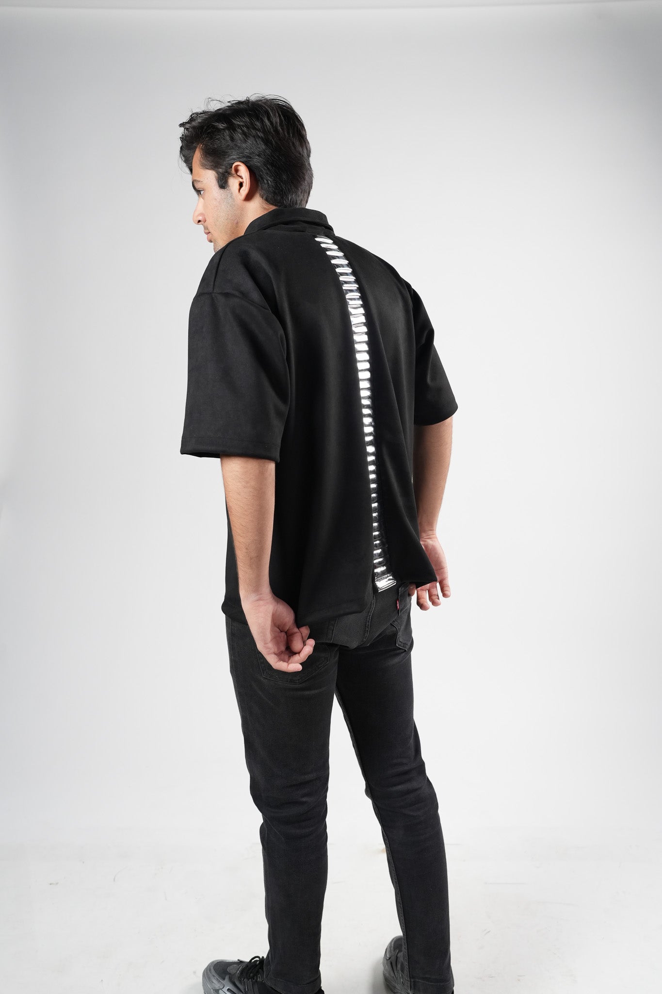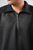 Crafted from soft vegan suede, Kreflct’s Suede Spinal Polo stands out with silver leather pleats that run straight down the back - a unique feature that adds structure. It features a clean zip-up front and a sharp collar, and the relaxed fit makes it comfortable while still looking polished. Best worn with tailored cargos or structured bottoms when you want a look that's intentional.