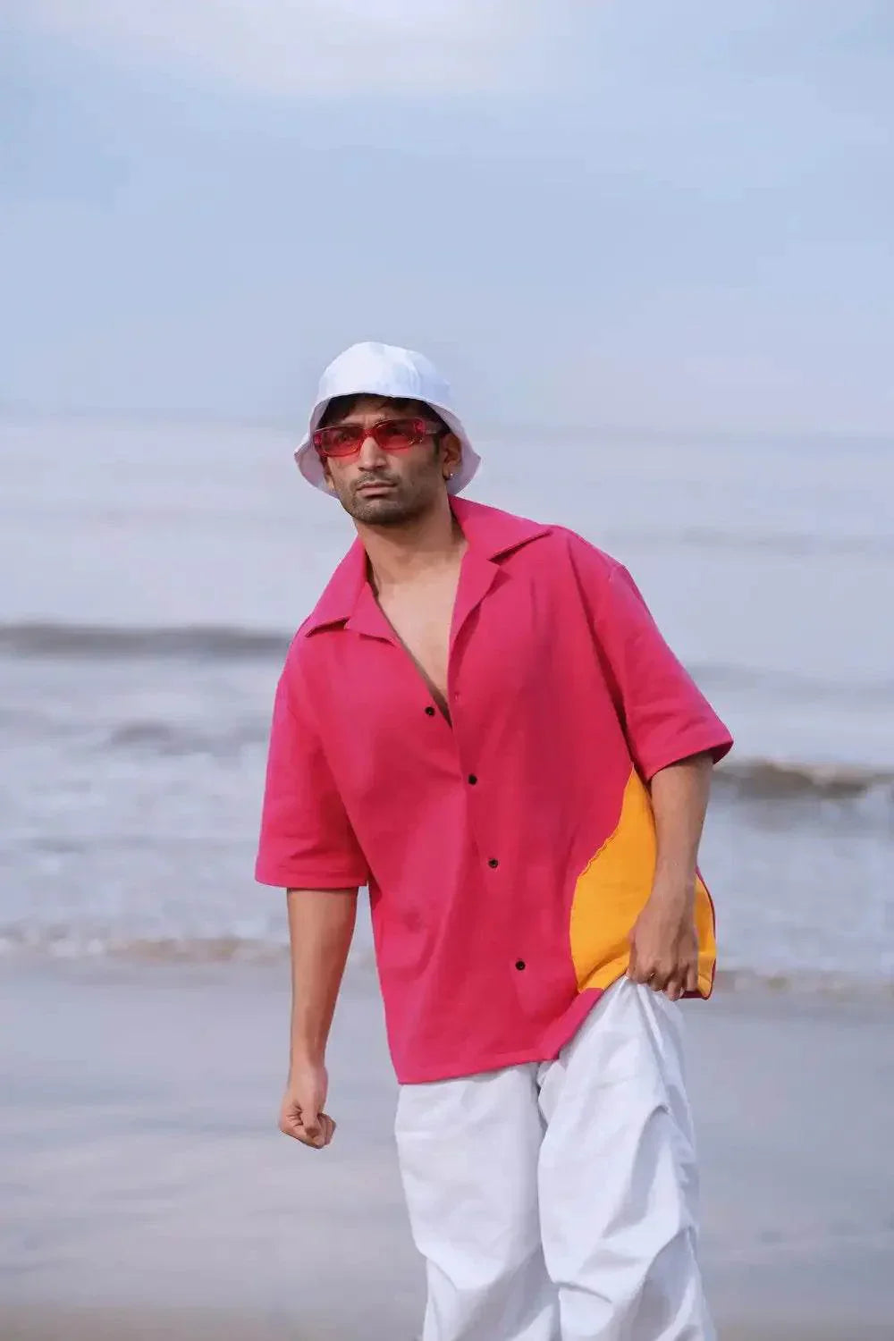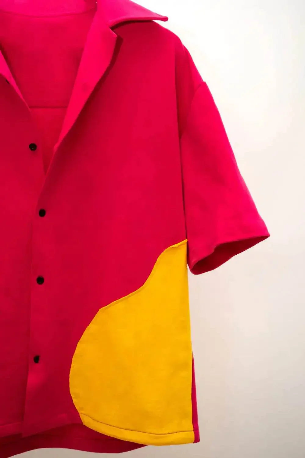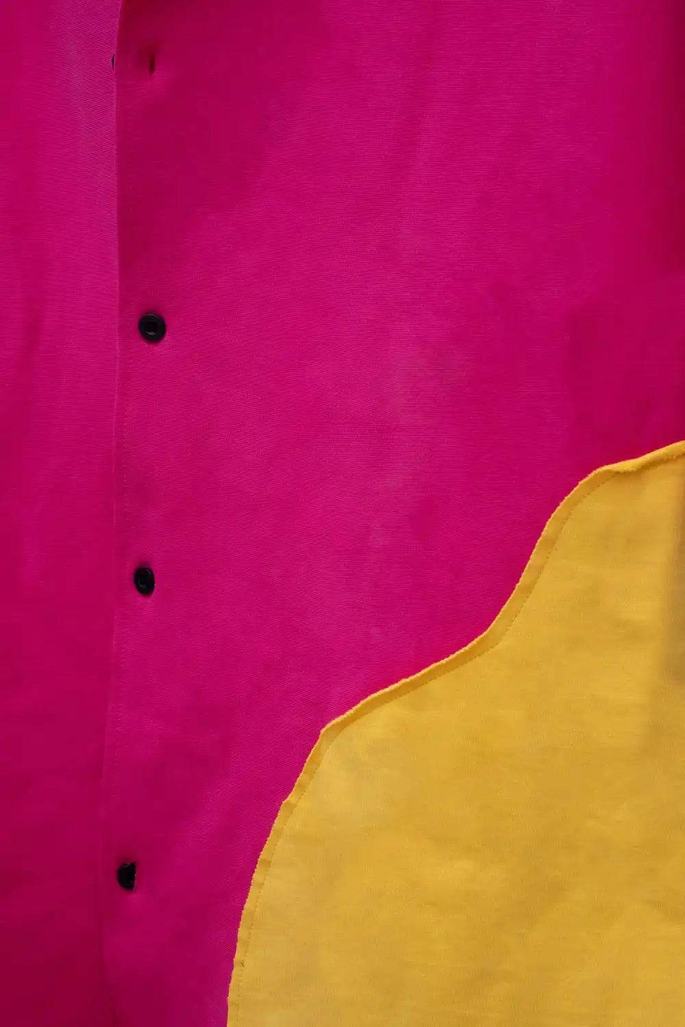 The Overshirt is the go-to for your energetic summers. The shirt is made out of high-quality fabric in a hot pink shade with contrasting patchwork that slices diagonally across the bottom half of the front, creating an eye-catching design. The back consists of a RESA brand tag placed horizontally below the neck.