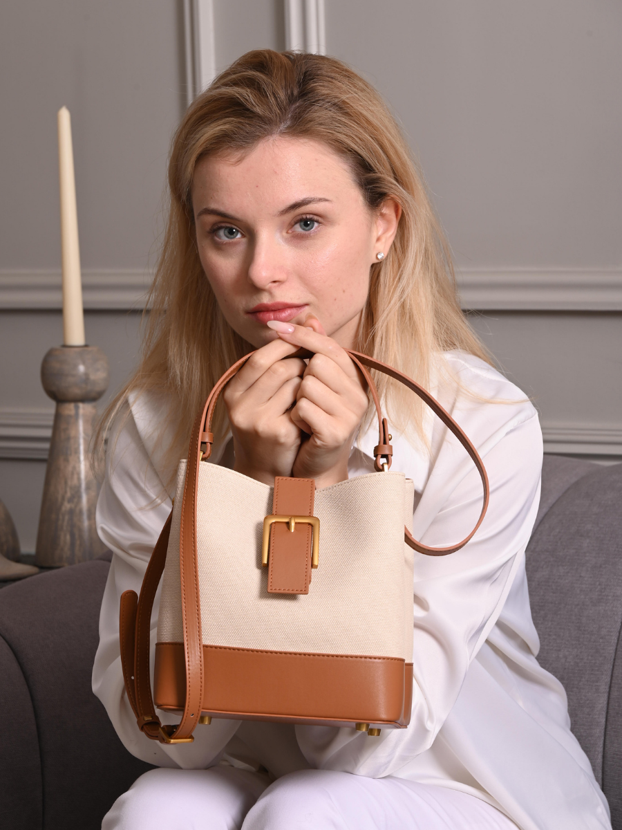 Elevate your style with our Elegant Ladies Bucket Bag, Sylvia crafted from fine two-layer leather. Designed to blend sophistication with functionality, this bag features: