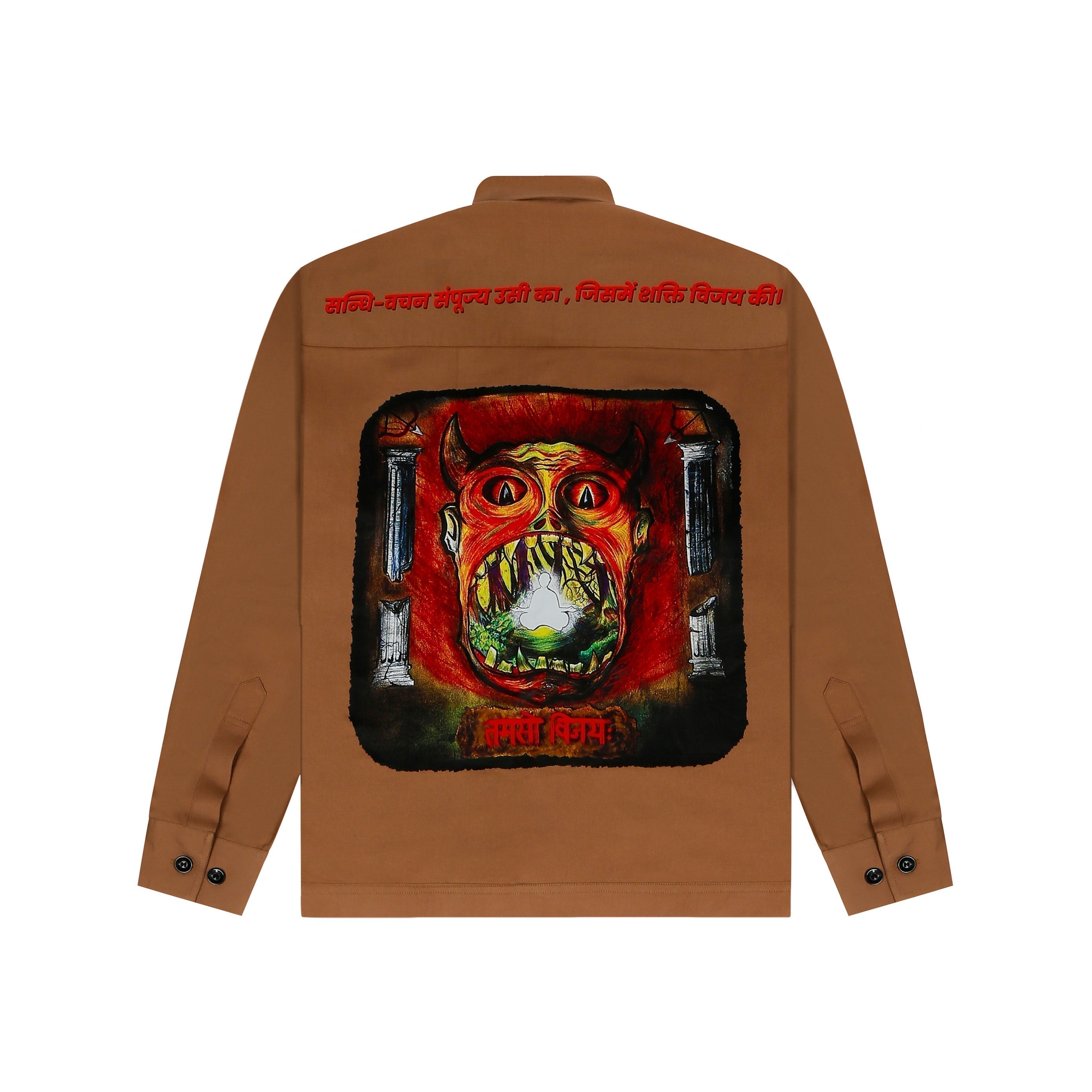 IN PALE KHAKI COTTON, THE TAMASO VIJAYA OVERSHIRT NARRATES A BATTLE BEYOND THE PHYSICAL. THE ARTWORK DEPICTS A BETAL DEMON’S FACE HIDDEN IN A FOREST, SYMBOLISING THE SHADOWS OF HATRED AND SOCIAL HOSTILITY.