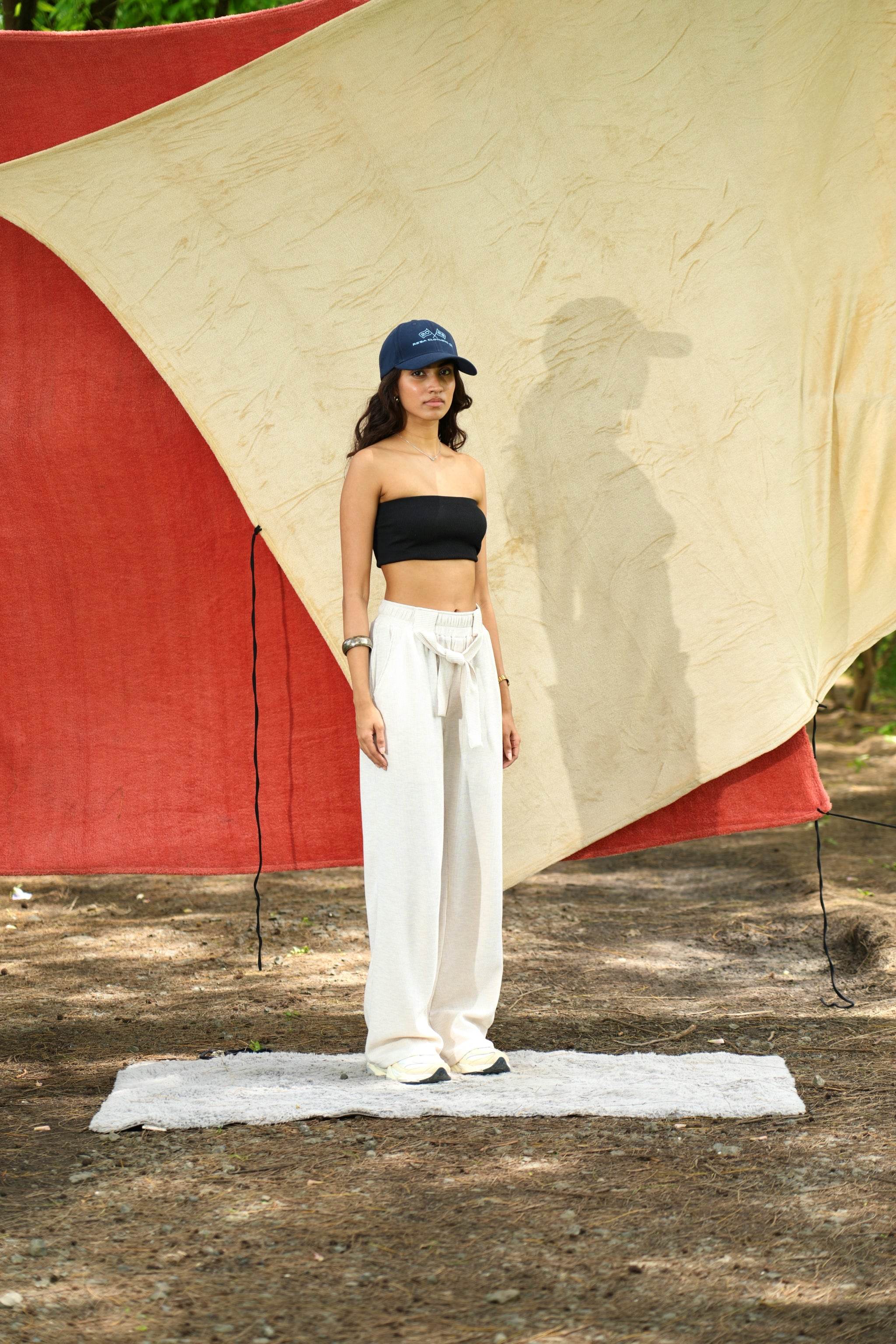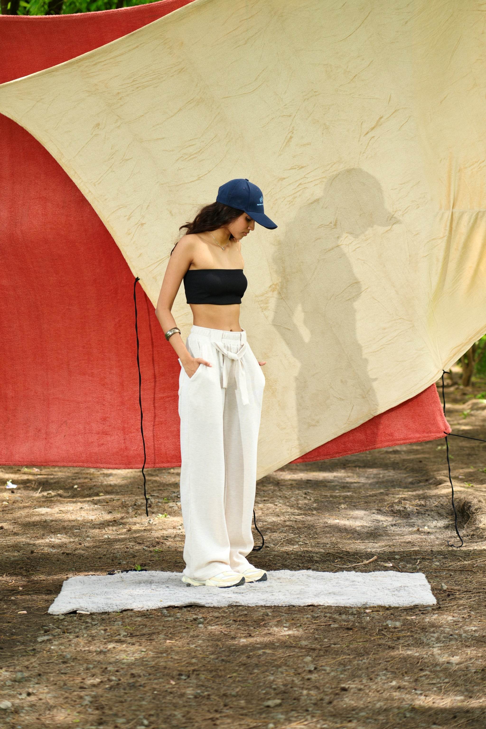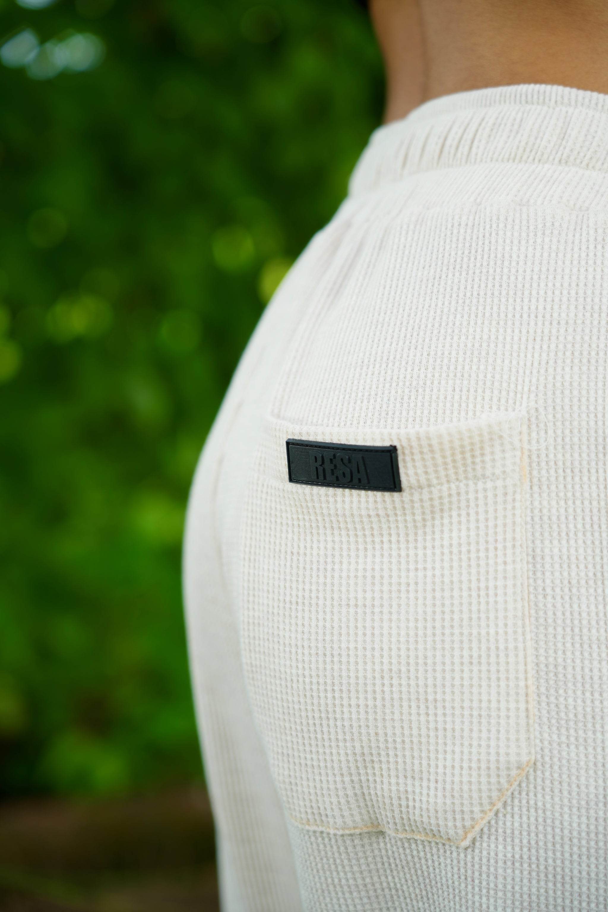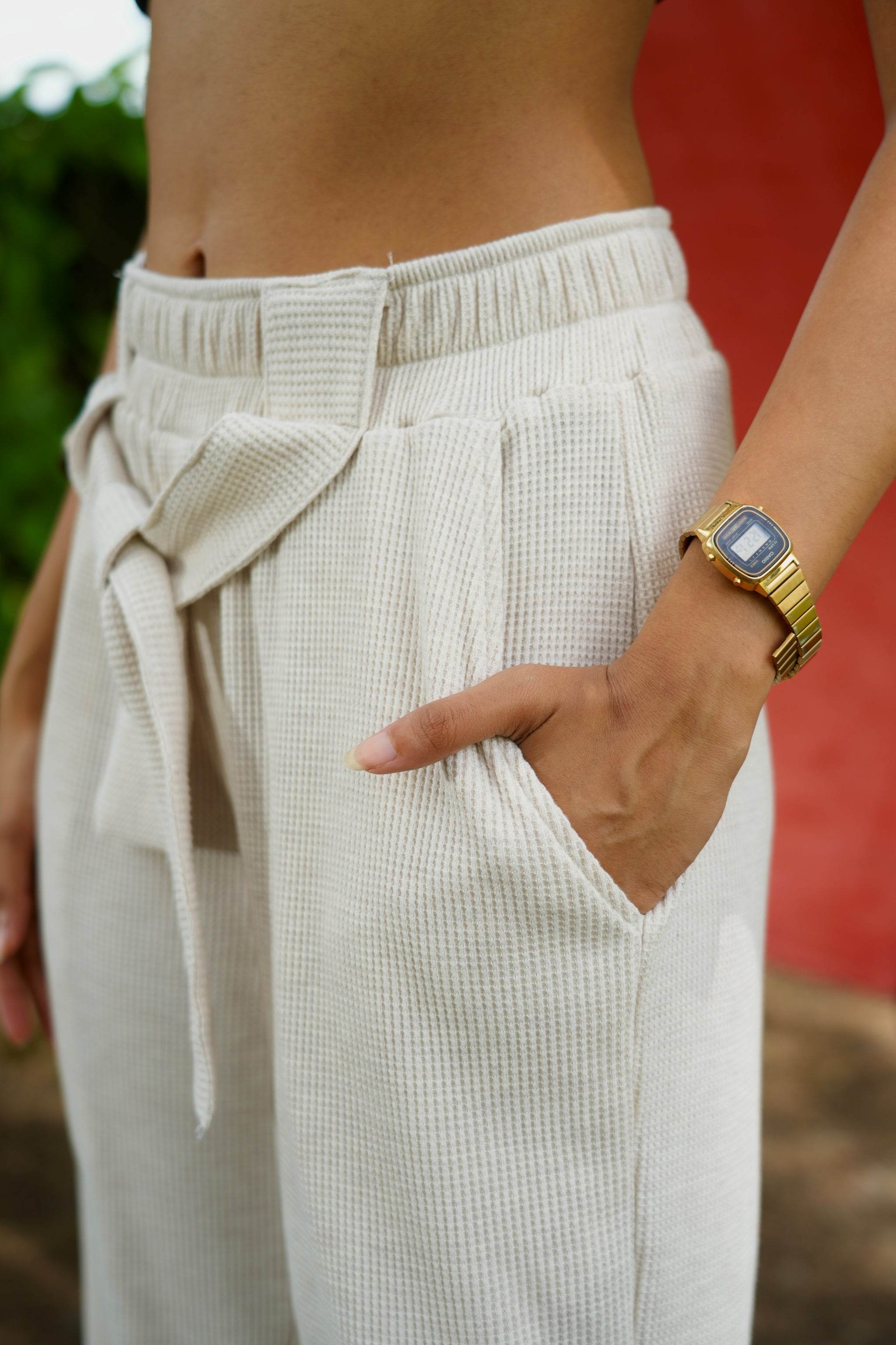 Designed in an elegant off-white hue, this piece is crafted from textured waffle knit fabric, offering a refined drape and a straight fit. There are two dummy broad strings stitched to the front belt that adds to the lounge look. Its rich fabric and understated silhouette make it a timeless addition to any collection.